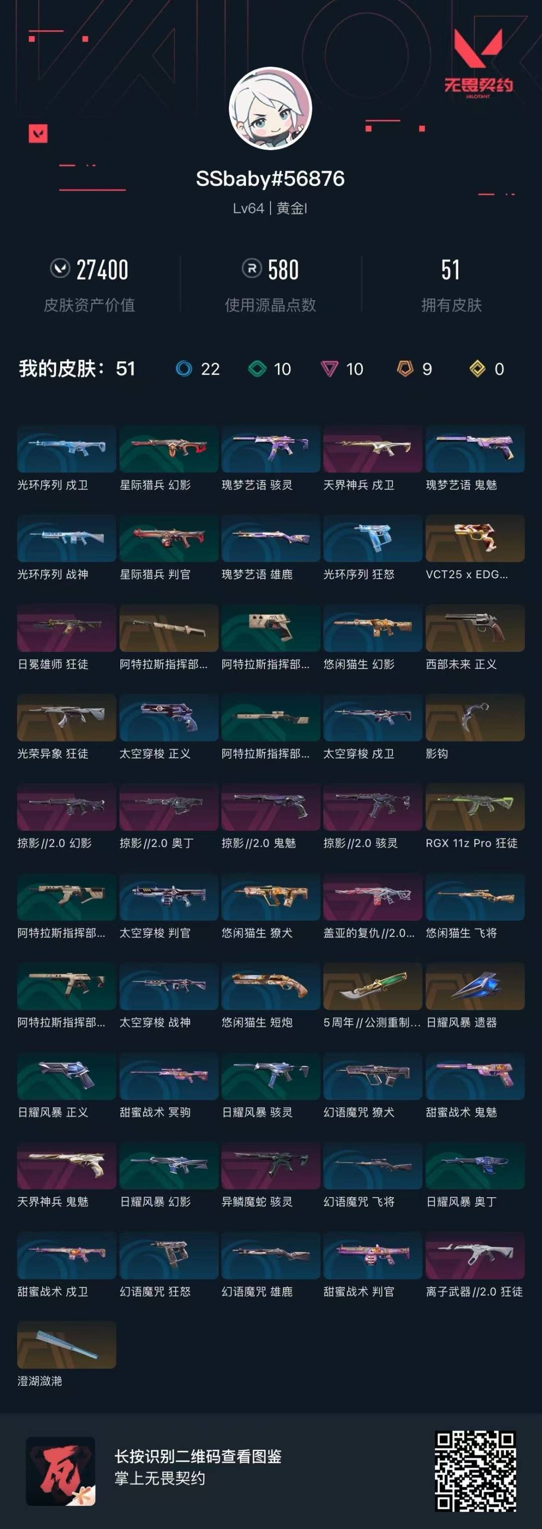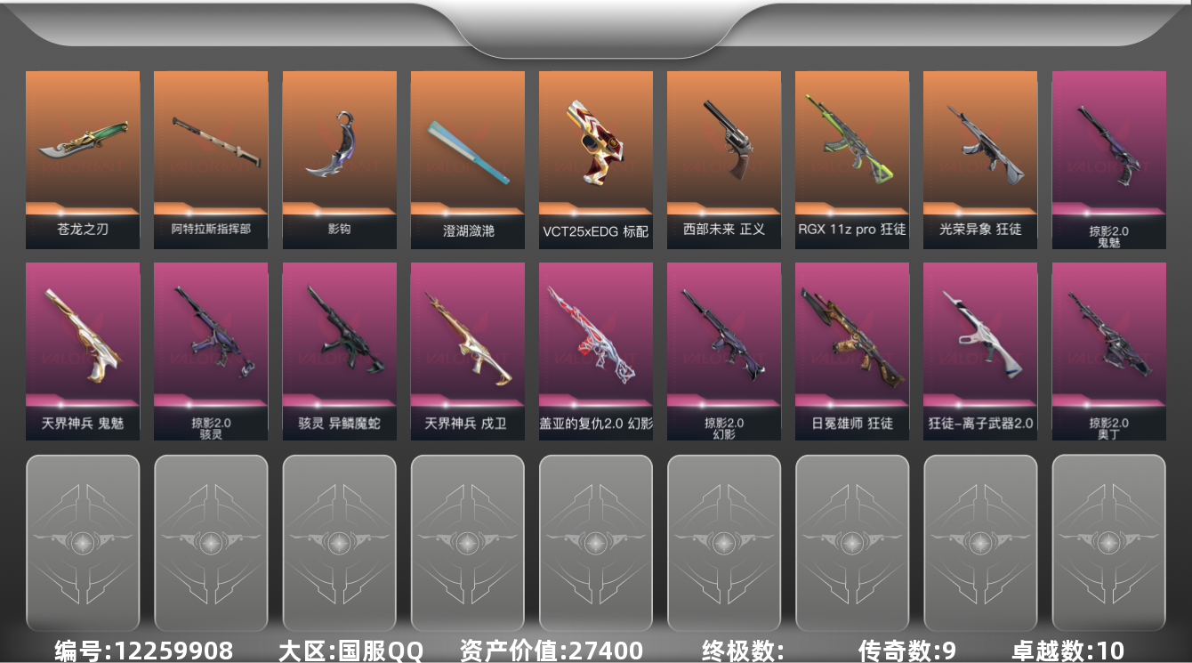 [12259908]9橙皮 10紫皮 51皮肤 21英雄 68卡面 580已用源晶 黄金 优质装备:幻影-盖亚的复仇2.0,狂徒-日冕雄师,澄湖潋滟,鬼魅-天界神兵,戍卫-天界神兵,苍龙之刃,阿特拉斯指挥部,影钩 套装:掠影2.0套装 佩枪皮肤:标配-VCT25xEDG,鬼魅-掠影2.0,正义-西部未来 冲锋枪皮肤:骇灵-掠影2.0,骇灵-异鳞魔蛇 步枪皮肤:幻影-掠影2.0,狂徒-光荣异象,RGX 11z pro 狂徒,狂徒-离子武器2.0 机枪皮肤:奥丁-掠影2.0