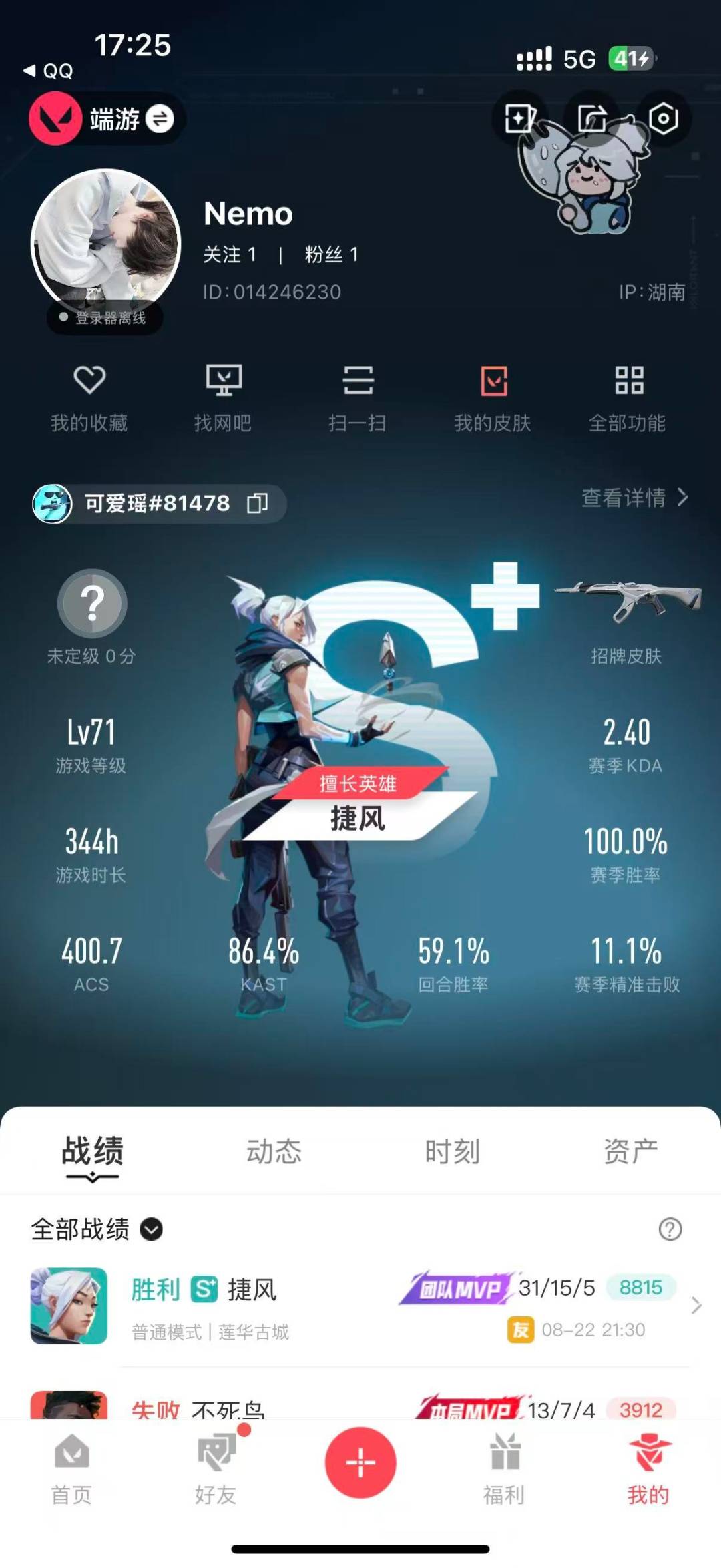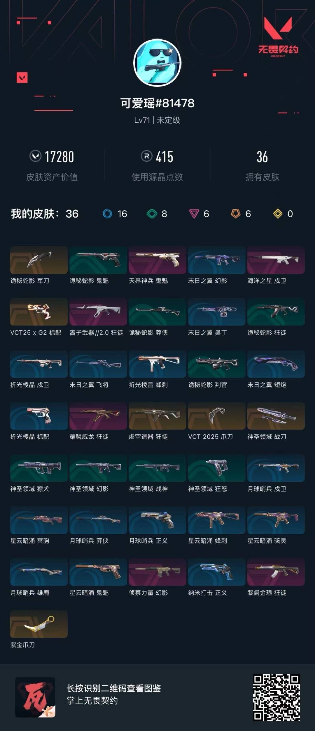 [12224989]6橙皮 6紫皮 36皮肤 17英雄 63卡面 415已用源晶 未定级 优质装备:狂徒-紫阙金琅,幻影-侦察力量,鬼魅-天界神兵,紫金爪刀,狂徒-耀鳞威龙,神圣领域 战刀,VCT 2025 爪刀,诡秘蛇影,戍卫-海洋之星 套装:VCT 2025赛季礼包,VCTCN2025套装 佩枪皮肤:标配-VCT25xG2 步枪皮肤:狂徒-虚空遗器,狂徒-离子武器2.0