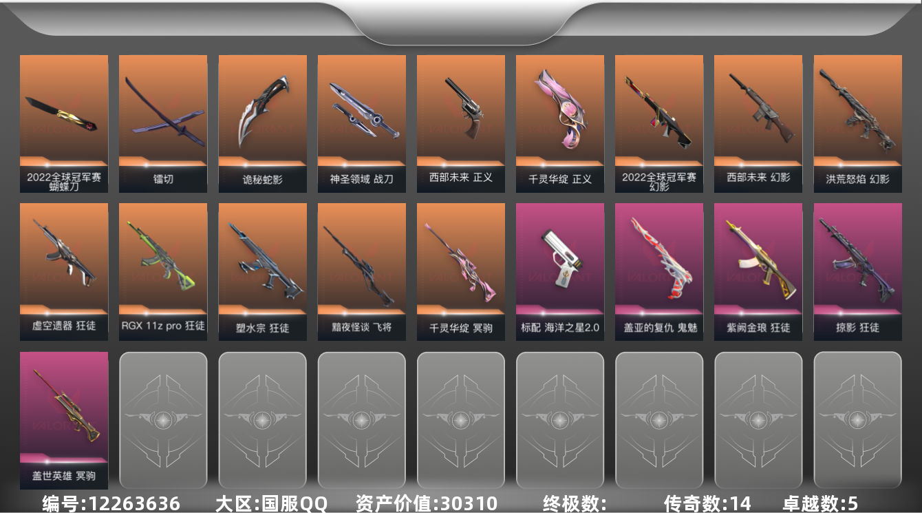 [12263636]14橙皮 5紫皮 51皮肤 17英雄 50卡面 510已用源晶 未定级 优质装备:狂徒-塑水宗,冥驹-千灵华绽,狂徒-掠影,狂徒-紫阙金琅,幻影-洪荒怒焰,正义-千灵华绽,鬼魅-盖亚的复仇,镭切,神圣领域 战刀,诡秘蛇影 亮点皮肤:幻影-2022全球冠军赛,2022全球冠军赛 蝴蝶刀 套装:2022全球冠军赛 佩枪皮肤:标配-海洋之星2.0,正义-西部未来 步枪皮肤:RGX 11z pro 狂徒,狂徒-虚空遗器,幻影-西部未来 狙击枪皮肤:飞将-黯夜怪谈,冥驹-盖世英雄