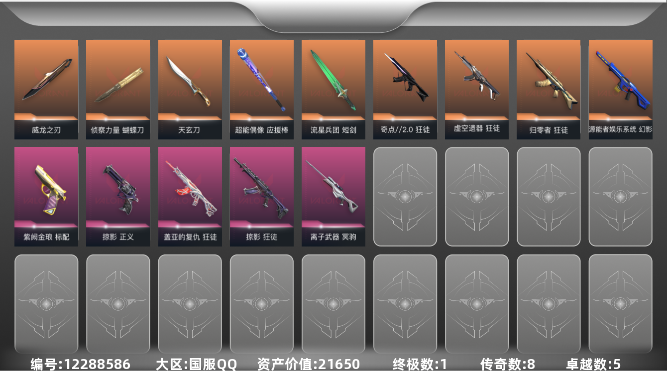 [12288586]8橙皮 1金皮 5紫皮 49皮肤 27英雄 93卡面 780已用源晶 未定级 优质装备:狂徒-归零者,幻影-源能者娱乐系统,狂徒-掠影,狂徒-盖亚的复仇,冥驹-离子武器,狂徒-奇点//2.0,正义-掠影,标配-紫阙金琅,蝴蝶刀-侦察力量,天玄刀,威龙之刃 步枪皮肤:狂徒-虚空遗器 近战武器皮肤:短剑-流星兵团,超能偶像 应援棒