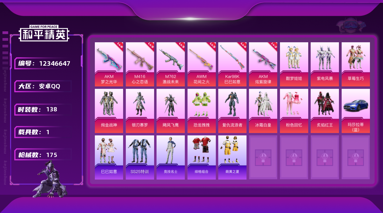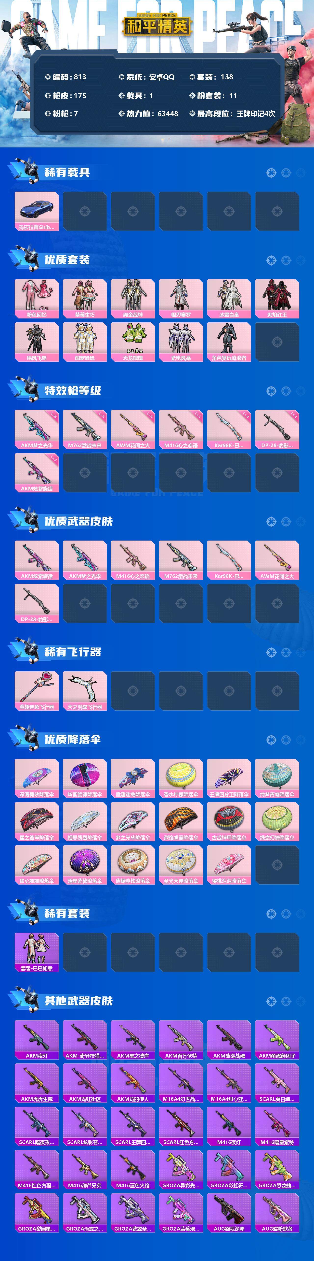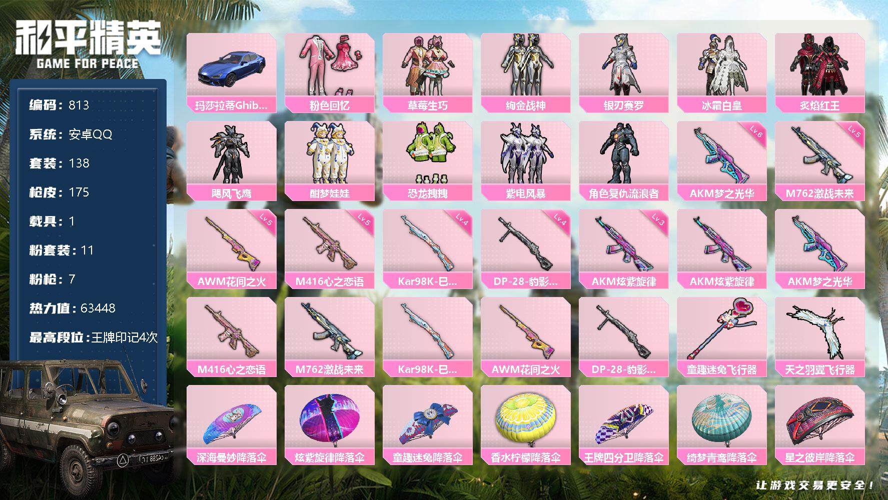 [12346647]【商品标题】:安卓 手Q-11粉装-7特效枪-1载具-2粉色飞行器-63448热力值-4王牌印记-138套装-175枪皮 【粉色载具】:玛莎拉蒂Ghibli(蓝) 【粉色套装】:粉装-粉色回忆,粉装-草莓生巧,粉装-绚金战神,粉装-银刃赛罗,粉装-冰霜白皇,粉装-炙焰红王,粉装-飓风飞鹰,粉装-酣梦娃娃,粉装-恐龙拽拽,粉装-紫电风暴,角色-复仇流浪者 【粉色枪皮等级】:AKM-炫紫旋律(三级),AKM-梦之光华(六级),M416-心之恋语(五级),M762-激战未来(五级),Kar98K-巳巳如意(四级),AWM-花间之火(五级),DP-28-豹影疾电(四级) 【粉色枪皮】:AKM-炫紫旋律,AKM-梦之光华,M416-心之恋语,M762-激战未来,Kar98K-巳巳如意,AWM-花间之火,DP-28-豹影疾电 【粉色飞行器】:童趣迷兔飞行器,天之羽翼飞行器 【粉色降落伞】:深海曼妙降落伞,炫紫旋律降落伞,童趣迷兔降落伞,香水柠檬降落伞,王牌四分卫降落伞,绮梦青鸾降落伞,星之彼岸降落伞,相思残雪降落伞,梦之光华降落伞,烈焰拳霸降落伞,古战神甲降落伞,绿意幻情降落伞,甜心娃娃降落伞,暗星紫秘降落伞,焦糖拿铁降落伞,圣光天使降落伞,樱桃泡泡降落伞 【稀有套装】:套装-巳巳如意 【稀有枪皮】:AKM-夜灯,AKM-奇异狩猎者,AKM-星之彼岸,AKM-百万伏特,AKM-破晓战魂,AKM-萌趣颜团子,AKM-虎虎生威,AKM-霓虹街区,AKM-龙的传人,M16A4-幻世战舞者,M16A4-甜心亚梦,SCAR-L-夏日绵绵冰,SCAR-L-暗夜玫瑰,SCAR-L-炫彩节奏,SCAR-L-王牌四分卫,SCAR-L-红色方程式,M416-夜灯,M416-暗星紫秘,M416-红色方程式,M416-葫芦兄弟,M416-蓝色火焰,GROZA-异彩先驱,GROZA-彩虹符号,GROZA-恐龙拽拽,GROZA-梨园星光,GROZA-治愈之星,GROZA-紫翼圣骑,GROZA-蓝莓炮弹,AUG-凝视深渊,AUG-耀粉歌者,AUG-青春冒险家,QBZ-原初圣火,QBZ-彩虹符号,QBZ-飞驰魅影,M762-枪炮玫瑰,M762-深海曼妙,M762-烈焰拳霸,M762-牛气冲天,M762-瑞龙福将,M762-镭射皇者,Mk47-青春冒险家,G36C-古战神甲,G36C-时空追击者,AC-VAL