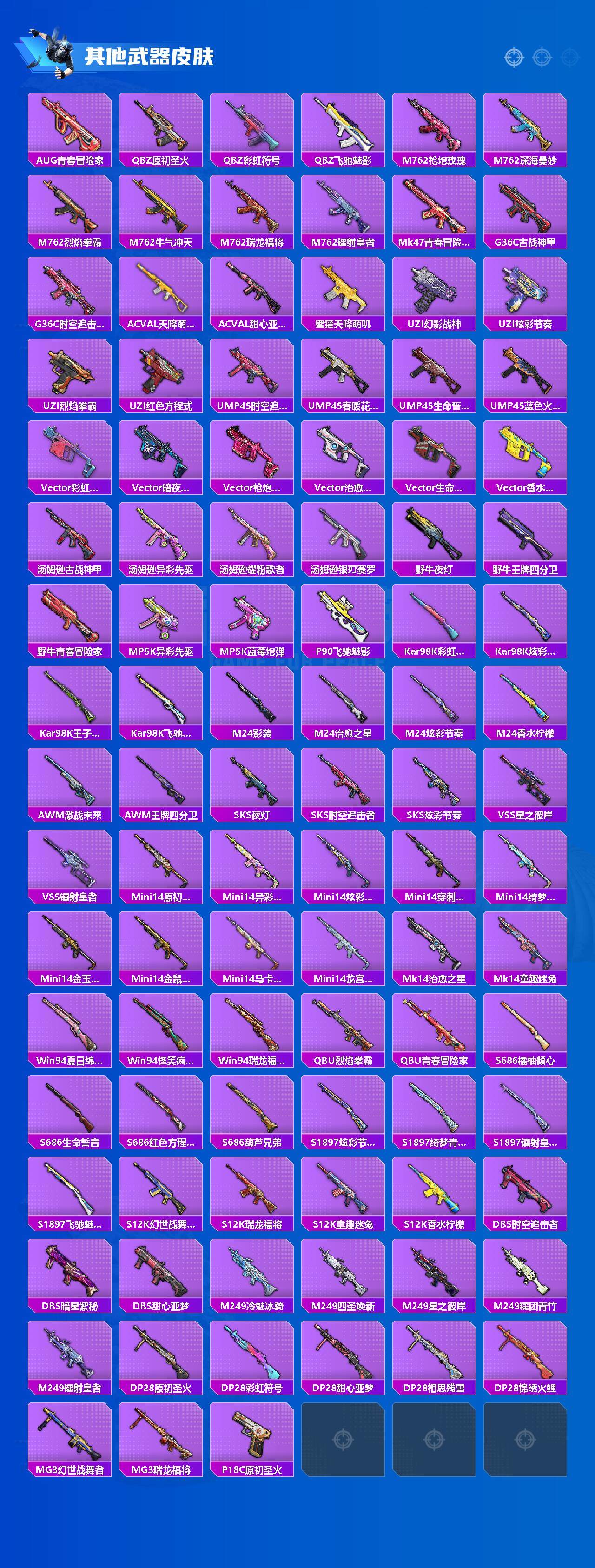 【稀有枪皮】:AKM-夜灯,AKM-奇异狩猎者,AKM-星之彼岸,AKM-百万伏特,AKM-破晓战魂,AKM-萌趣颜团子,AKM-虎虎生威,AKM-霓虹街区,AKM-龙的传人,M16A4-幻世战舞者,M16A4-甜心亚梦,SCAR-L-夏日绵绵冰,SCAR-L-暗夜玫瑰,SCAR-L-炫彩节奏,SCAR-L-王牌四分卫,SCAR-L-红色方程式,M416-夜灯,M416-暗星紫秘,M416-红色方程式,M416-葫芦兄弟,M416-蓝色火焰,GROZA-异彩先驱,GROZA-彩虹符号,GROZA-恐龙拽拽,GROZA-梨园星光,GROZA-治愈之星,GROZA-紫翼圣骑,GROZA-蓝莓炮弹,AUG-凝视深渊,AUG-耀粉歌者,AUG-青春冒险家,QBZ-原初圣火,QBZ-彩虹符号,QBZ-飞驰魅影,M762-枪炮玫瑰,M762-深海曼妙,M762-烈焰拳霸,M762-牛气冲天,M762-瑞龙福将,M762-镭射皇者,Mk47-青春冒险家,G36C-古战神甲,G36C-时空追击者,AC-VAL