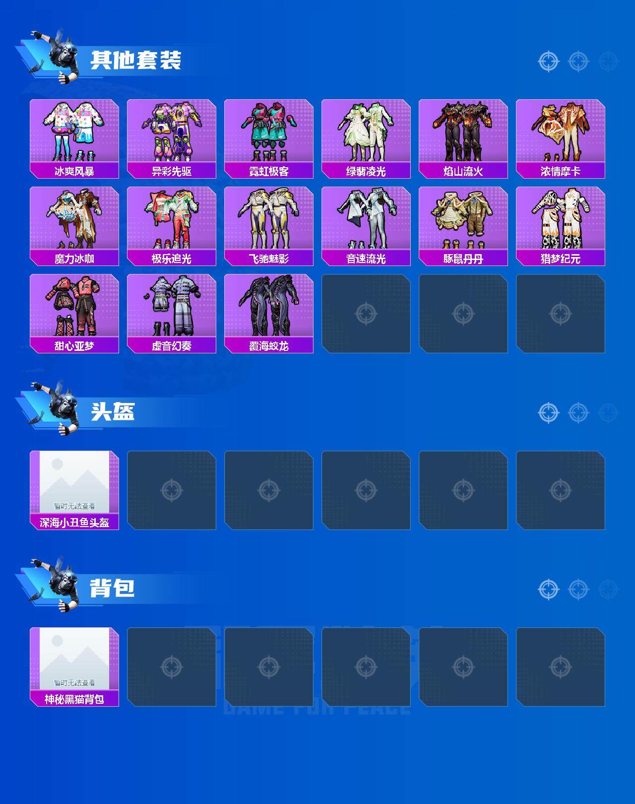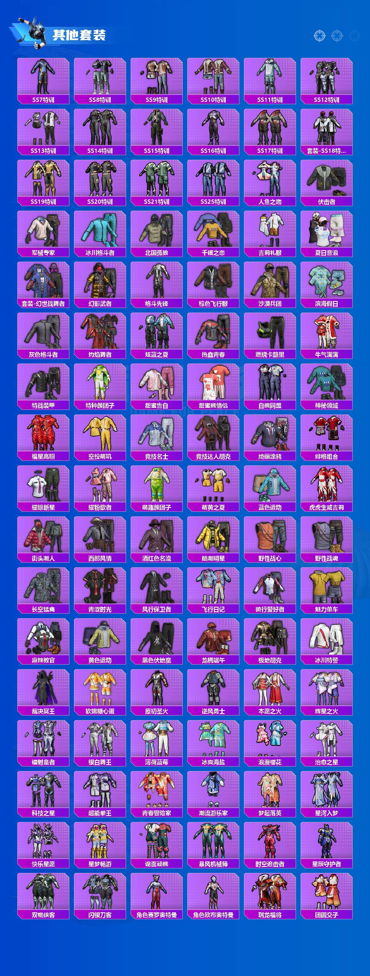 【粉色套装】:粉装-粉色回忆,粉装-草莓生巧,粉装-绚金战神,粉装-银刃赛罗,粉装-冰霜白皇,粉装-炙焰红王,粉装-飓风飞鹰,粉装-酣梦娃娃,粉装-恐龙拽拽,粉装-紫电风暴,角色-复仇流浪者