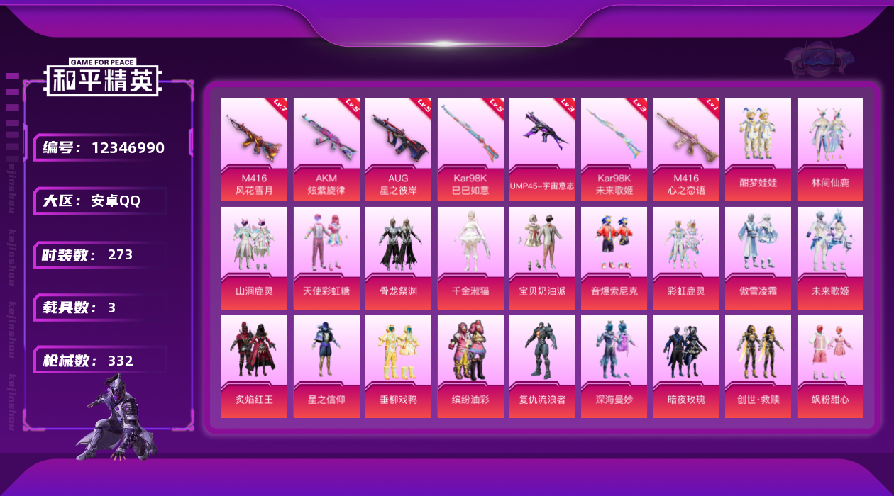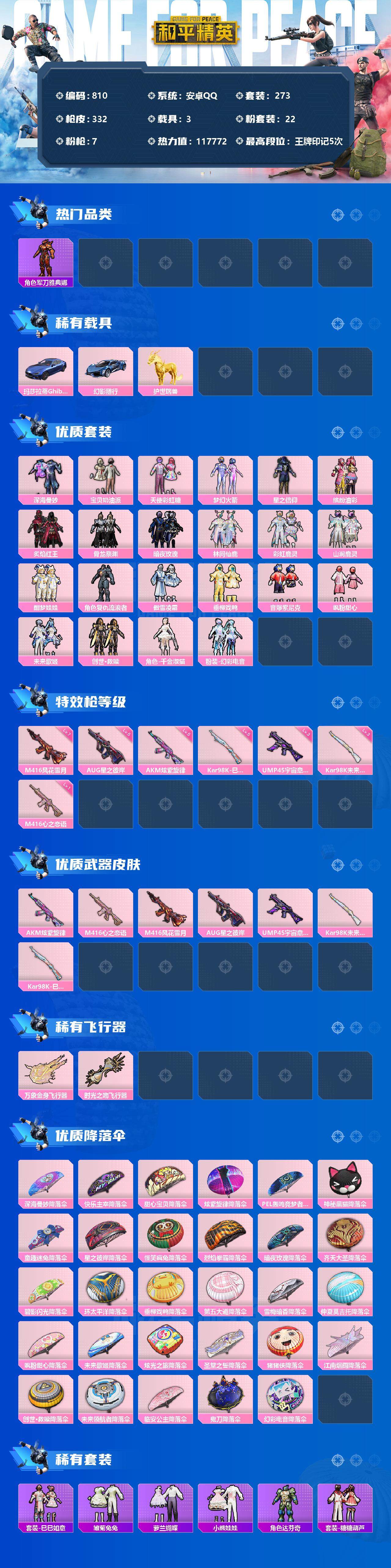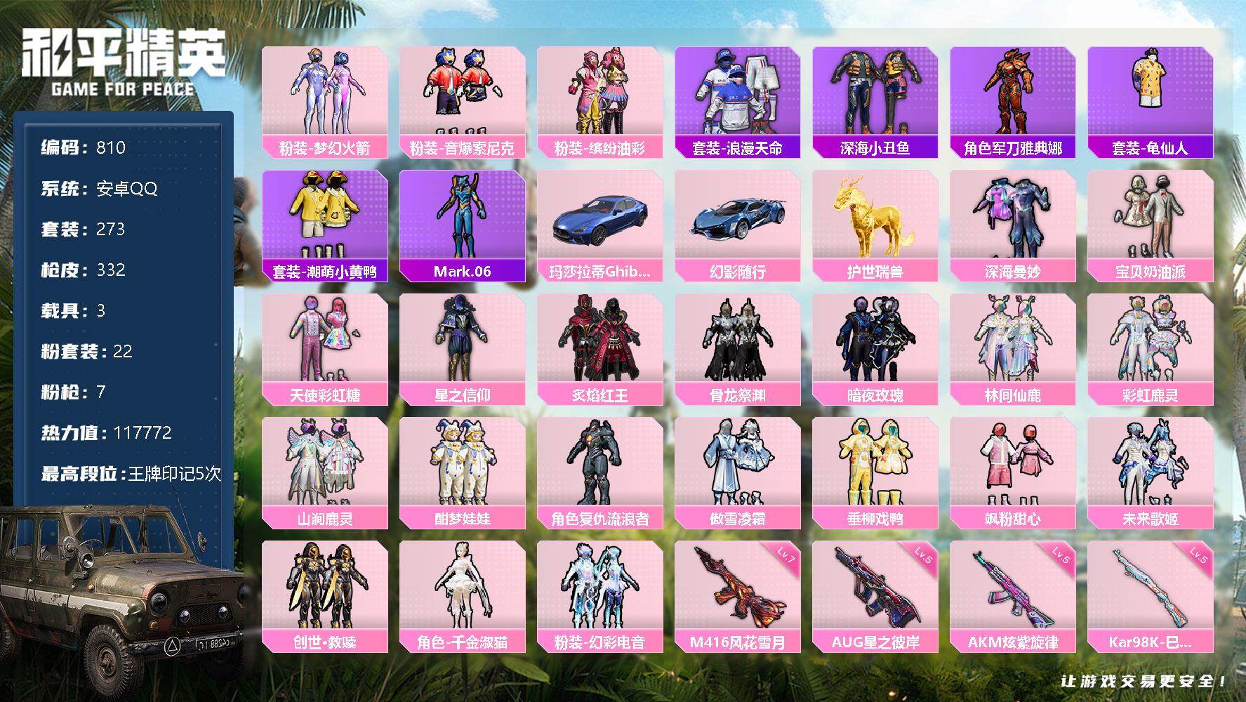 [12346990]【商品标题】:安卓 手Q-22粉装-7特效枪-3载具-3粉色飞行器-117772热力值-5王牌印记-273套装-332枪皮