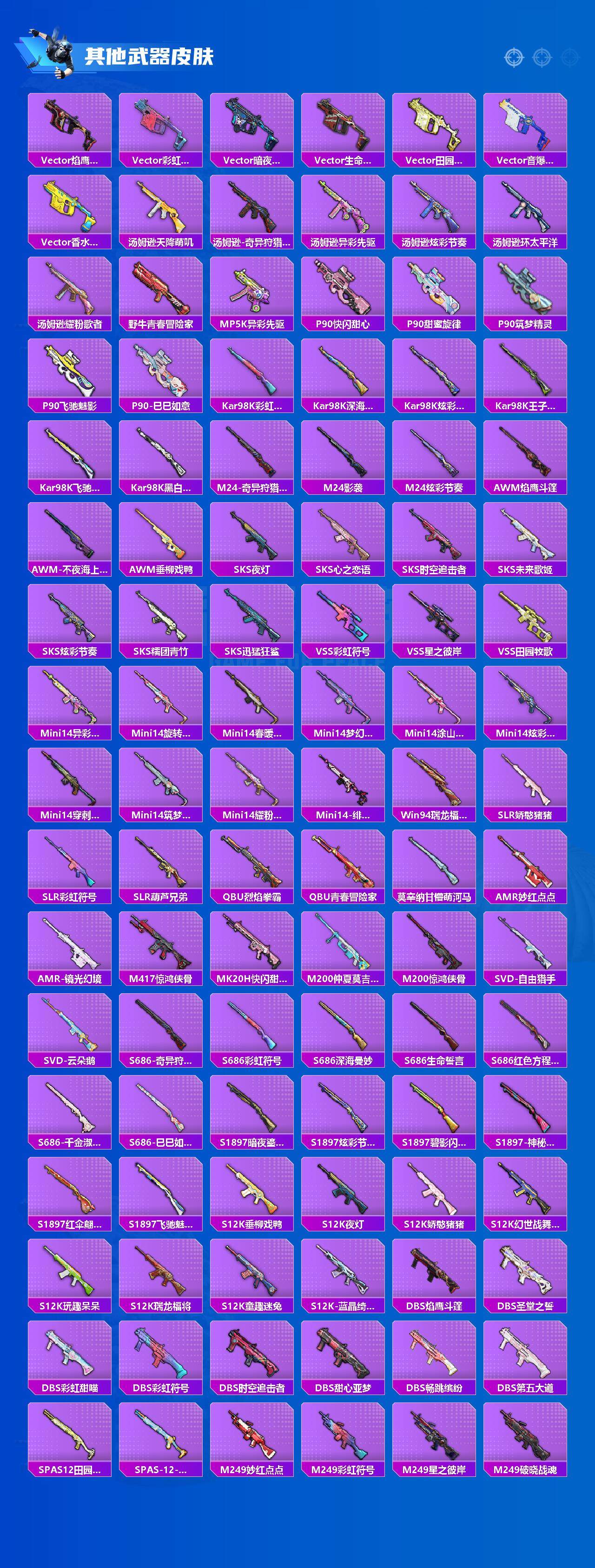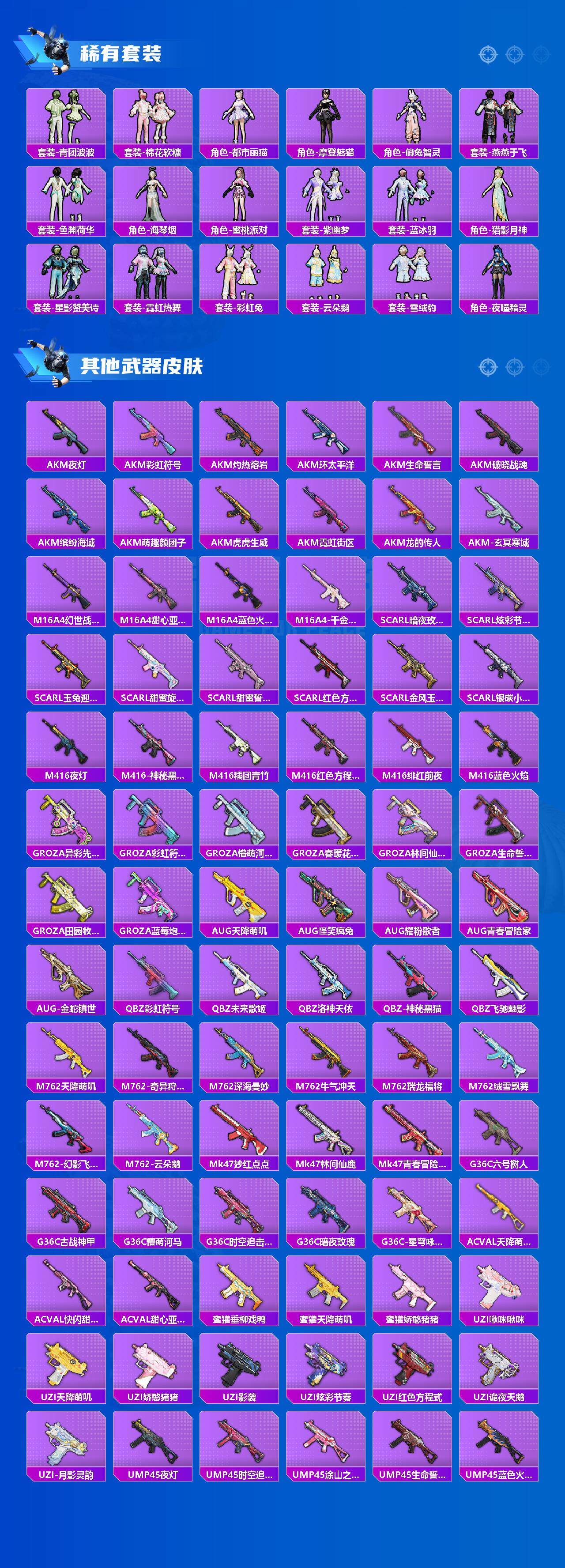 【粉色枪皮】:AKM-炫紫旋律,M416-心之恋语,M416-风花雪月,AUG-星之彼岸,UMP45-宇宙意志,Kar98K-未来歌姬,Kar98K-巳巳如意