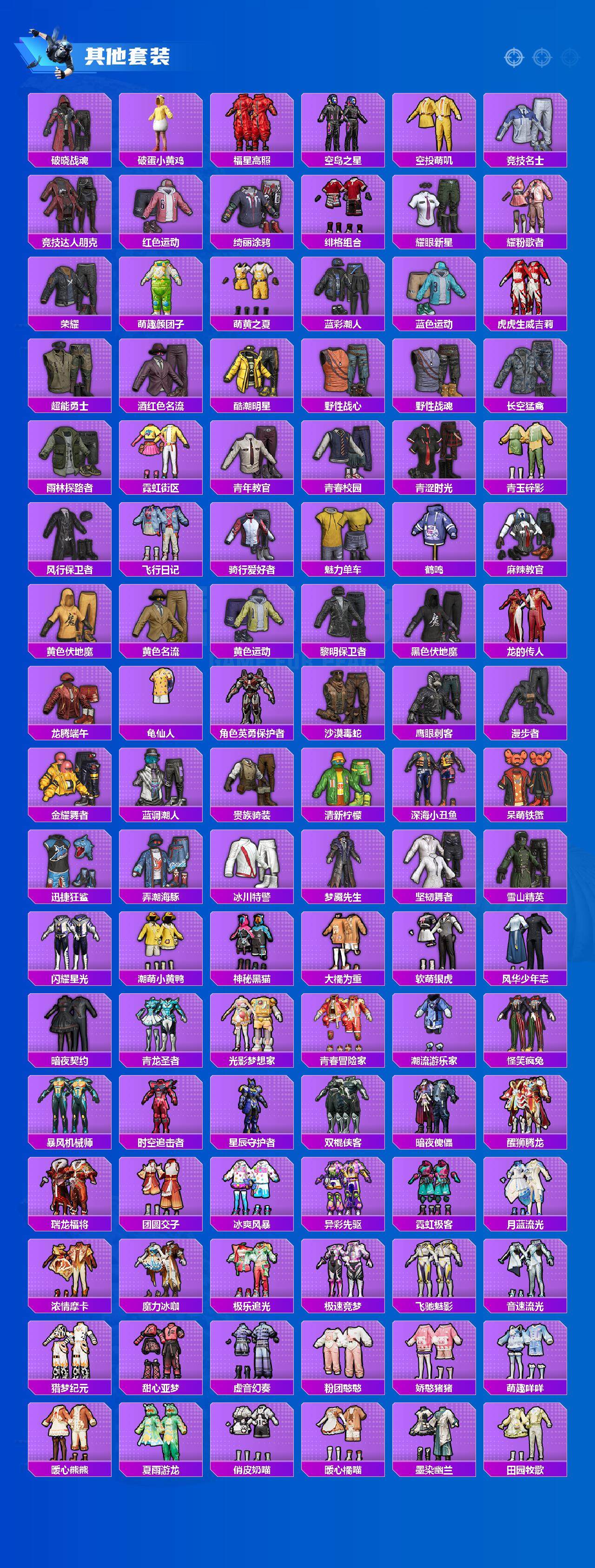 【粉色套装】:粉装-深海曼妙,粉装-宝贝奶油派,粉装-天使彩虹糖,粉装-梦幻火箭,粉装-星之信仰,粉装-缤纷油彩,粉装-炙焰红王,粉装-骨龙祭渊,粉装-暗夜玫瑰,粉装-林间仙鹿,粉装-彩虹鹿灵,粉装-山涧鹿灵,粉装-酣梦娃娃,角色-复仇流浪者,粉装-傲雪凌霜,粉装-垂柳戏鸭,粉装-音爆索尼克,粉装-飒粉甜心,粉装-未来歌姬,套装-创世·救赎,角色-千金淑猫,粉装-幻彩电音