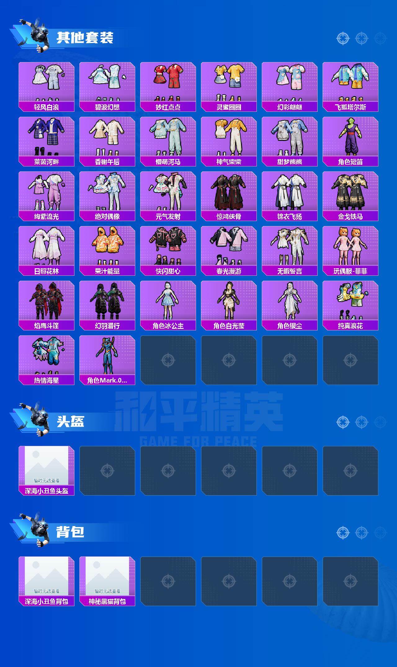 套装-酣梦娃娃,套装-林间仙鹿,套装-山涧鹿灵,套装-天使彩虹糖,套装-骨龙祭渊,角色-千金淑猫,套装-宝贝奶油派,套装-音爆索尼克,套装-彩虹鹿灵,套装-傲雪凌霜,套装-未来歌姬,套装-炙焰红王,套装-星之信仰,套装-垂柳戏鸭,套装-缤纷油彩,角色-复仇流浪者,套装-深海曼妙,套装-暗夜玫瑰,套装-创世·救赎,套装-飒粉甜心