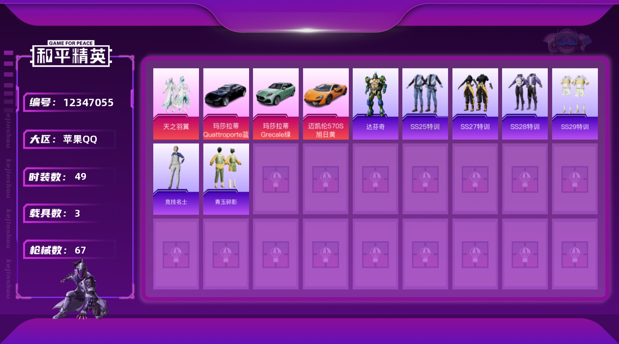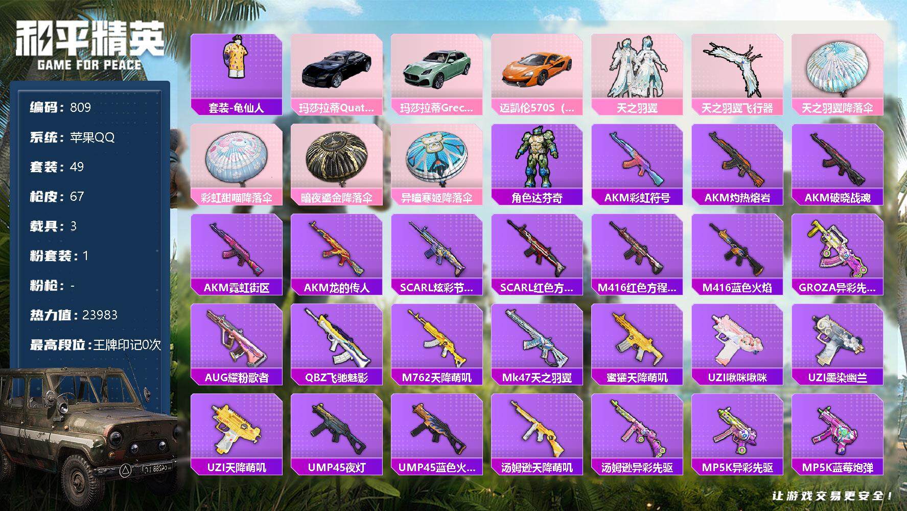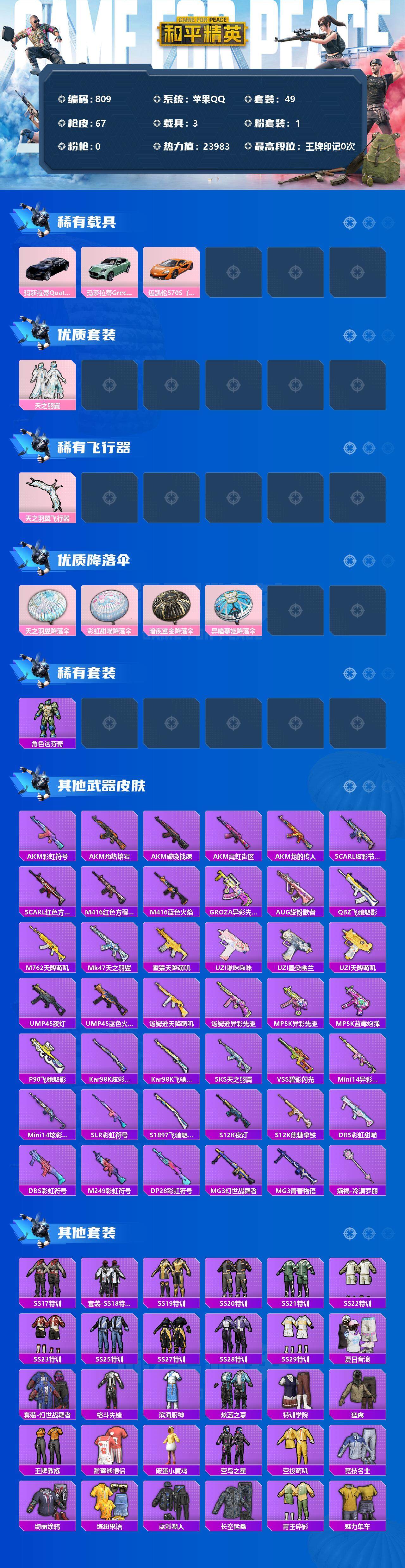 [12347055]【商品标题】:苹果 手Q-1粉装-0特效枪-3载具-1粉色飞行器-23983热力值-1王牌印记-49套装-67枪皮 【热门品类】:套装-龟仙人 【粉色载具】:玛莎拉蒂Quattroporte(夜幕蓝),玛莎拉蒂Grecale(薄荷绿),迈凯伦570S(旭日黄) 【粉色套装】:粉装-天之羽翼 【粉色飞行器】:天之羽翼飞行器 【粉色降落伞】:天之羽翼降落伞,彩虹甜喵降落伞,暗夜鎏金降落伞,异瞳寒姬降落伞 【稀有套装】:套装-龟仙人,角色-达芬奇 【稀有枪皮】:AKM-彩虹符号,AKM-灼热熔岩,AKM-破晓战魂,AKM-霓虹街区,AKM-龙的传人,SCAR-L-炫彩节奏,SCAR-L-红色方程式,M416-红色方程式,M416-蓝色火焰,GROZA-异彩先驱,AUG-耀粉歌者,QBZ-飞驰魅影,M762-天降萌叽,Mk47-天之羽翼,蜜獾-天降萌叽,UZI-啾咪啾咪,UZI-墨染幽兰,UZI-天降萌叽,UMP45-夜灯,UMP45-蓝色火焰,汤姆逊-天降萌叽,汤姆逊-异彩先驱,MP5K-异彩先驱,MP5K-蓝莓炮弹,P90-飞驰魅影,Kar98K-炫彩节奏,Kar98K-飞驰魅影,SKS-天之羽翼,VSS-碧影闪光,Mini14-异彩先驱,Mini14-炫彩节奏,SLR-彩虹符号,S1897-飞驰魅影,S12K-夜灯,S12K-焦糖拿铁,DBS-彩虹甜喵,DBS-彩虹符号,M249-彩虹符号,DP-28-彩虹符号,MG3-幻世战舞者,MG3-青春物语,撬棍-冷漠罗丽 【其他套装】:套装-SS17特训,套装-SS18特训,套装-SS19特训,套装-SS20特训,套装-SS21特训,套装-SS22特训,套装-SS23特训,套装-SS25特训,套装-SS27特训,套装-SS28特训,套装-SS29特训,套装-夏日音浪,套装-幻世战舞者,套装-格斗先锋,套装-滨海厨神,套装-炫蓝之夏,套装-特训学院,套装-猛禽,套装-王牌教练,套装-甜蜜熊情侣,套装-破蛋小黄鸡,套装-空岛之星,套装-空投萌叽,套装-竞技名士,套装-绮丽涂鸦,套装-缤纷果语,套装-蓝彩潮人,套装-长空猛禽,套装-青玉碎影,套装-魅力单车,套装-麻辣教官,套装-黑色伏地魔,套装-龙的传人,套装-龟仙人,套装-异彩先驱,套装-缤纷焰火,套装-霓虹极客,套装-焰山流火,套装-飞驰魅影,套装-音速流光 【稀有背包】: