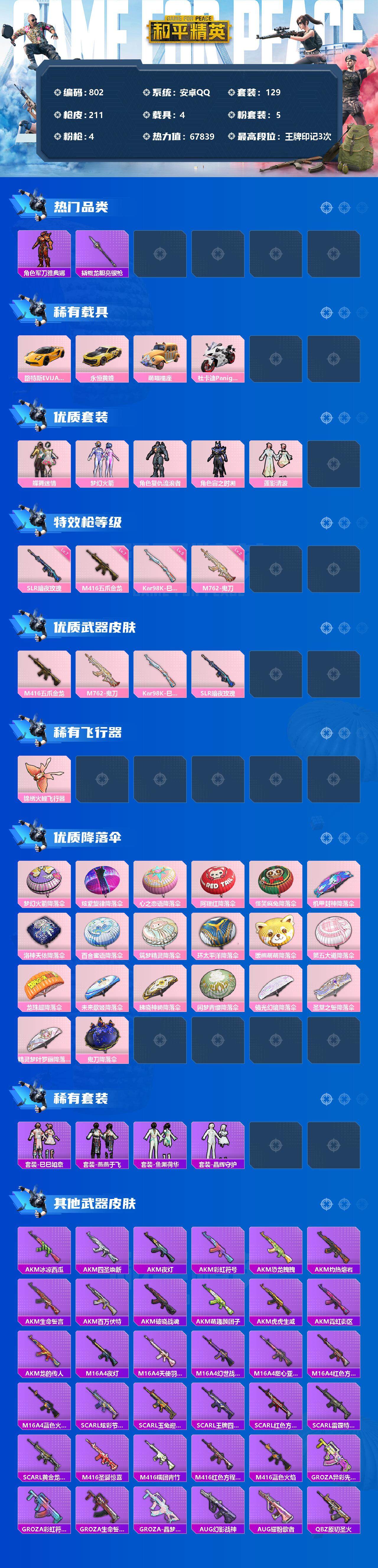 [12347768]【商品标题】:安卓 手Q-5粉装-4特效枪-4载具-1粉色飞行器-67839热力值-3王牌印记-129套装-211枪皮 【热门品类】:粉装-梦幻火箭,套装-奇异狩猎者,角色-军刀雅典娜,撬棍-龙胆亮银枪 【粉色载具】:路特斯EVIJA(星际黄),永恒黄蜂,萌喵橘座,杜卡迪 Panigale V4(星耀白) 【粉色套装】:粉装-蝶舞迷情,粉装-梦幻火箭,角色-复仇流浪者,角色-宙之时溯,粉装-莲影清波 【粉色枪皮等级】:M416-五爪金龙(七级),M762-鬼刀(二级),Kar98K-巳巳如意(五级),SLR-暗夜玫瑰(七级) 【粉色枪皮】:M416-五爪金龙,M762-鬼刀,Kar98K-巳巳如意,SLR-暗夜玫瑰 【粉色飞行器】:锦绣火鲤飞行器 【粉色降落伞】:梦幻火箭降落伞,炫紫旋律降落伞,心之恋语降落伞,阿狸红降落伞,怪笑疯兔降落伞,机甲封神降落伞,洛神天依降落伞,百合蜜语降落伞,筑梦精灵降落伞,环太平洋降落伞,暖熊萌萌降落伞,第五大道降落伞,龙珠超降落伞,未来歌姬降落伞,拂晓神骑降落伞,闲梦青缨降落伞,镜光幻境降落伞,圣堂之誓降落伞,精灵梦叶罗丽降落伞,鬼刀降落伞 【稀有套装】:套装-巳巳如意,套装-燕燕于飞,套装-鱼渊荷华,套装-晶辉守护 【稀有枪皮】:AKM-冰凉西瓜,AKM-四圣焕新,AKM-夜灯,AKM-彩虹符号,AKM-恐龙拽拽,AKM-灼热熔岩,AKM-生命誓言,AKM-百万伏特,AKM-破晓战魂,AKM-萌趣颜团子,AKM-虎虎生威,AKM-霓虹街区,AKM-龙的传人,M16A4-夜灯,M16A4-天使羽翼,M16A4-幻世战舞者,M16A4-甜心亚梦,M16A4-红色方程式,M16A4-蓝色火焰,SCAR-L-炫彩节奏,SCAR-L-玉兔迎春,SCAR-L-王牌四分卫,SCAR-L-红色方程式,SCAR-L-雷霆特警,SCAR-L-黄金龙骨,M416-圣诞惊喜,M416-糯团青竹,M416-红色方程式,M416-蓝色火焰,GROZA-异彩先驱,GROZA-彩虹符号,GROZA-生命誓言,GROZA-晶梦幻蝶,AUG-幻影战神,AUG-耀粉歌者,QBZ-原初圣火,QBZ-彩虹符号,QBZ-未来歌姬,QBZ-洛神天依,QBZ-飞驰魅影,M762-奇异狩猎者,M762-彩虹甜喵,M762-彩虹符号,M762-暖熊萌萌,M762-牛气冲天,M762