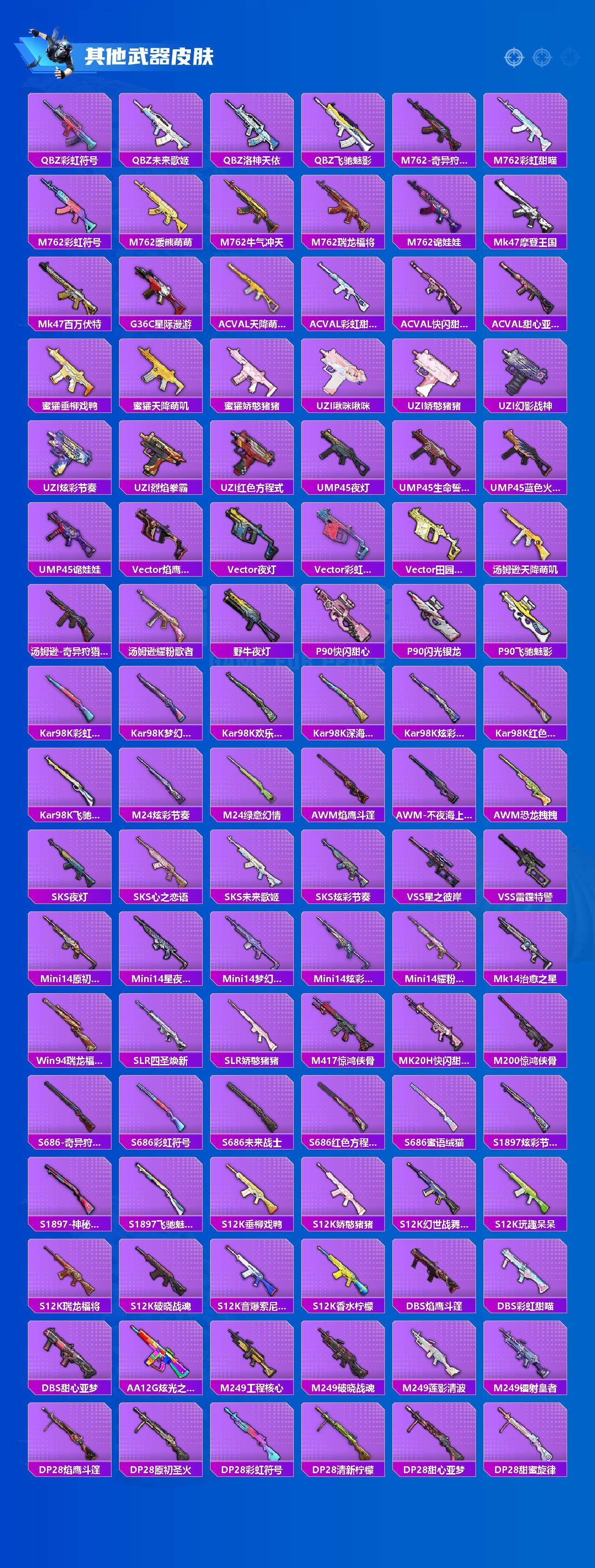 【稀有枪皮】:AKM-冰凉西瓜,AKM-四圣焕新,AKM-夜灯,AKM-彩虹符号,AKM-恐龙拽拽,AKM-灼热熔岩,AKM-生命誓言,AKM-百万伏特,AKM-破晓战魂,AKM-萌趣颜团子,AKM-虎虎生威,AKM-霓虹街区,AKM-龙的传人,M16A4-夜灯,M16A4-天使羽翼,M16A4-幻世战舞者,M16A4-甜心亚梦,M16A4-红色方程式,M16A4-蓝色火焰,SCAR-L-炫彩节奏,SCAR-L-玉兔迎春,SCAR-L-王牌四分卫,SCAR-L-红色方程式,SCAR-L-雷霆特警,SCAR-L-黄金龙骨,M416-圣诞惊喜,M416-糯团青竹,M416-红色方程式,M416-蓝色火焰,GROZA-异彩先驱,GROZA-彩虹符号,GROZA-生命誓言,GROZA-晶梦幻蝶,AUG-幻影战神,AUG-耀粉歌者,QBZ-原初圣火,QBZ-彩虹符号,QBZ-未来歌姬,QBZ-洛神天依,QBZ-飞驰魅影,M762-奇异狩猎者,M762-彩虹甜喵,M762-彩虹符号,M762-暖熊萌萌,M762-牛气冲天,M762