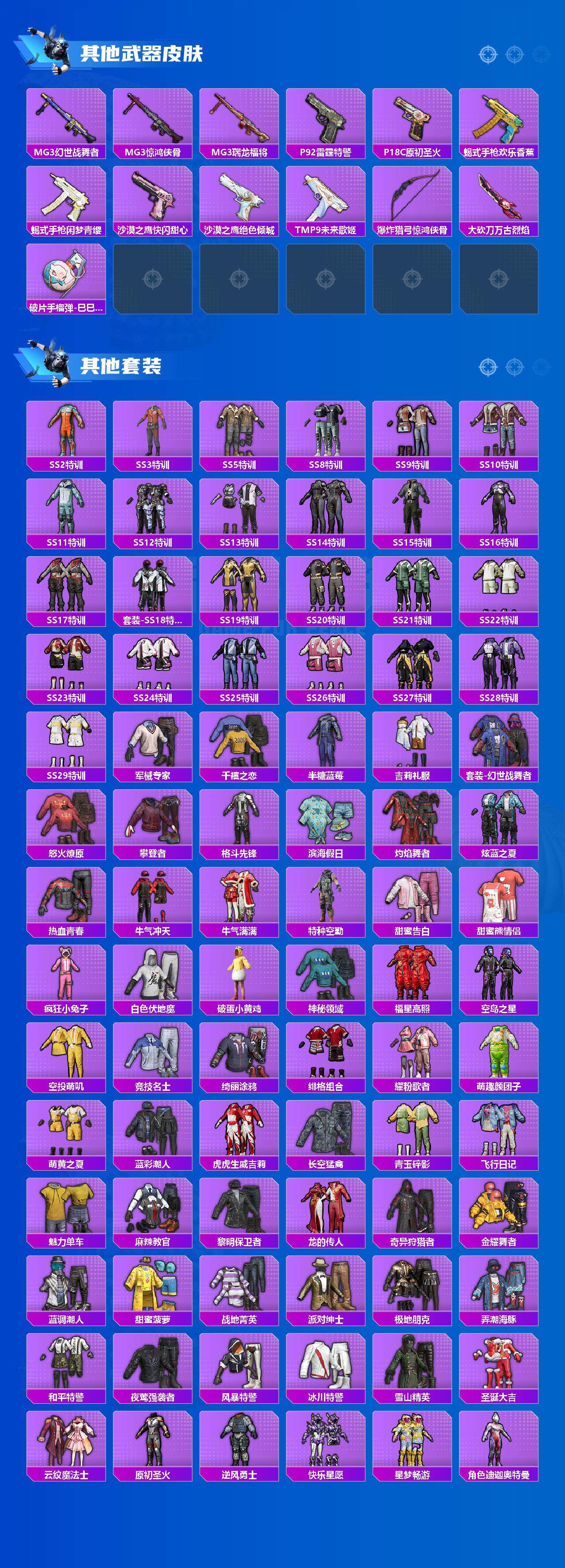 - [11994323]总资产:113M 10传说枪械 哈夫币:54.960K 可二次 可修改实名 烽火地带段位:白银 全面战场段位:无段位 传说武器皮肤:AK-12突击步枪-特斯拉线圈,SR-3M紧凑突击步枪-特斯拉线圈,UZI冲锋枪-特斯拉线圈,勇士冲锋枪-能天使-午夜邮差,Vector冲锋枪-能天使-午夜邮差,腾龙突击步枪-捞点薯条,93R-捞点薯条,AWM狙击步枪-捞点薯条,M4A1突击步枪-阿米娅,CAR-15突击步枪-阿米娅 史诗武器皮肤:M700狙击步枪-蝮蛇,SV-98狙击步枪-林中猎手,M250通用机枪-囚徒,P90冲锋枪-紧急戒备,QJB201轻机枪-Old Habits,M700狙击步枪-竞技风