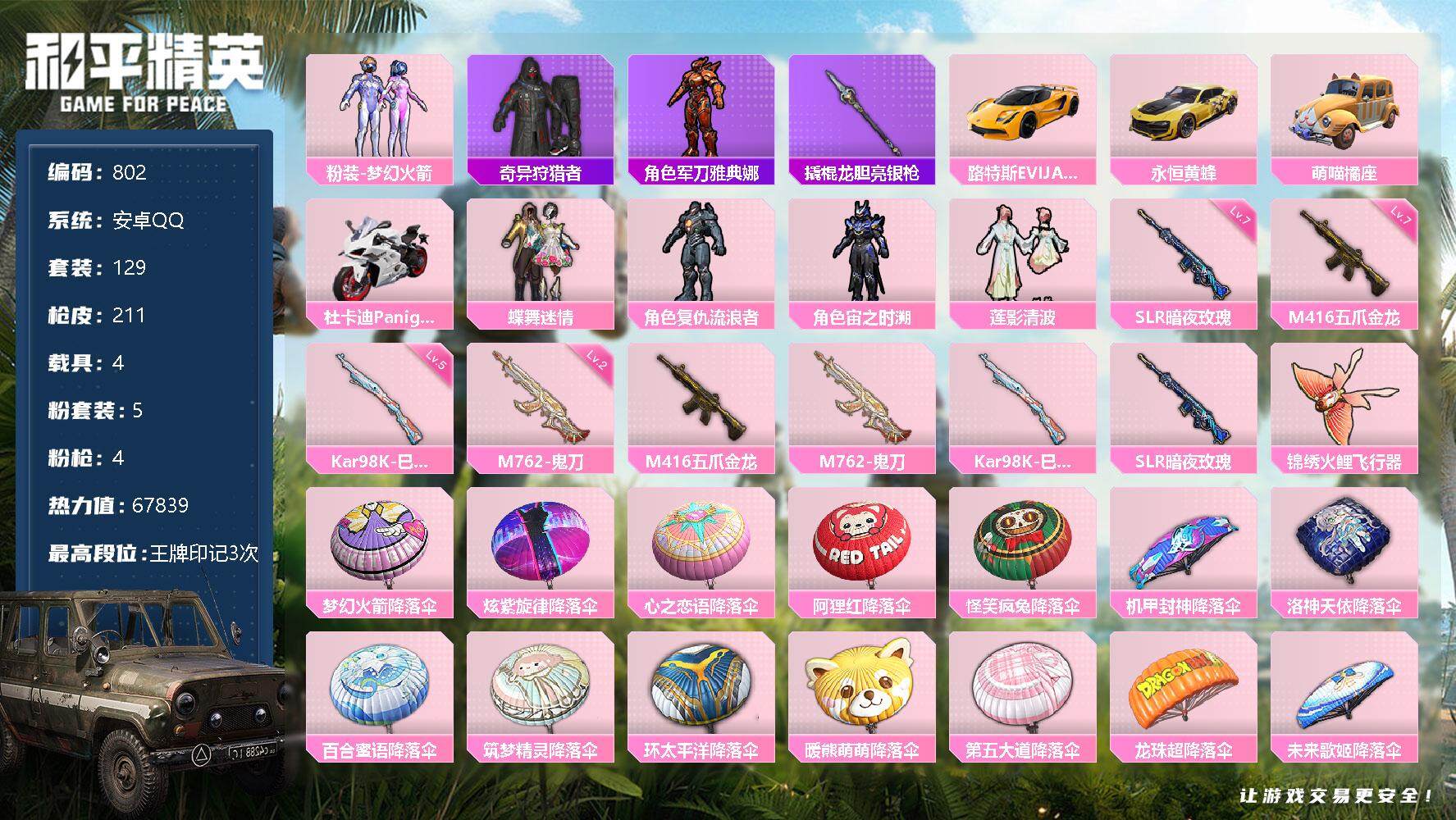 [12347768]【商品标题】:安卓 手Q-5粉装-4特效枪-4载具-1粉色飞行器-67839热力值-3王牌印记-129套装-211枪皮