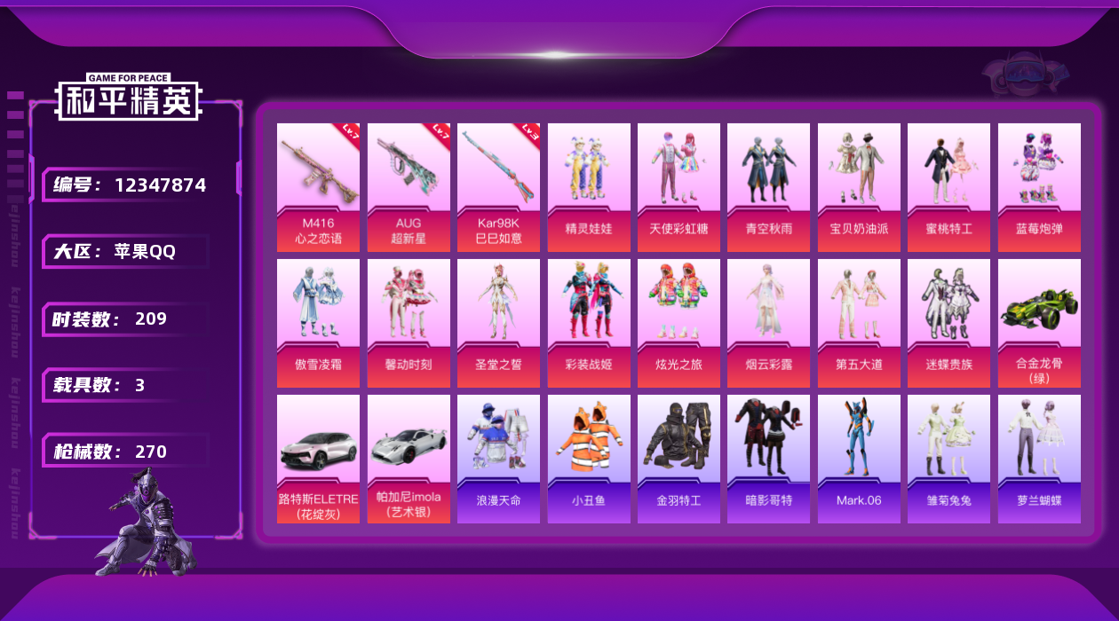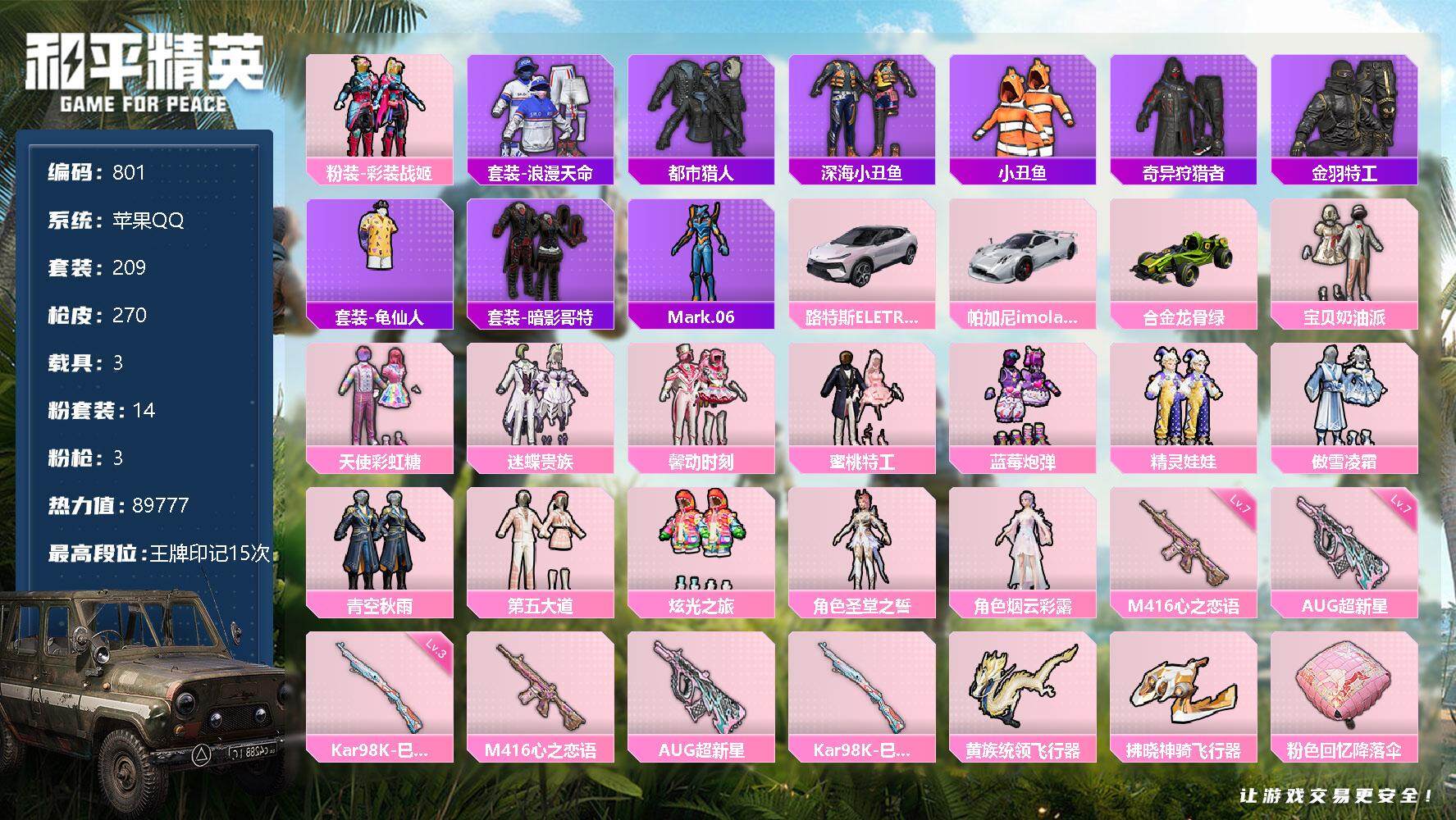 [12347874]【商品标题】:苹果 手Q-14粉装-3特效枪-3载具-2粉色飞行器-89777热力值-15王牌印记-209套装-270枪皮