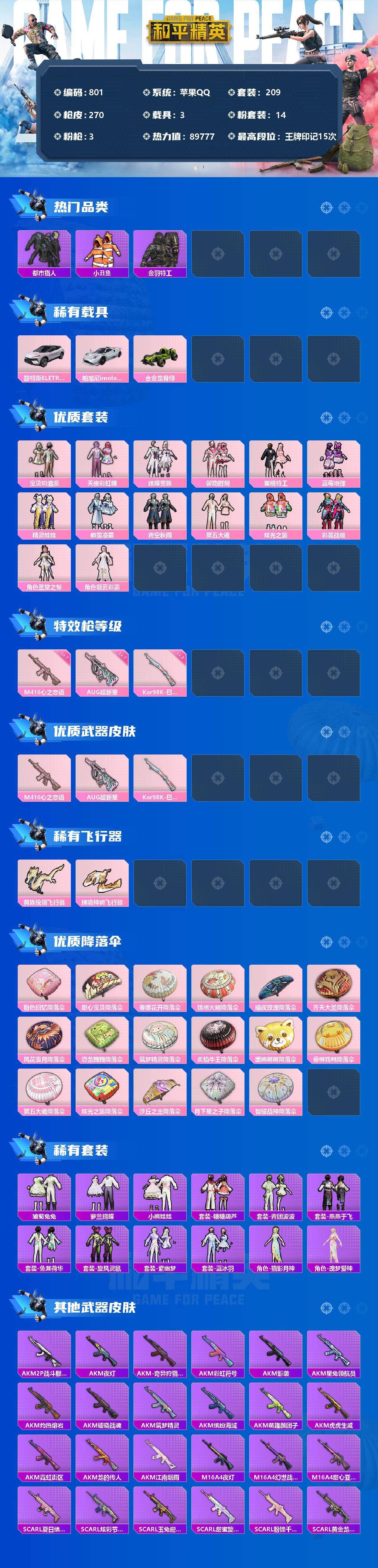 [12347874]【商品标题】:苹果 手Q-14粉装-3特效枪-3载具-2粉色飞行器-89777热力值-15王牌印记-209套装-270枪皮 【热门品类】:粉装-彩装战姬,套装-浪漫天命,套装-都市猎人,套装-深海小丑鱼,套装-小丑鱼,套装-奇异狩猎者,套装-金羽特工,套装-龟仙人,套装-暗影哥特,角色-Mark.06 【粉色载具】:路特斯ELETRE(花绽灰),帕加尼imola(艺术银),合金龙骨(绿) 【粉色套装】:粉装-宝贝奶油派,粉装-天使彩虹糖,粉装-迷蝶贵族,粉装-馨动时刻,粉装-蜜桃特工,粉装-蓝莓炮弹,粉装-精灵娃娃,粉装-傲雪凌霜,粉装-青空秋雨,粉装-第五大道,粉装-炫光之旅,粉装-彩装战姬,角色-圣堂之誓,角色-烟云彩露 【粉色枪皮等级】:M416-心之恋语(七级),AUG-超新星(七级),Kar98K-巳巳如意(三级) 【粉色枪皮】:M416-心之恋语,AUG-超新星,Kar98K-巳巳如意 【粉色飞行器】:黄族统领飞行器,拂晓神骑飞行器 【粉色降落伞】:粉色回忆降落伞,甜心宝贝降落伞,春暖花开降落伞,锦绣火鲤降落伞,暗夜玫瑰降落伞,齐天大圣降落伞,风花雪月降落伞,恐龙拽拽降落伞,筑梦精灵降落伞,炙焰牛王降落伞,暖熊萌萌降落伞,垂柳戏鸭降落伞,第五大道降落伞,炫光之旅降落伞,沙丘之主降落伞,月下星之子降落伞,智耀战神降落伞 【稀有套装】:套装-龟仙人,套装-雏菊兔兔,套装-萝兰蝴蝶,套装-小熊娃娃,套装-糖糖葫芦,套装-青团波波,套装-燕燕于飞,套装-鱼渊荷华,套装-旋风灵鼠,套装-紫幽梦,套装-蓝冰羽,角色-猎影月神,角色-瑰梦爱神 【稀有枪皮】:AKM-2P战斗服款,AKM-夜灯,AKM-奇异狩猎者,AKM-彩虹符号,AKM-影袭,AKM-星兔领航员,AKM-江南烟雨,AKM-灼热熔岩,AKM-破晓战魂,AKM-筑梦精灵,AKM-缤纷海域,AKM-萌趣颜团子,AKM-虎虎生威,AKM-霓虹街区,AKM-龙的传人,M16A4-夜灯,M16A4-幻世战舞者,M16A4-甜心亚梦,SCAR-L-夏日绵绵冰,SCAR-L-炫彩节奏,SCAR-L-玉兔迎春,SCAR-L-甜蜜旋律,SCAR-L-粉锦千层,SCAR-L-黄金龙骨,M416-夜灯,M416-暗夜行者,M416-糯团青竹,GROZA-异彩先驱,GROZA-彩虹符号,GROZA-影袭,GROZA-春暖花开