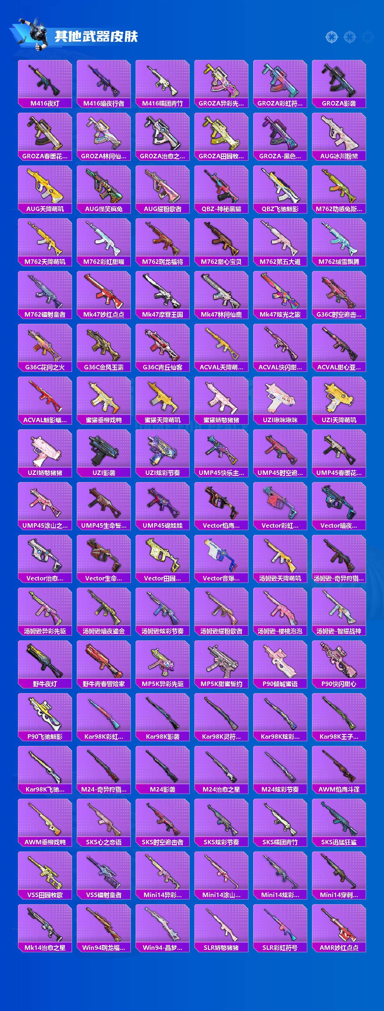 【稀有枪皮】:AKM-2P战斗服款,AKM-夜灯,AKM-奇异狩猎者,AKM-彩虹符号,AKM-影袭,AKM-星兔领航员,AKM-江南烟雨,AKM-灼热熔岩,AKM-破晓战魂,AKM-筑梦精灵,AKM-缤纷海域,AKM-萌趣颜团子,AKM-虎虎生威,AKM-霓虹街区,AKM-龙的传人,M16A4-夜灯,M16A4-幻世战舞者,M16A4-甜心亚梦,SCAR-L-夏日绵绵冰,SCAR-L-炫彩节奏,SCAR-L-玉兔迎春,SCAR-L-甜蜜旋律,SCAR-L-粉锦千层,SCAR-L-黄金龙骨,M416-夜灯,M416-暗夜行者,M416-糯团青竹,GROZA-异彩先驱,GROZA-彩虹符号,GROZA-影袭,GROZA-春暖花开