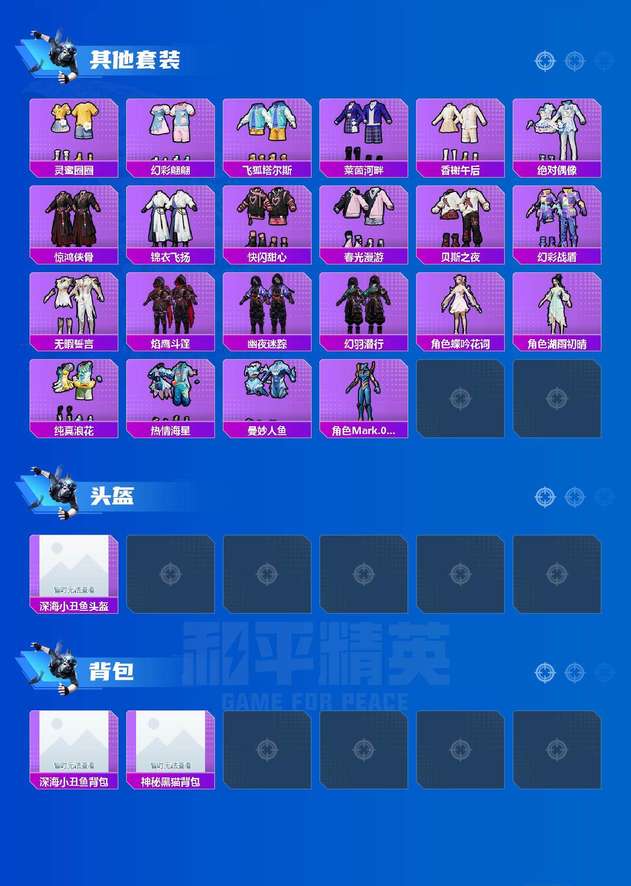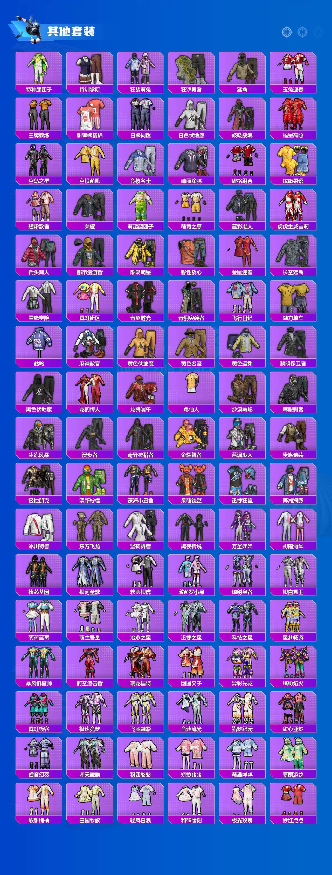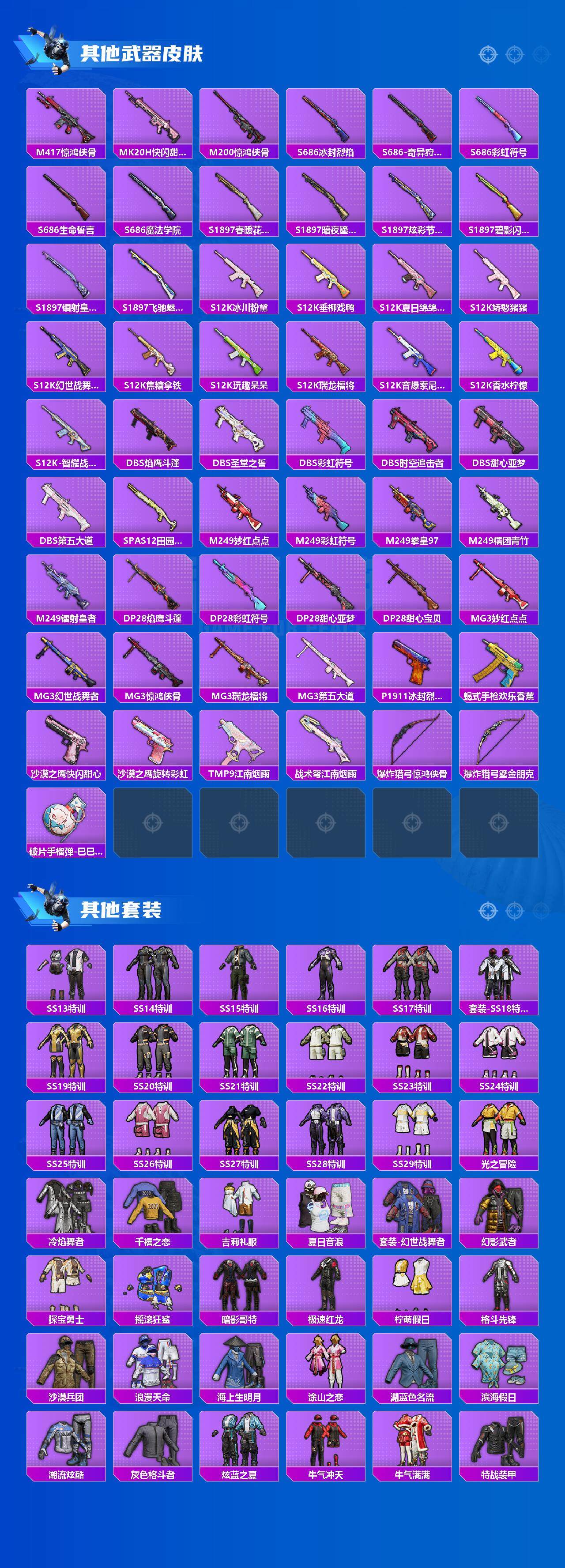 - [12292601]11粉装 2特效枪 2载具 14印记 可二次 可修改实名 优质装备:玛莎拉蒂Ghibli(金),特斯拉Model X(珍珠白),放客神游,金曜白虎,金属狂野,静灵氛围,智能音符,缤纷油彩(猪妹猪脸妹),Kar98K未来歌姬,七级Kar98K-未来歌姬,Kar98K-巳巳如意 热门装扮:筑梦精灵,灵感创作师,畅跳缤纷,未来歌姬,守护天翼,神秘黑猫,恶魔喵喵,浪漫波比 一级特效枪:一级Kar98K-巳巳如意 紫色装扮:SS30特训套装,SS31特训套装,SS33特训套装,青涩时光,旭日情侣,SS23特训,田园牧歌,轻风白浪,SS22特训,摩登艾咪,夏日音浪,北国孤狼,千禧之恋,圣诞大吉,坚韧舞者,夜莺强袭者,幻世战舞者,幻影武者,凛冬战士,SS3特训,SS5特训,冷焰舞者,军械专家,冰原使者,,冰川特警,娇憨猪猪,SS16特训,电音精灵,天籁歌者,瑞龙福将,团圆交子,SS17特训,SS14特训,青春冒险家,SS15特训,鹤发童颜,SS21特训,甜心亚梦,虚音幻奏,SS20特训,灵幻魔术师,萌趣咩咩,SS18特训,智慧隐士,飞驰魅影,音速流光,SS19特训,龙的传人,飞行日记,魅力单车,鹤鸣,麻辣教官,黄色伏地魔,黑色伏地魔,龙腾端午,龟仙人,都市魅力,长空猛禽,雪山征服者,雪山精英,霓虹街区,探宝勇士,炫蓝之夏,湖蓝色名流,滨海假日,滨海厨神,熔岩使者,牛气冲天,牛气满满,深蓝色名流,格斗先锋,极速红龙,柠萌假日,涂山之恋,沙漠毒蛇,沙漠雄狮,绮丽涂鸦,红色运动,荣耀,荧惑魅影,蓝彩潮人,蓝色运动,虎虎生威吉莉,街头潮人,超能勇士,狂沙舞者,白色伏地魔,甜蜜熊情侣,疯狂小兔子,白熊同盟,破晓战魂,破蛋小黄鸡,神秘领域,福星高照,空岛之星,空投萌叽,竞技勇士朋克,竞技达人朋克,粉雾星云,SS28特训,暗影刺翼,纯真浪花,巳巳如意,竞技名士,街头风暴,热情海星,惊鸿侠骨,神气柴柴,懵萌河马,SS24特训(SS24特训套装),萤火魅影(套装-荧惑魅影),SS25特训,锦衣飞扬,焰鹰斗篷,幻羽潜行,幽夜迷踪,SS27特训,SS26特训,春光漫游,快闪甜心,精神漫游,SS7特训,SS8特训,众神之王,爱神,智慧之神,SS9特训,舞夜骑士,白月香洋装,玲珑飞花,SS6特训,风华少年志,SS10特训,白虎圣者,原初圣火,逆风勇士,SS12特训,SS13特训,PEC最牛战神,SS