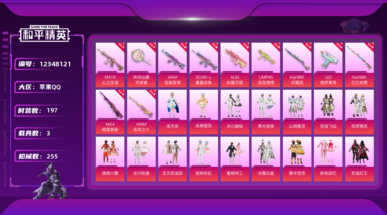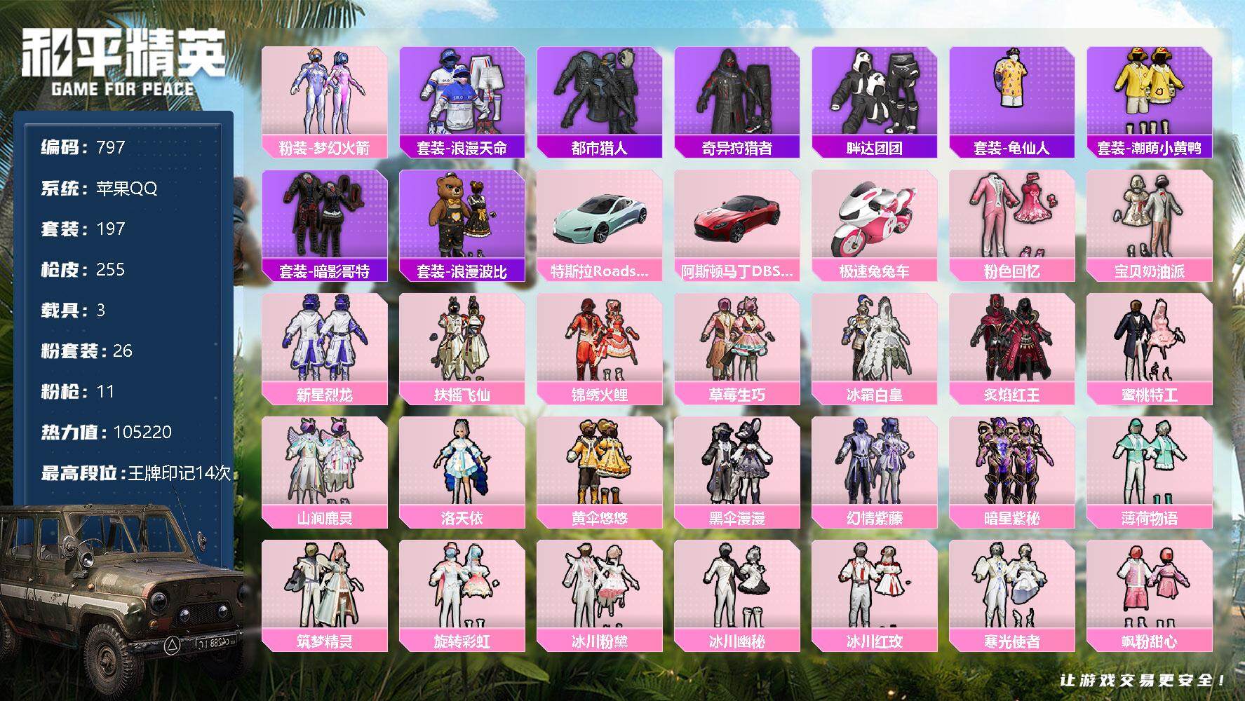 [12348121]【商品标题】:苹果 手Q-26粉装-11特效枪-3载具-4粉色飞行器-105220热力值-14王牌印记-197套装-255枪皮