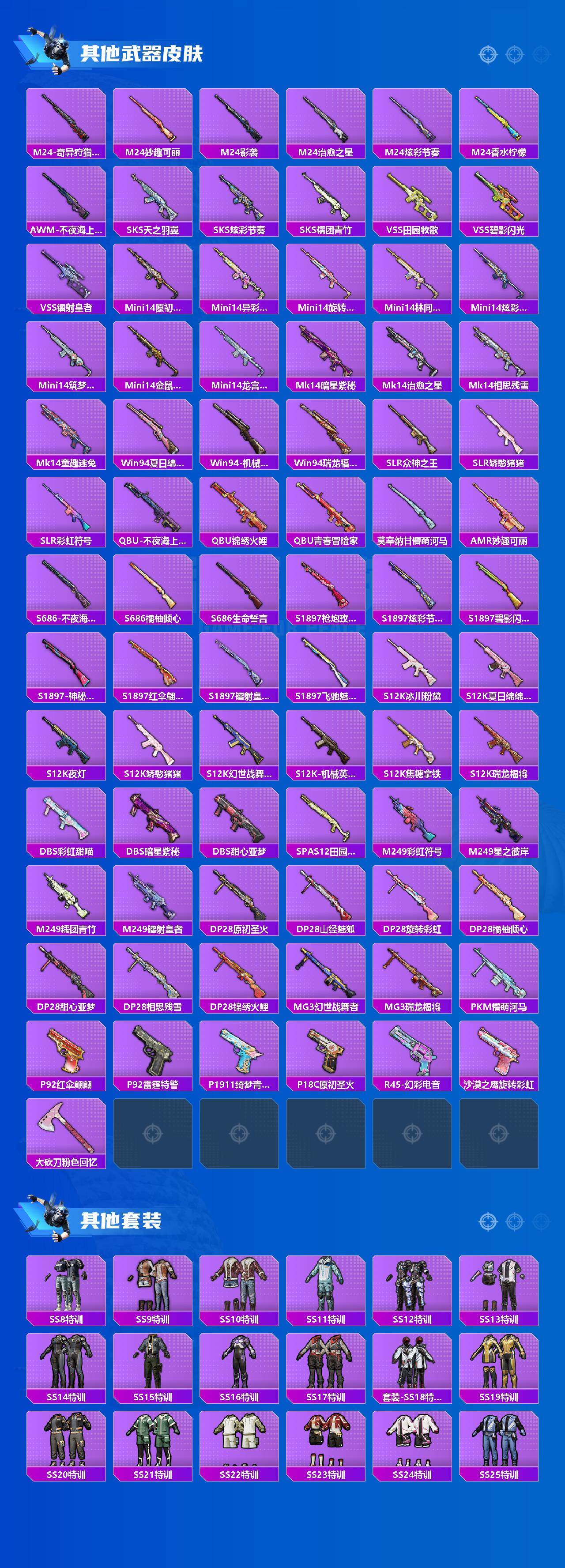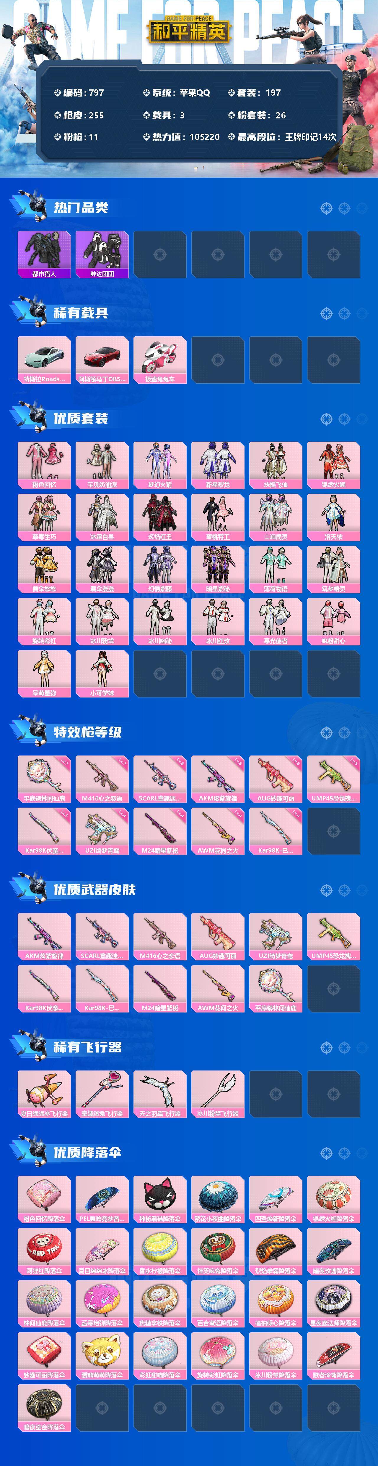 [12348121]【商品标题】:苹果 手Q-26粉装-11特效枪-3载具-4粉色飞行器-105220热力值-14王牌印记-197套装-255枪皮 【热门品类】:粉装-梦幻火箭,套装-浪漫天命,套装-都市猎人,套装-奇异狩猎者,套装-胖达团团,套装-龟仙人,套装-潮萌小黄鸭,套装-暗影哥特,套装-浪漫波比 【粉色载具】:特斯拉Roadster(水滴蓝),阿斯顿马丁DBS(红),极速兔兔车 【粉色套装】:粉装-粉色回忆,粉装-宝贝奶油派,粉装-梦幻火箭,粉装-新星烈龙,粉装-扶摇飞仙,粉装-锦绣火鲤,粉装-草莓生巧,粉装-冰霜白皇,粉装-炙焰红王,粉装-蜜桃特工,粉装-山涧鹿灵,角色-洛天依,粉装-黄伞悠悠,粉装-黑伞漫漫,粉装-幻情紫藤,粉装-暗星紫秘,粉装-薄荷物语,粉装-筑梦精灵,粉装-旋转彩虹,粉装-冰川粉黛,粉装-冰川幽秘,粉装-冰川红玫,粉装-寒光使者,粉装-飒粉甜心,角色-呆萌星弥,角色-小可学妹 【粉色枪皮等级】:AKM-炫紫旋律(六级),SCAR-L-童趣迷兔(六级),M416-心之恋语(七级),AUG-妙趣可丽(六级),UZI-绮梦青鸾(四级),UMP45-恐龙拽拽(五级),Kar98K-伏魔团(五级),Kar98K-巳巳如意(四级),M24-暗星紫秘(四级),AWM-花间之火(四级),平底锅-林间仙鹿(七级) 【粉色枪皮】:AKM-炫紫旋律,SCAR-L-童趣迷兔,M416-心之恋语,AUG-妙趣可丽,UZI-绮梦青鸾,UMP45-恐龙拽拽,Kar98K-伏魔团,Kar98K-巳巳如意,M24-暗星紫秘,AWM-花间之火,平底锅-林间仙鹿 【粉色飞行器】:夏日绵绵冰飞行器,童趣迷兔飞行器,天之羽翼飞行器,冰川粉黛飞行器 【粉色降落伞】:粉色回忆降落伞,PEL轰鸣竞梦者降落伞,神秘黑猫降落伞,繁花小夜曲降落伞,四圣焕新降落伞,锦绣火鲤降落伞,阿狸红降落伞,夏日绵绵冰降落伞,香水柠檬降落伞,怪笑疯兔降落伞,烈焰拳霸降落伞,暗夜玫瑰降落伞,林间仙鹿降落伞,蓝莓炮弹降落伞,焦糖拿铁降落伞,百合蜜语降落伞,橘柚倾心降落伞,星夜魔法师降落伞,妙趣可丽降落伞,暖熊萌萌降落伞,彩虹甜喵降落伞,旋转彩虹降落伞,冰川粉黛降落伞,歌者泠鸢降落伞,暗夜鎏金降落伞 【稀有套装】:套装-龟仙人,套装-星渊小夜曲 【稀有枪皮】:AKM-冰凉西瓜,AKM-夜灯,AKM-奇异狩猎者,AKM-彩虹符