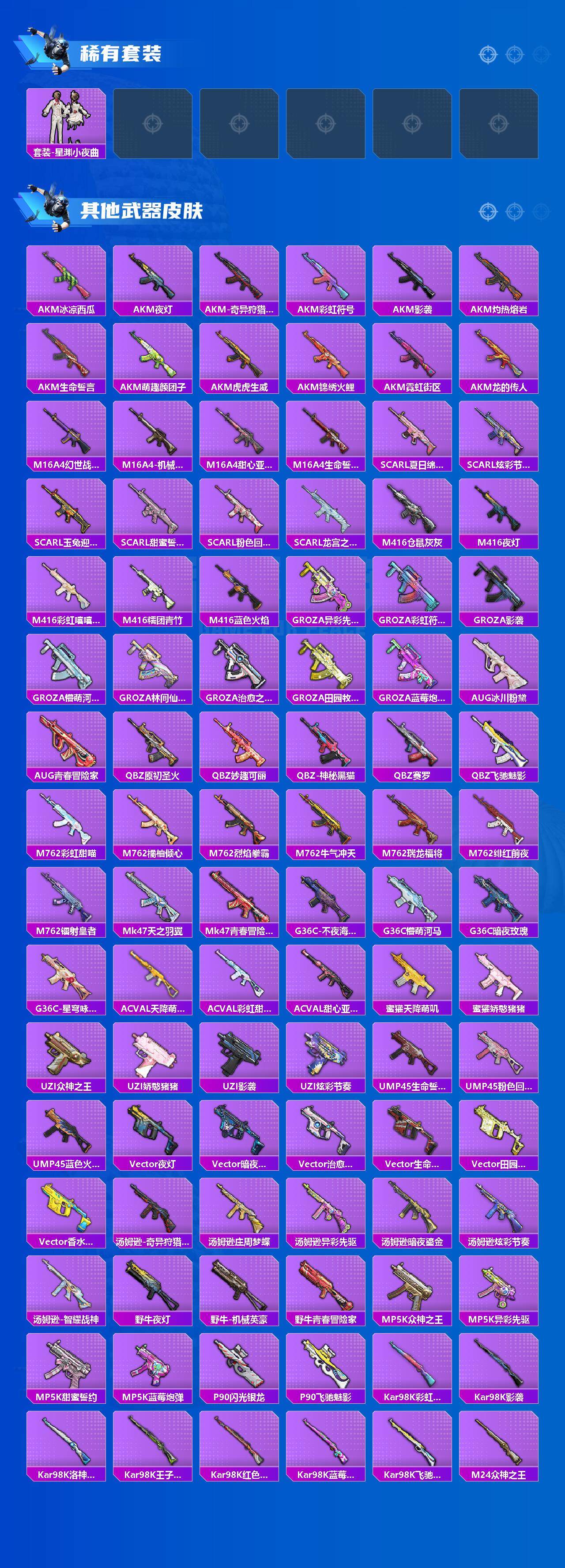 AKM-炫紫旋律,SCAR-L-童趣迷兔,M416-心之恋语,AUG-妙趣可丽,UZI-绮梦青鸾,UMP45-恐龙拽拽,Kar98K-伏魔团,Kar98K-巳巳如意,M24-暗星紫秘,AWM-花间之火,平底锅-林间仙鹿