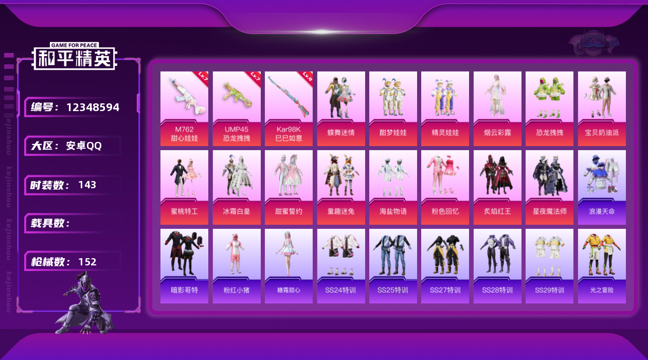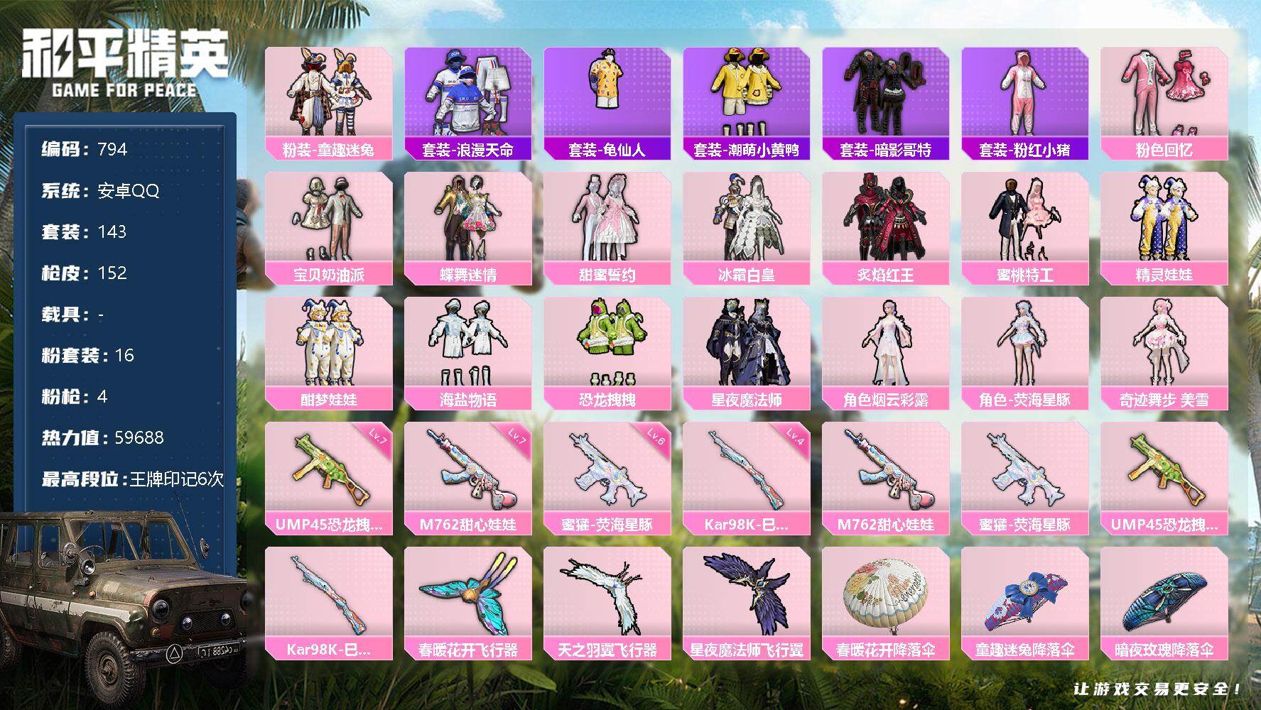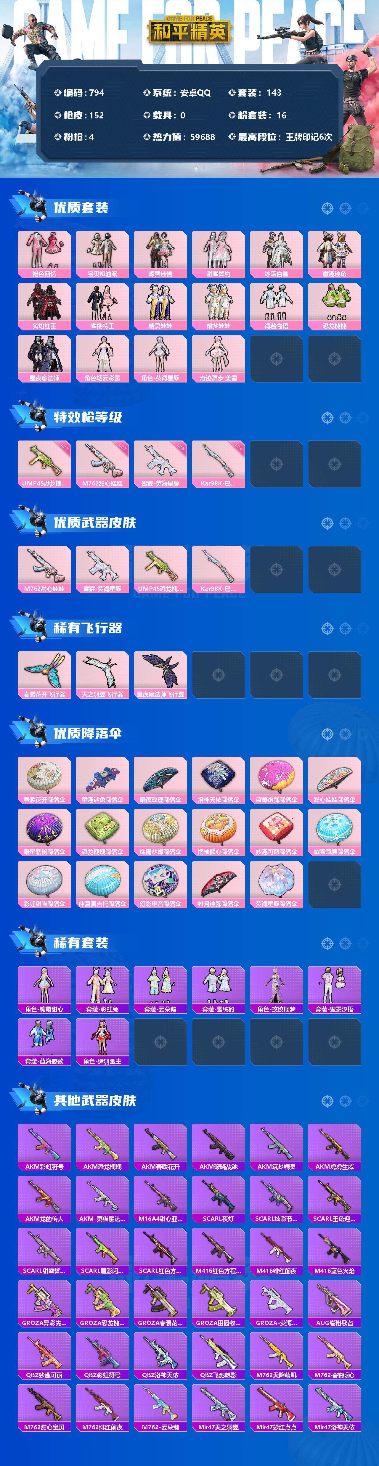 [12348594]【商品标题】:安卓 手Q-16粉装-4特效枪-0载具-3粉色飞行器-59688热力值-6王牌印记-143套装-152枪皮 【热门品类】:粉装-童趣迷兔,套装-浪漫天命,套装-龟仙人,套装-潮萌小黄鸭,套装-暗影哥特,套装-粉红小猪 【粉色套装】:粉装-粉色回忆,粉装-宝贝奶油派,粉装-蝶舞迷情,粉装-甜蜜誓约,粉装-冰霜白皇,粉装-童趣迷兔,粉装-炙焰红王,粉装-蜜桃特工,粉装-精灵娃娃,粉装-酣梦娃娃,粉装-海盐物语,粉装-恐龙拽拽,粉装-星夜魔法师,角色-烟云彩露,角色-荧海星豚,角色-奇迹舞步 美雪 【粉色枪皮等级】:M762-甜心娃娃(七级),蜜獾-荧海星豚(六级),UMP45-恐龙拽拽(七级),Kar98K-巳巳如意(四级) 【粉色枪皮】:M762-甜心娃娃,蜜獾-荧海星豚,UMP45-恐龙拽拽,Kar98K-巳巳如意 【粉色飞行器】:春暖花开飞行器,天之羽翼飞行器,星夜魔法师飞行翼 【粉色降落伞】:春暖花开降落伞,童趣迷兔降落伞,暗夜玫瑰降落伞,洛神天依降落伞,蓝莓炮弹降落伞,甜心娃娃降落伞,暗星紫秘降落伞,恐龙拽拽降落伞,庄周梦蝶降落伞,橘柚倾心降落伞,妙趣可丽降落伞,绒雪飘舞降落伞,彩虹甜喵降落伞,仲夏莫吉托降落伞,幻彩电音降落伞,绯月迷踪降落伞,荧海星豚降落伞 【稀有套装】:套装-龟仙人,角色-糖霜甜心,套装-彩虹兔,套装-云朵鹅,套装-雪绒豹,角色-玫纹锢梦,套装-蜜露汐语,套装-蓝海鲸歌,角色-绛羽幽主 【稀有枪皮】:AKM-彩虹符号,AKM-恐龙拽拽,AKM-春暖花开,AKM-破晓战魂,AKM-筑梦精灵,AKM-虎虎生威,AKM-龙的传人,AKM-灵猫魔法师,M16A4-甜心亚梦,SCAR-L-夜灯,SCAR-L-炫彩节奏,SCAR-L-玉兔迎春,SCAR-L-甜蜜誓约,SCAR-L-碧影闪光,SCAR-L-红色方程式,M416-红色方程式,M416-绯红前夜,M416-蓝色火焰,GROZA-异彩先驱,GROZA-恐龙拽拽,GROZA-春暖花开,GROZA-田园牧歌,GROZA-荧海星豚,AUG-耀粉歌者,QBZ-妙趣可丽,QBZ-彩虹符号,QBZ-洛神天依,QBZ-飞驰魅影,M762-天降萌叽,M762-橘柚倾心,M762-甜心宝贝,M762-绯红前夜,M762-云朵鹅,Mk47-天之羽翼,Mk47-妙红点点,Mk47-洛神天依,G36C