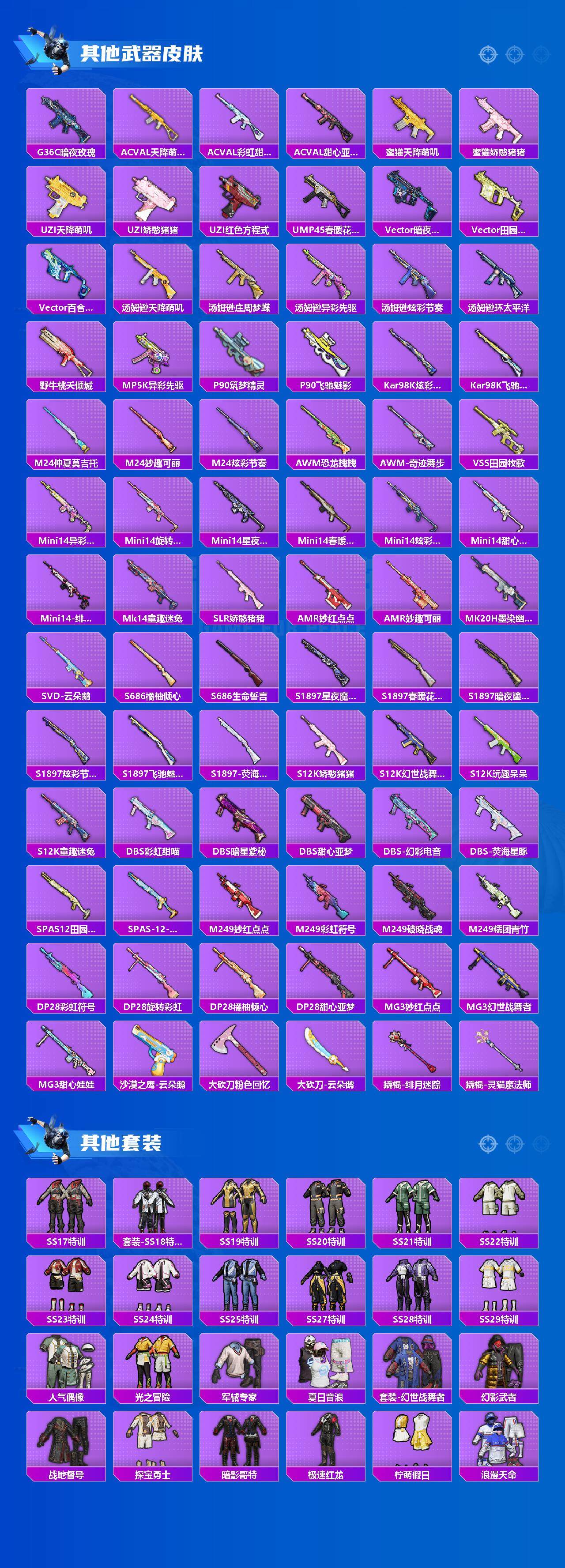 【稀有枪皮】:AKM-彩虹符号,AKM-恐龙拽拽,AKM-春暖花开,AKM-破晓战魂,AKM-筑梦精灵,AKM-虎虎生威,AKM-龙的传人,AKM-灵猫魔法师,M16A4-甜心亚梦,SCAR-L-夜灯,SCAR-L-炫彩节奏,SCAR-L-玉兔迎春,SCAR-L-甜蜜誓约,SCAR-L-碧影闪光,SCAR-L-红色方程式,M416-红色方程式,M416-绯红前夜,M416-蓝色火焰,GROZA-异彩先驱,GROZA-恐龙拽拽,GROZA-春暖花开,GROZA-田园牧歌,GROZA-荧海星豚,AUG-耀粉歌者,QBZ-妙趣可丽,QBZ-彩虹符号,QBZ-洛神天依,QBZ-飞驰魅影,M762-天降萌叽,M762-橘柚倾心,M762-甜心宝贝,M762-绯红前夜,M762-云朵鹅,Mk47-天之羽翼,Mk47-妙红点点,Mk47-洛神天依,G36C