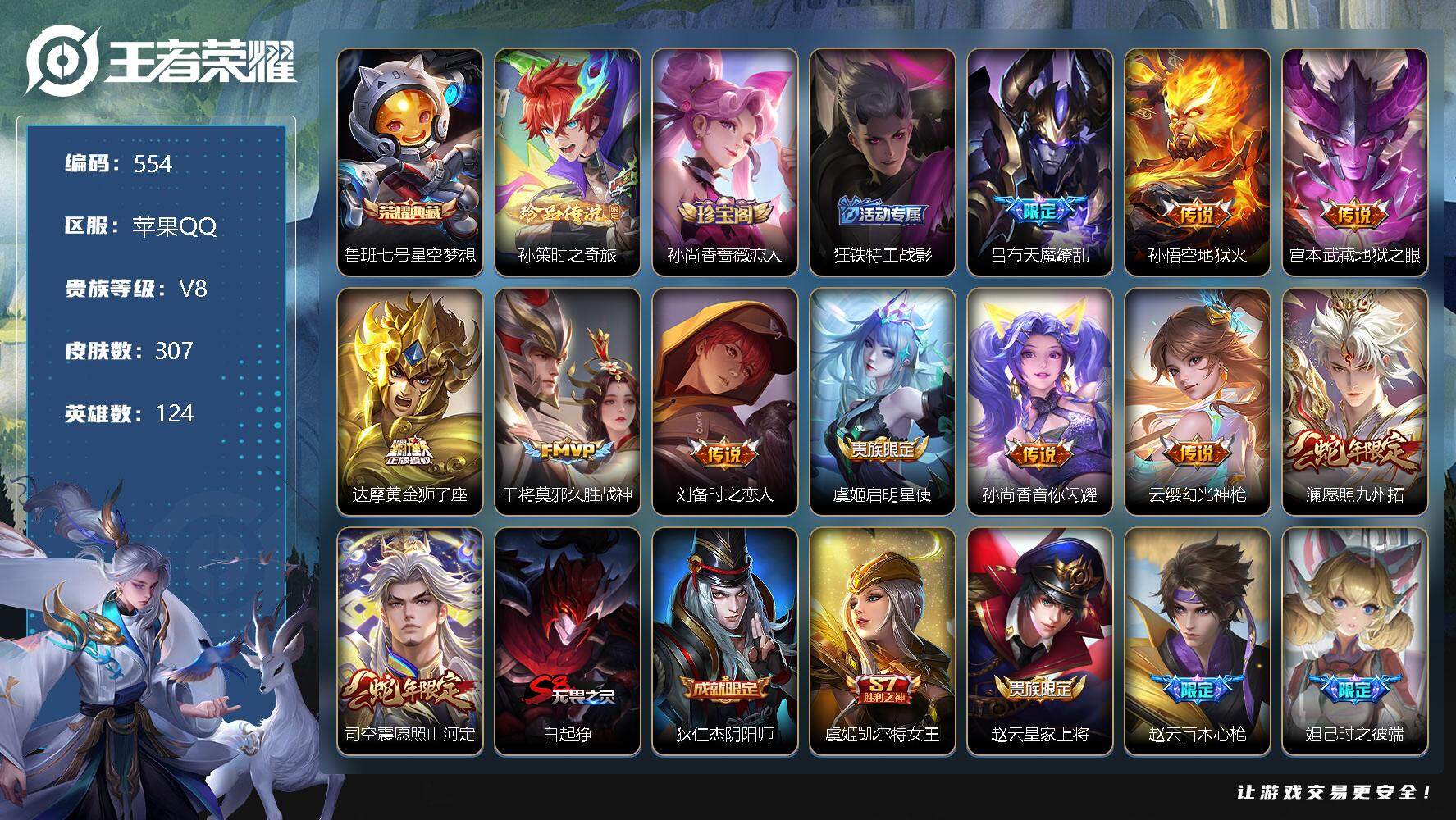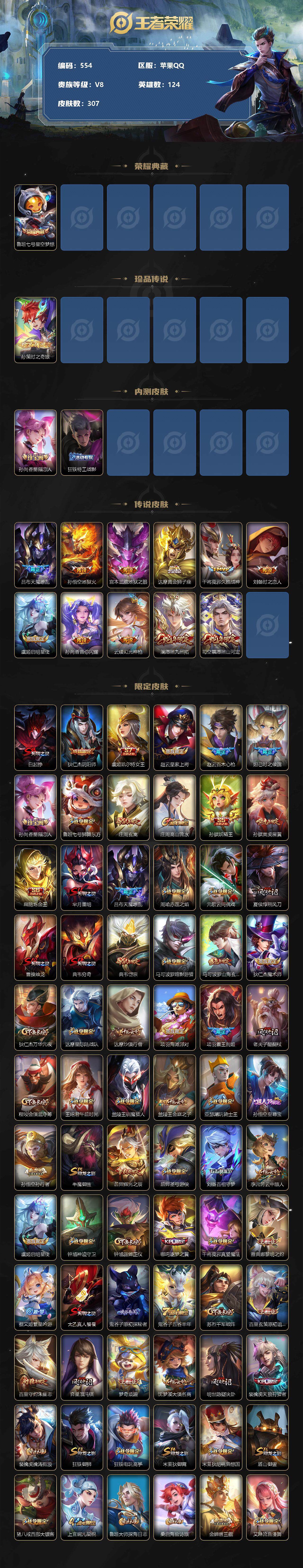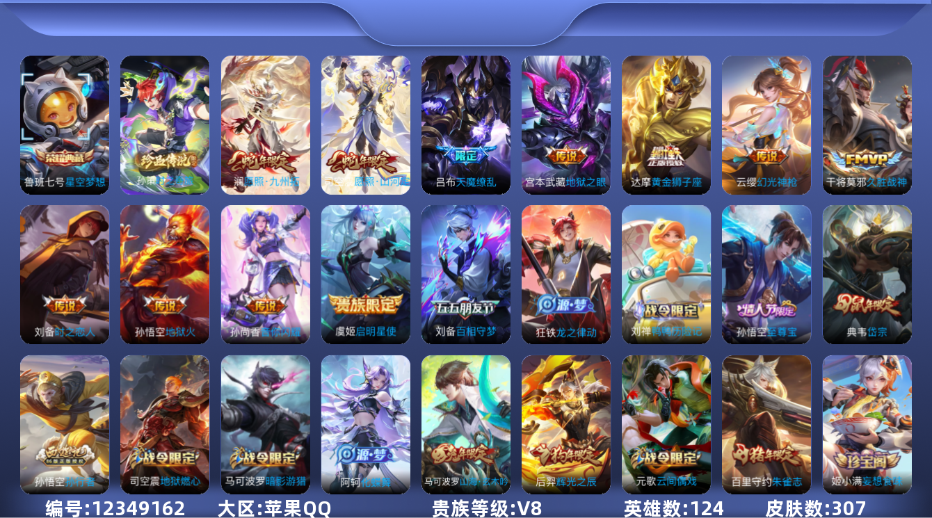 [12349162]【商品标题】:苹果Q-V8-最强王者段位-124英雄-307皮肤-1典藏-0珍品无双-0无双-1珍品传说-11传说-80史诗
