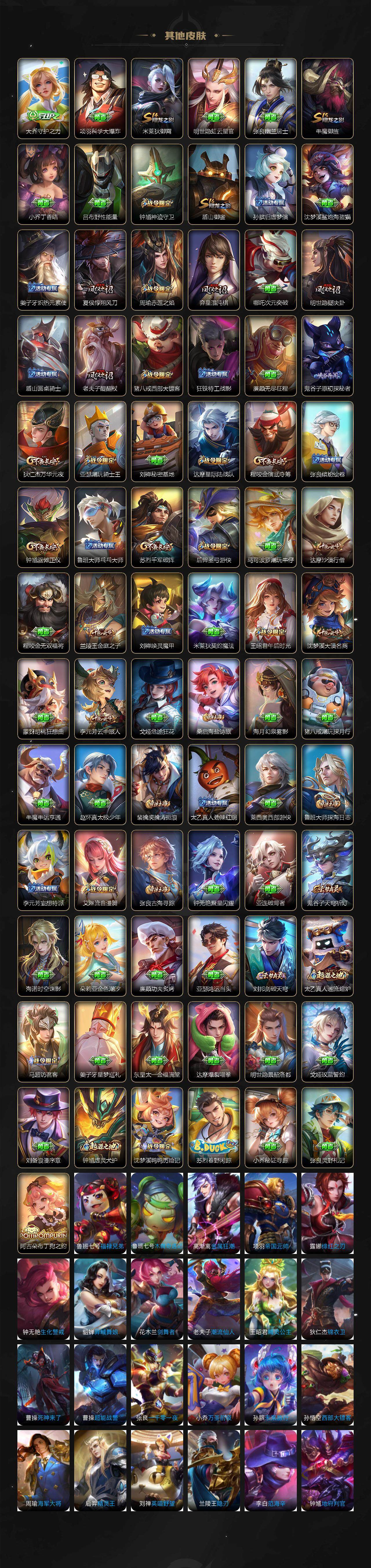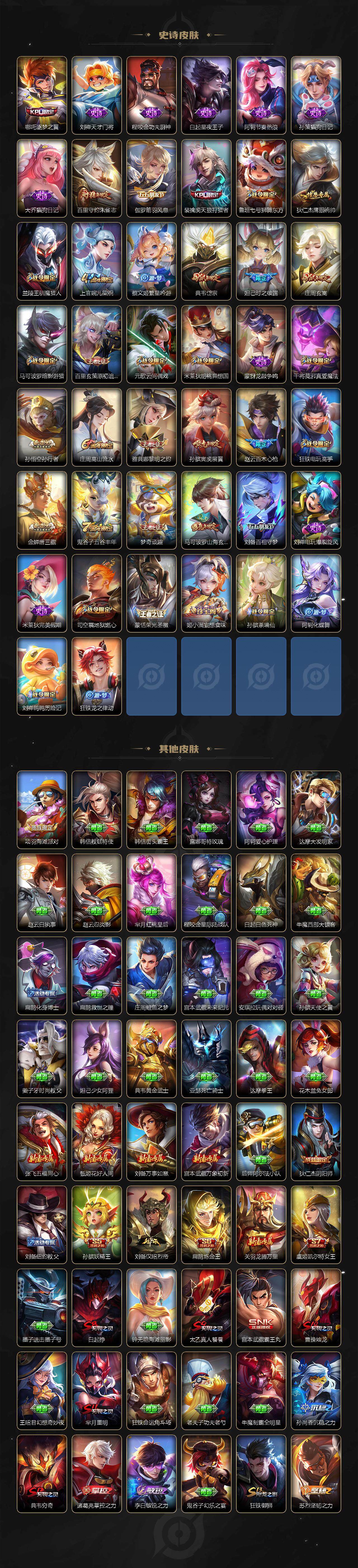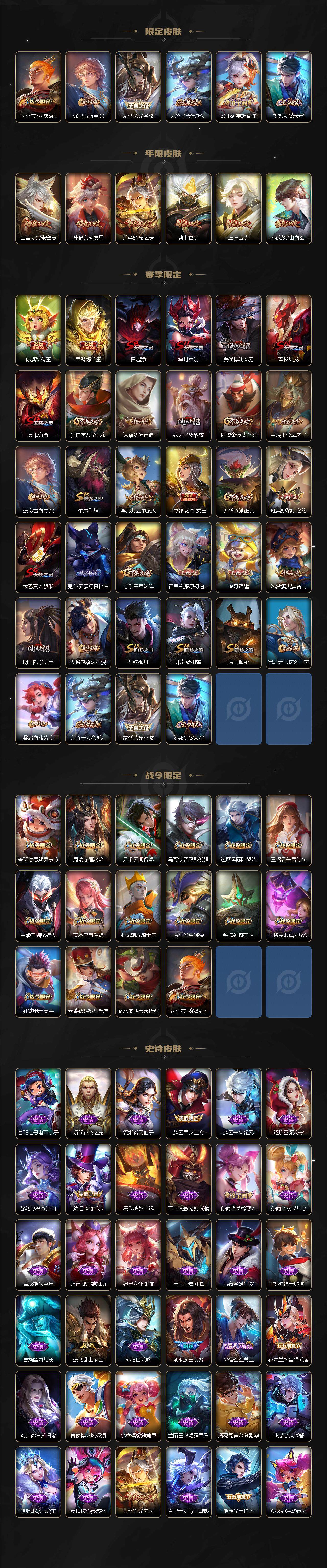 【限定皮肤】:白起狰,狄仁杰阴阳师,虞姬凯尔特女王,赵云皇家上将,赵云百木心枪,妲己时之彼端,孙尚香蔷薇恋人,鲁班七号狮舞东方,庄周玄嵩,庄周高山流水,孙膑妖精王,孙膑寅虎展翼,扁鹊炼金王,芈月重明,吕布天魔缭乱,周瑜赤莲之焰,元歌云间偶戏,夏侯惇朔风刀,曹操烛龙,典韦穷奇,典韦岱宗,马可波罗暗影游猎,马可波罗山海玄木吟,狄仁杰魔术师,狄仁杰万华元夜,达摩星际陆战队,达摩沙漠行僧,项羽海滩派对,项羽霸王别姬,老夫子醍醐杖,程咬金演武夺筹,王昭君午后时光,兰陵王驯魔猎人,兰陵王金庭之子,亚瑟潮玩骑士王,孙悟空至尊宝,孙悟空孙行者,牛魔御旌,后羿辉光之辰,后羿圣弓游侠,刘备百相守梦,李元芳云中旅人,虞姬启明星使,钟馗神迹守卫,钟馗驱傩正仪,哪吒逐梦之翼,干将莫邪真爱魔法,雅典娜黎明之约,蔡文姬繁星吟游,太乙真人饕餮,鬼谷子原初探秘者,鬼谷子五谷丰年,苏烈千军破阵,百里玄策原初追逐者,百里守约朱雀志,弈星混沌棋,梦奇顽趣,沈梦溪大漠名商,明世隐疑决卦,裴擒虎天狼狩猎者,裴擒虎擒涛扼浪,狂铁御狮,狂铁电玩高手,米莱狄御霄,米莱狄胡桃异想国,盾山御銮,猪八戒西部大镖客,上官婉儿梁祝,鲁班大师探海日志,桑启海盐诗旅,金蝉唐三藏,艾琳流音漫舞,司空震地狱燃心,张良古海寻踪,蒙恬荣光圣徽,鬼谷子天穹祈灯,姬小满妄想食味,刘邦剑破天穹