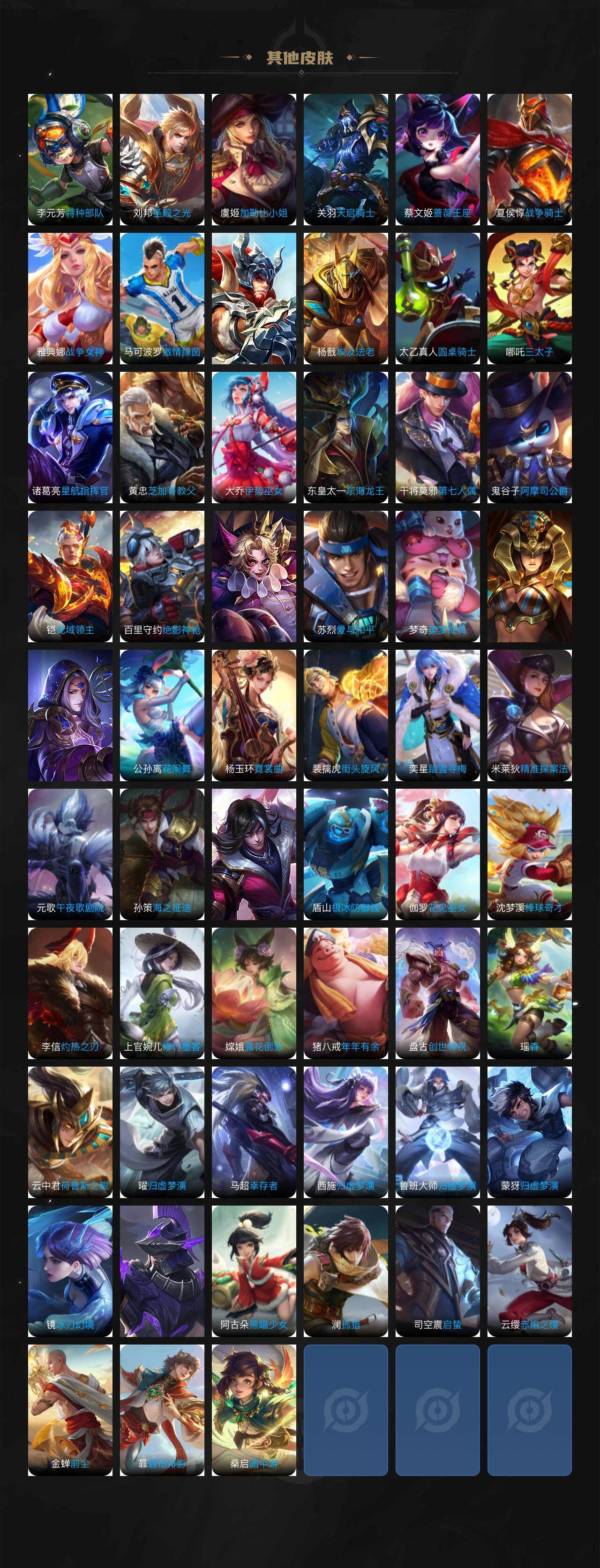伽罗箭羽风息,大乔猫狗日记,孙策猫狗日记,阿轲节奏热浪,露娜紫霞仙子,诸葛亮黄金分割率,韩信白龙吟,项羽苍穹之光,雅典娜冰冠公主,鲁班七号电玩小子,蒙犽龙鼓争鸣,嬴政摇滚巨星,刘禅绅士熊喵,刘禅天才门将,白起星夜王子,安琪拉心灵骇客,程咬金功夫厨神,刘邦德古拉伯爵,兰陵王暗隐猎兽者,曹操幽灵船长,宫本武藏鬼剑武藏,亚瑟心灵战警,蔡文姬舞动绿茵,廉颇地狱岩魂,小乔缤纷独角兽,夏侯惇乘风破浪,花木兰水晶猎龙者,铠曙光守护者,墨子金属风暴,百里玄策原初追逐者,吕布圣诞狂欢,貂蝉圣诞恋歌,百里守约特工魅影,雅典娜黎明之约,刘备百相守梦,刘禅电玩·爆裂旋风