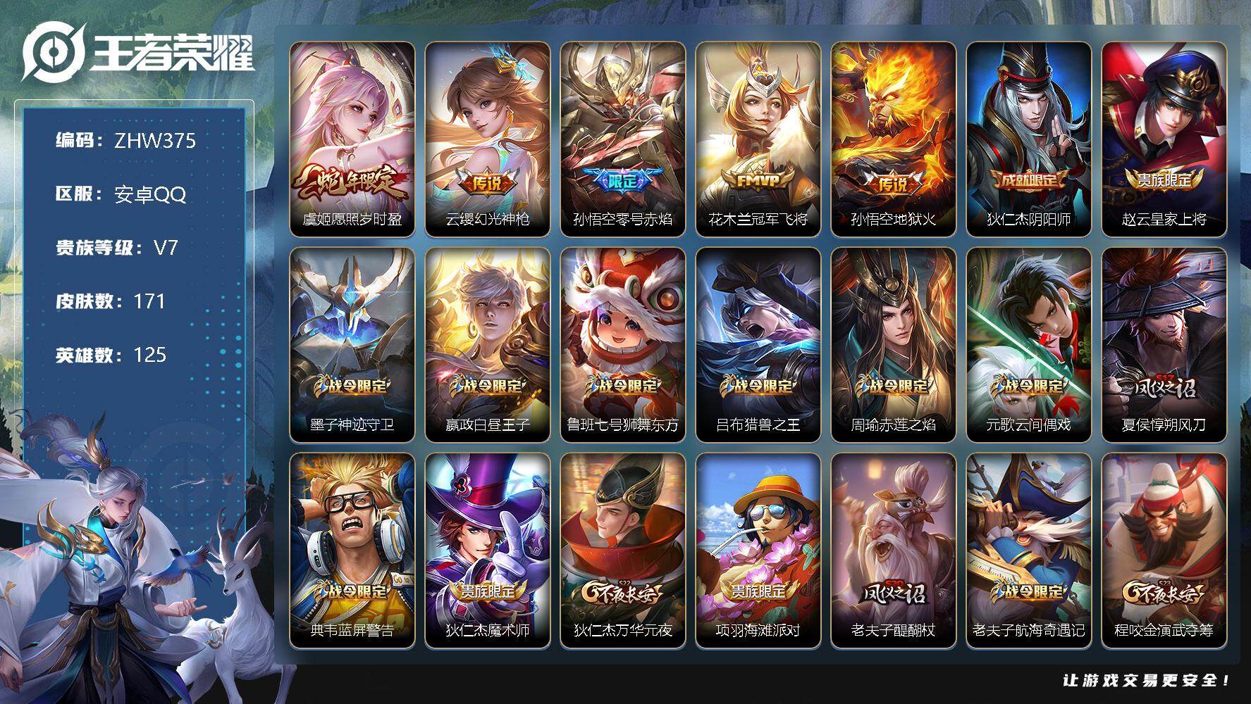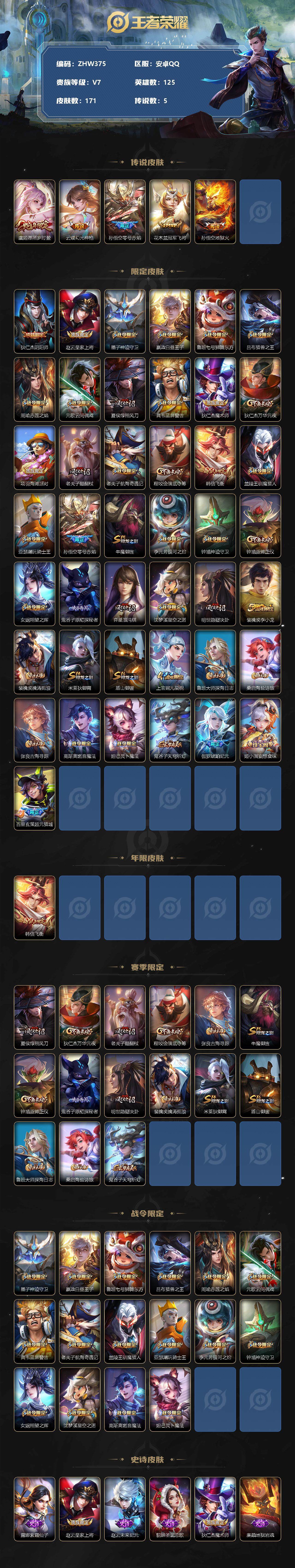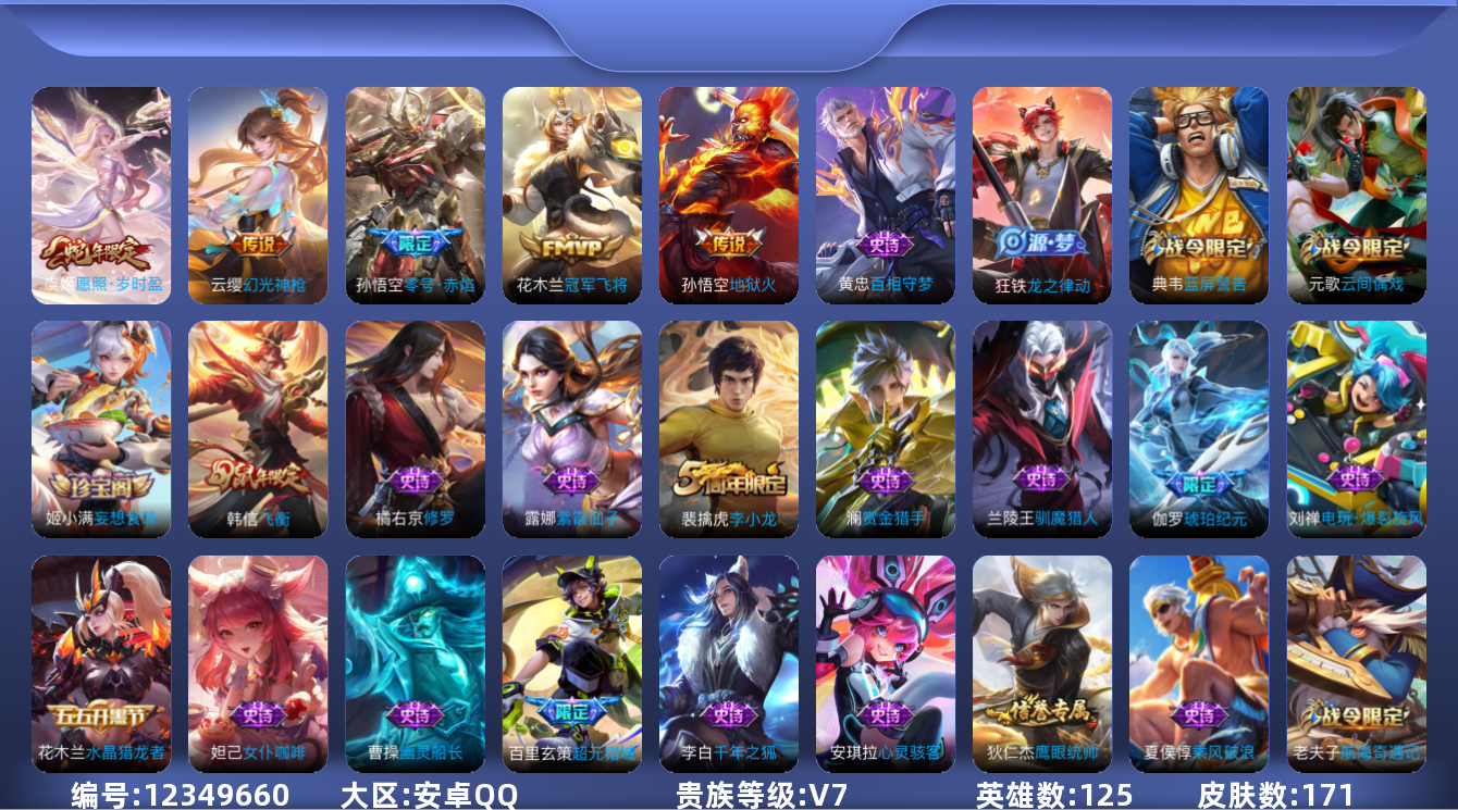 [12349660]【商品标题】:安卓Q-V7-至尊星耀I段位-125英雄-171皮肤-0典藏-0珍品无双-0无双-0珍品传说-5传说-46史诗