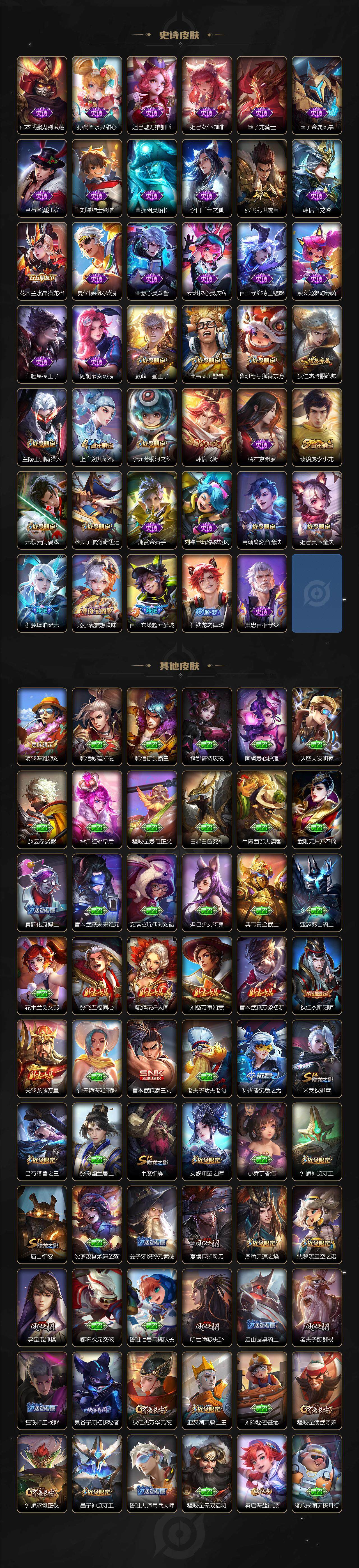 【限定皮肤】:狄仁杰阴阳师,赵云皇家上将,墨子神迹守卫,嬴政白昼王子,鲁班七号狮舞东方,吕布猎兽之王,周瑜赤莲之焰,元歌云间偶戏,夏侯惇朔风刀,典韦蓝屏警告,狄仁杰魔术师,狄仁杰万华元夜,项羽海滩派对,老夫子醍醐杖,老夫子航海奇遇记,程咬金演武夺筹,韩信飞衡,兰陵王驯魔猎人,亚瑟潮玩骑士王,孙悟空零号赤焰,牛魔御旌,李元芳银河之约,钟馗神迹守卫,钟馗驱傩正仪,女娲朔望之晖,鬼谷子原初探秘者,弈星混沌棋,沈梦溪星空之诺,明世隐疑决卦,裴擒虎李小龙,裴擒虎擒涛扼浪,米莱狄御霄,盾山御銮,上官婉儿梁祝,鲁班大师探海日志,桑启海盐诗旅,张良古海寻踪,高渐离燃音魔法,妲己灵卜魔法,鬼谷子天穹祈灯,伽罗琥珀纪元,姬小满妄想食味,百里玄策超元猎域