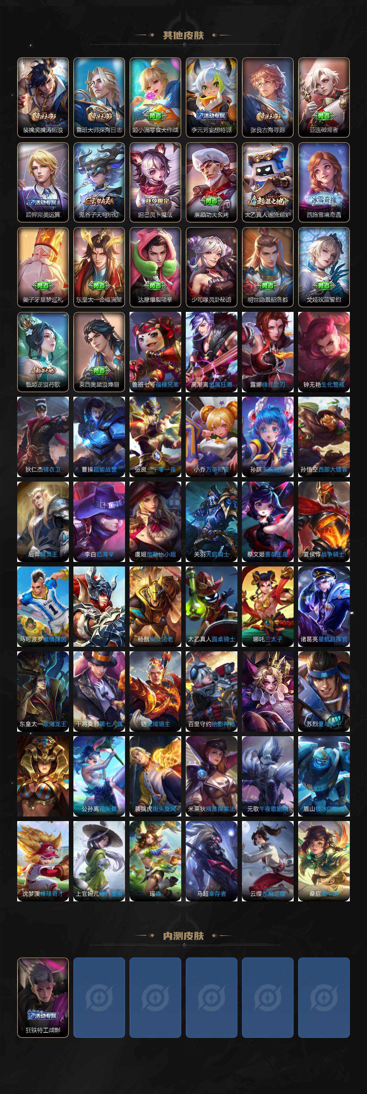 米莱狄御霄,牛魔御旌,盾山御銮,夏侯惇朔风刀,明世隐疑决卦,老夫子醍醐杖,鬼谷子原初探秘者,狄仁杰万华元夜,程咬金演武夺筹,钟馗驱傩正仪,吕布猎兽之王,嬴政白昼王子,女娲朔望之晖,典韦蓝屏警告,钟馗神迹守卫,鲁班七号狮舞东方,沈梦溪星空之诺,李元芳银河之约,元歌云间偶戏,弈星混沌棋,桑启海盐诗旅,裴擒虎擒涛扼浪,鲁班大师探海日志,张良古海寻踪