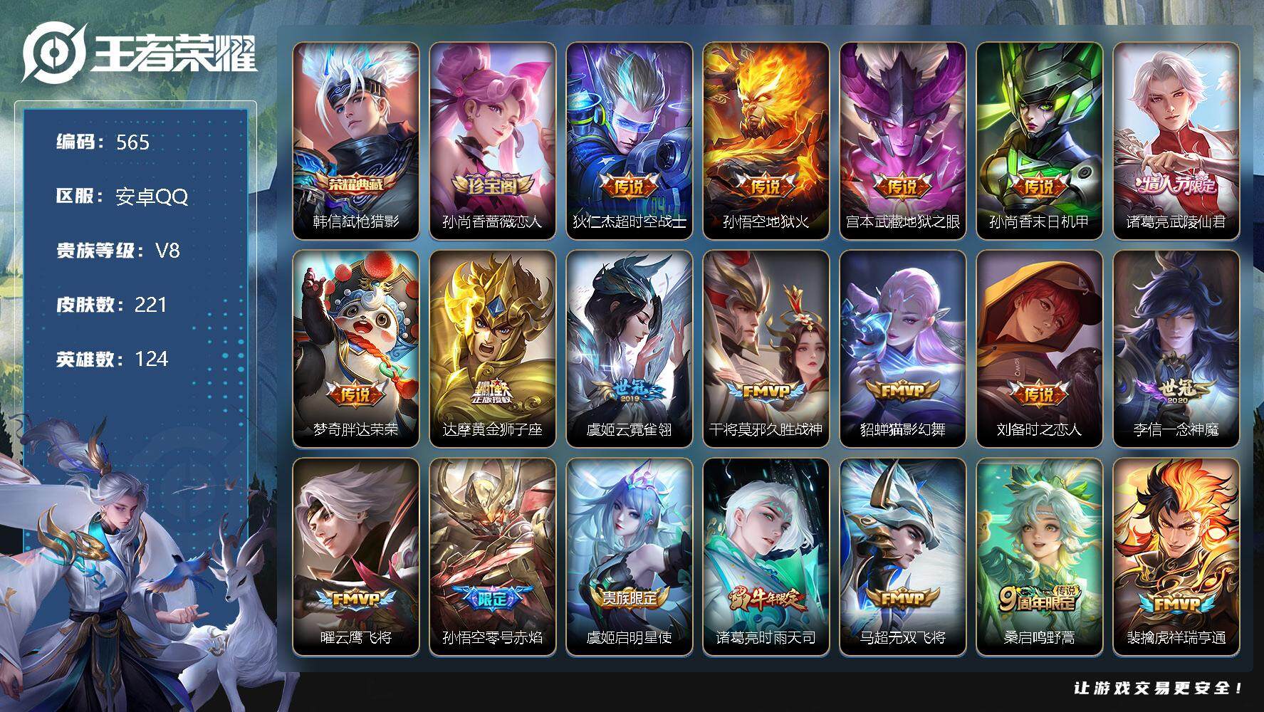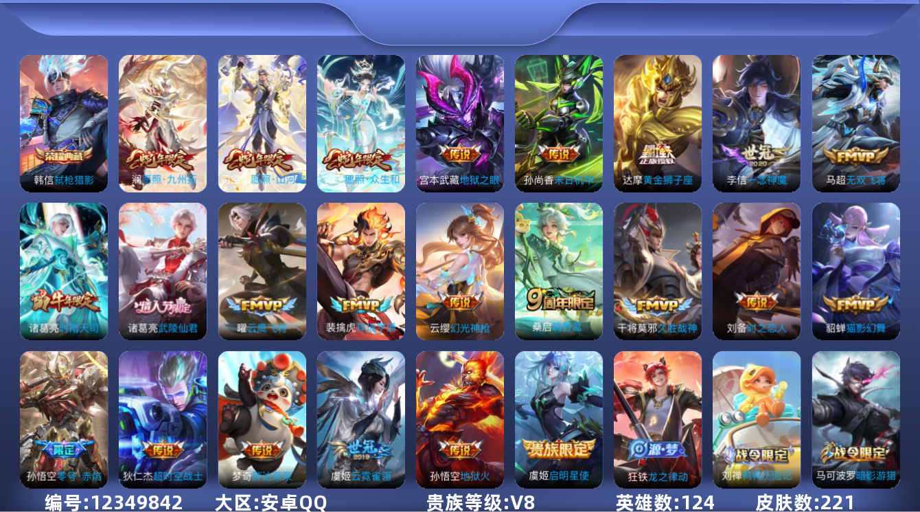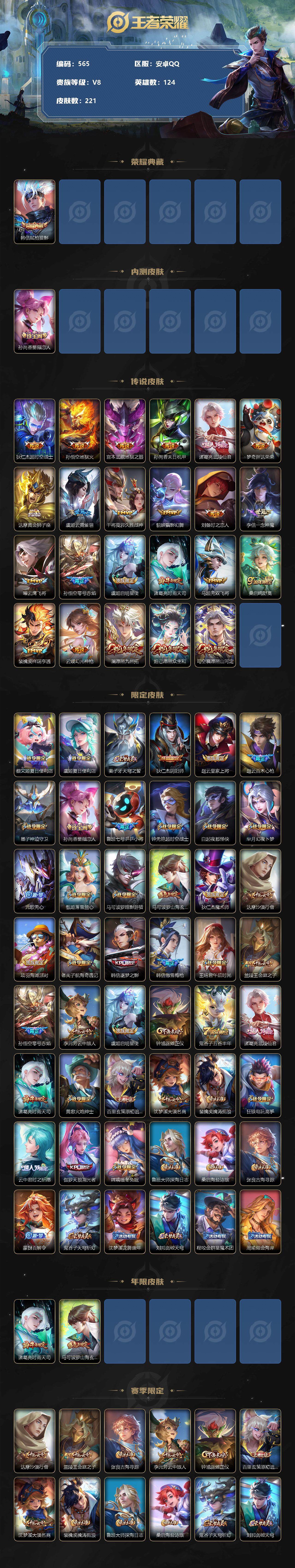[12349842]【商品标题】:安卓Q-V8-永恒钻石I段位-124英雄-221皮肤-1典藏-0珍品无双-0无双-0珍品传说-23传说-66史诗