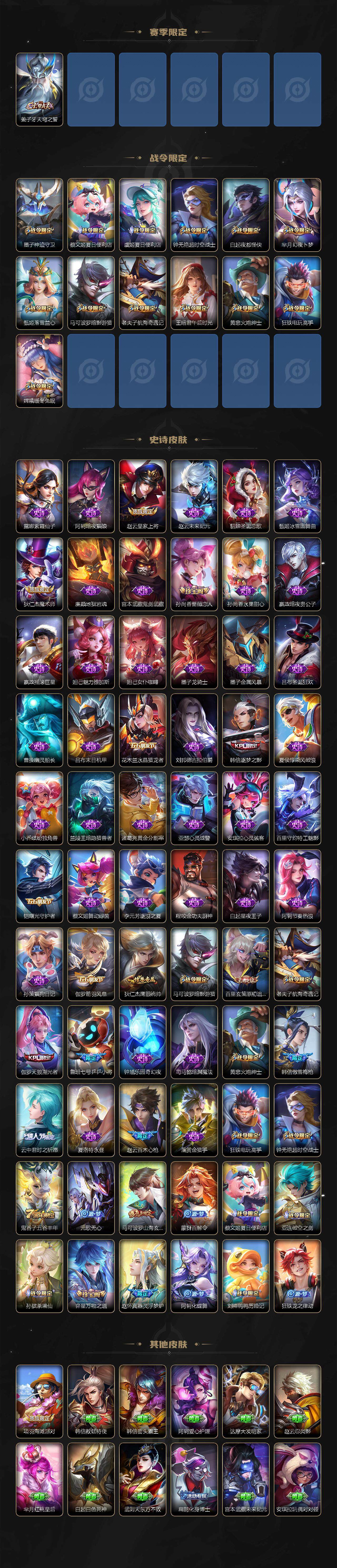 【限定皮肤】:蔡文姬夏日便利店,虞姬夏日便利店,姜子牙天穹之誓,狄仁杰阴阳师,赵云皇家上将,赵云百木心枪,墨子神迹守卫,孙尚香蔷薇恋人,鲁班七号乒乒小将,钟无艳超时空战士,白起夜都怪侠,芈月幻夜卜梦,元歌无心,甄姬落雪兰心,马可波罗暗影游猎,马可波罗山海玄木吟,狄仁杰魔术师,达摩沙漠行僧,项羽海滩派对,老夫子航海奇遇记,韩信逐梦之影,韩信傲雪梅枪,王昭君午后时光,兰陵王金庭之子,孙悟空零号赤焰,李元芳云中旅人,虞姬启明星使,钟馗驱傩正仪,鬼谷子五谷丰年,诸葛亮武陵仙君,诸葛亮时雨天司,黄忠火炮绅士,百里玄策原初追逐者,沈梦溪大漠名商,裴擒虎擒涛扼浪,狂铁电玩高手,云中君时之祈愿,伽罗天狼溯光者,嫦娥暖冬兔眠,鲁班大师探海日志,桑启海盐诗旅,张良古海寻踪,蒙犽百解令,鬼谷子天穹祈灯,沈梦溪龙舞盛年,刘邦剑破天穹,程咬金群星魔术团,周瑜熔金海岸