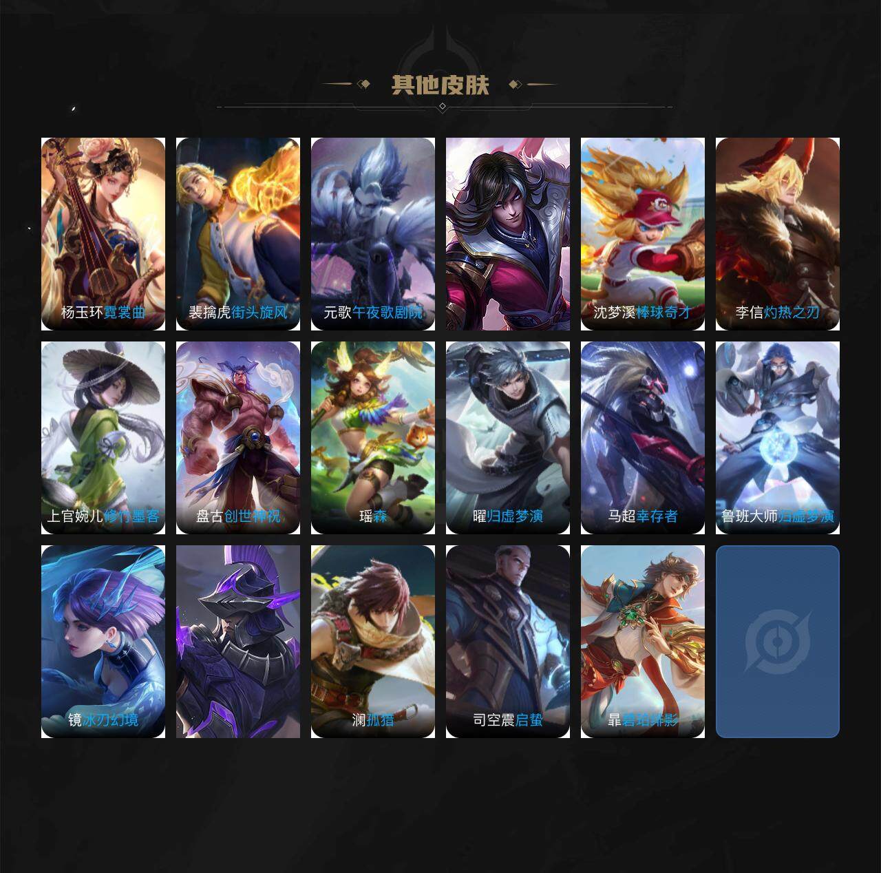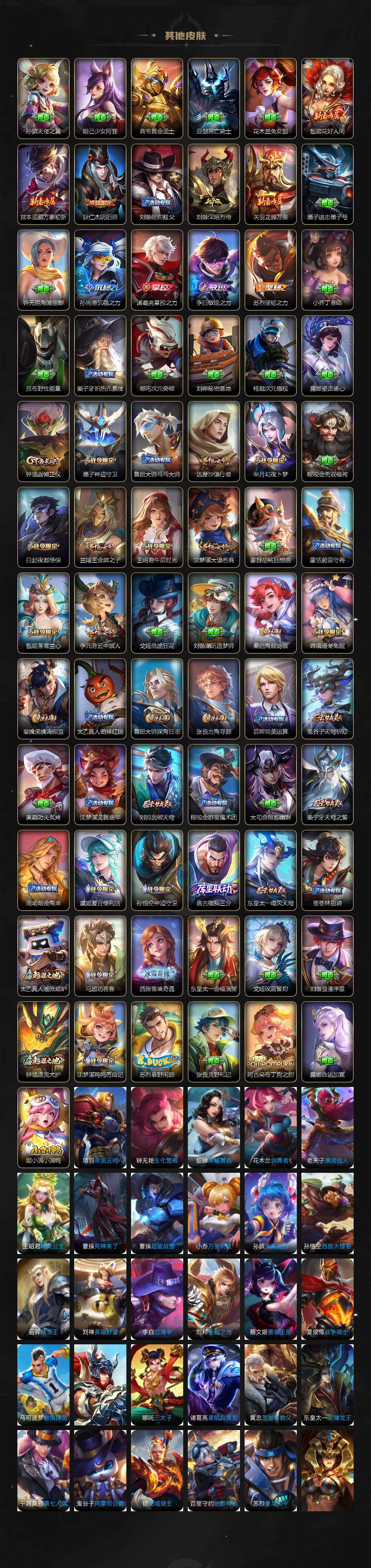 伽罗箭羽风息,李元芳逐浪之夏,孙策猫狗日记,阿轲节奏热浪,露娜紫霞仙子,诸葛亮黄金分割率,阿轲暗夜猫娘,吕布末日机甲,墨子龙骑士,嬴政摇滚巨星,白起星夜王子,安琪拉心灵骇客,程咬金功夫厨神,刘邦德古拉伯爵,兰陵王暗隐猎兽者,曹操幽灵船长,宫本武藏鬼剑武藏,司马懿暗渊魔法,亚瑟心灵战警,钟馗乐园奇幻夜,蔡文姬舞动绿茵,廉颇地狱岩魂,小乔缤纷独角兽,夏侯惇乘风破浪,花木兰水晶猎龙者,铠曙光守护者,墨子金属风暴,百里玄策原初追逐者,吕布圣诞狂欢,貂蝉圣诞恋歌,百里守约特工魅影,嬴政暗夜贵公子,夏洛特永昼,澜赏金猎手,蒙犽百解令,赵怀真器灵·浮梦炉