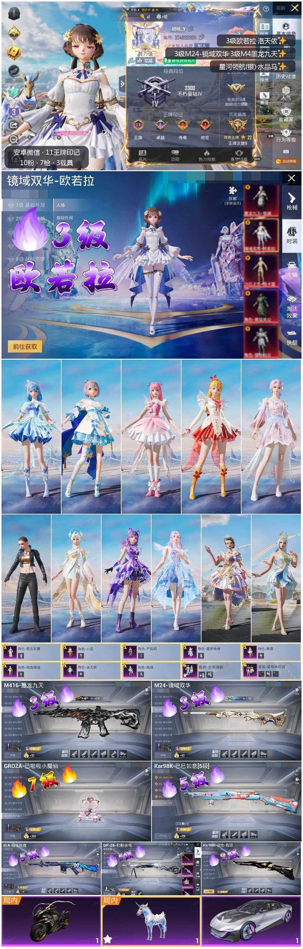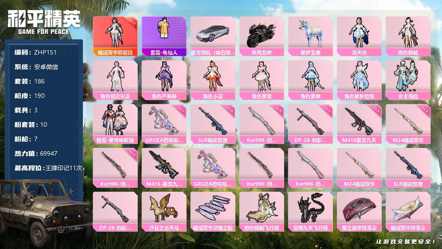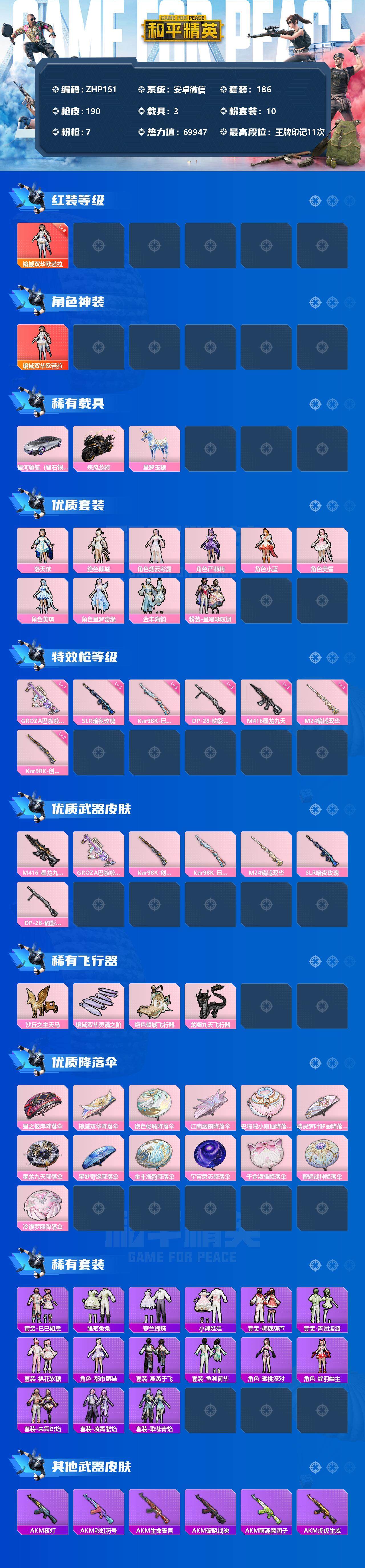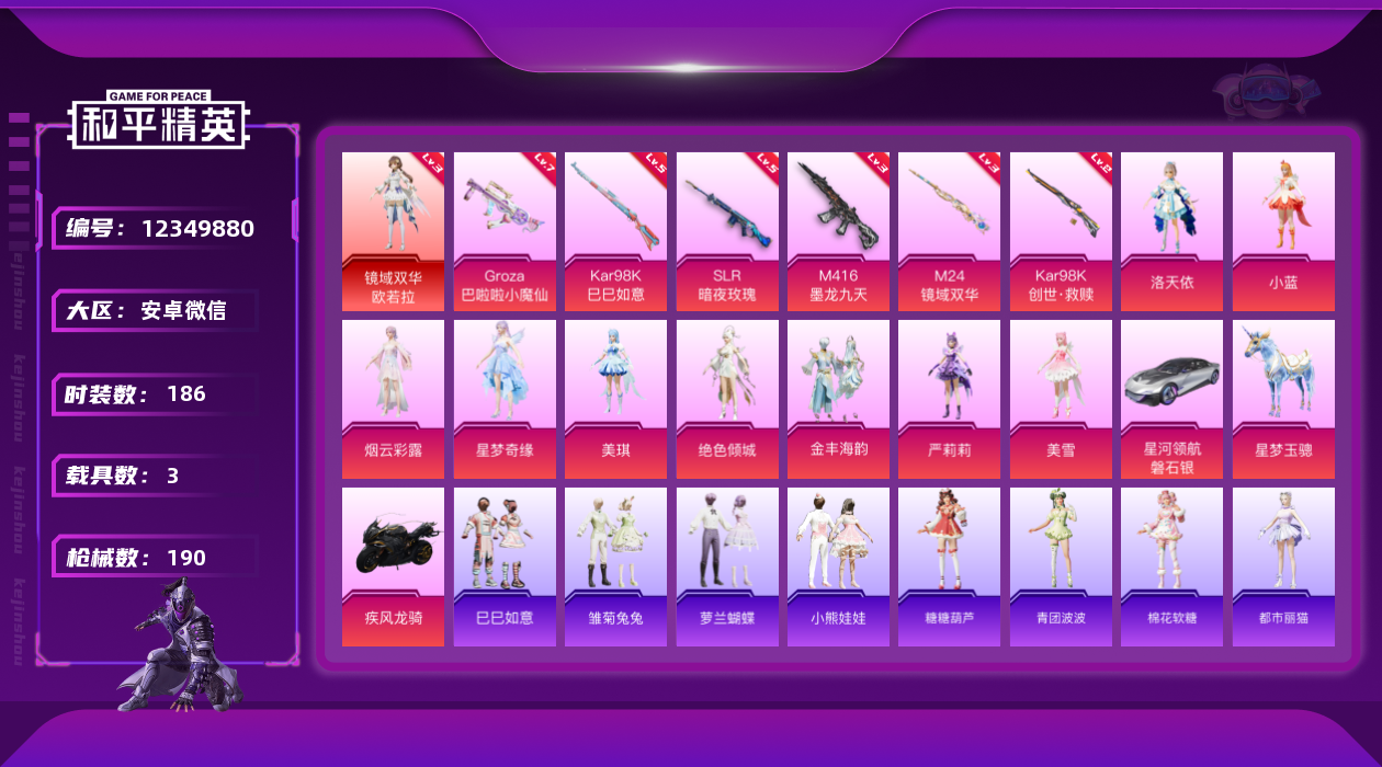 [12349880]【商品标题】:安卓 3级欧若拉1把7级枪!微信-1神装-10粉装-7特效枪-3载具-5粉色飞行器-69947热力值-11王牌印记-186套装-190枪皮