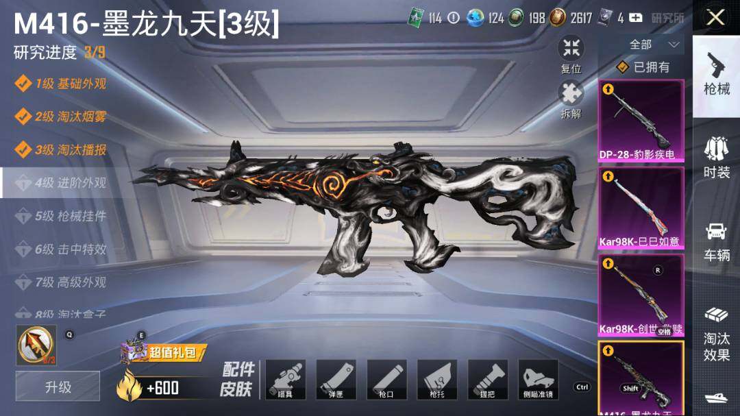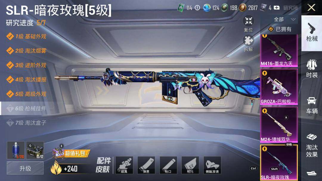 M416-墨龙九天,GROZA-巴啦啦小魔仙,Kar98K-创世·救赎,Kar98K-巳巳如意,M24-镜域双华,SLR-暗夜玫瑰