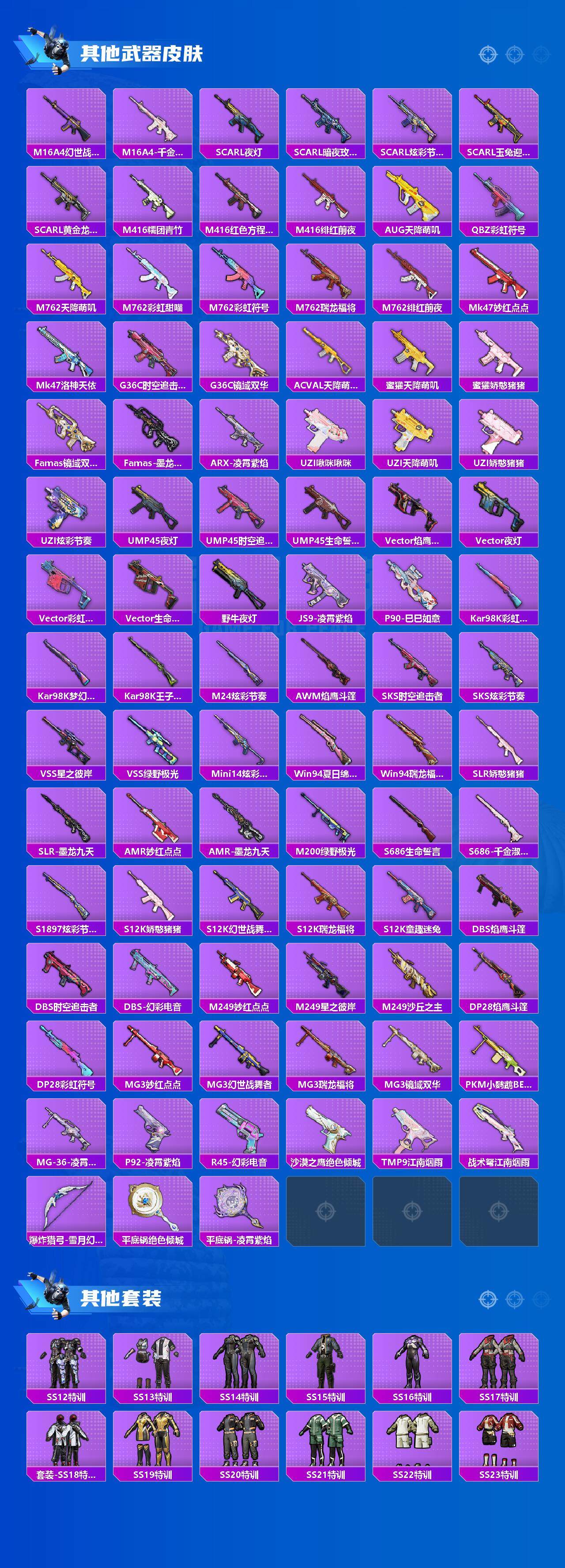 【稀有枪皮】:AKM-夜灯,AKM-彩虹符号,AKM-生命誓言,AKM-破晓战魂,AKM-萌趣颜团子,AKM-虎虎生威,M16A4-幻世战舞者,M16A4-千金淑猫,SCAR-L-夜灯,SCAR-L-暗夜玫瑰,SCAR-L-炫彩节奏,SCAR-L-玉兔迎春,SCAR-L-黄金龙骨,M416-糯团青竹,M416-红色方程式,M416-绯红前夜,AUG-天降萌叽,QBZ-彩虹符号,M762-天降萌叽,M762-彩虹甜喵,M762-彩虹符号,M762-瑞龙福将,M762-绯红前夜,Mk47-妙红点点,Mk47-洛神天依,G36C-镜域双华,G3