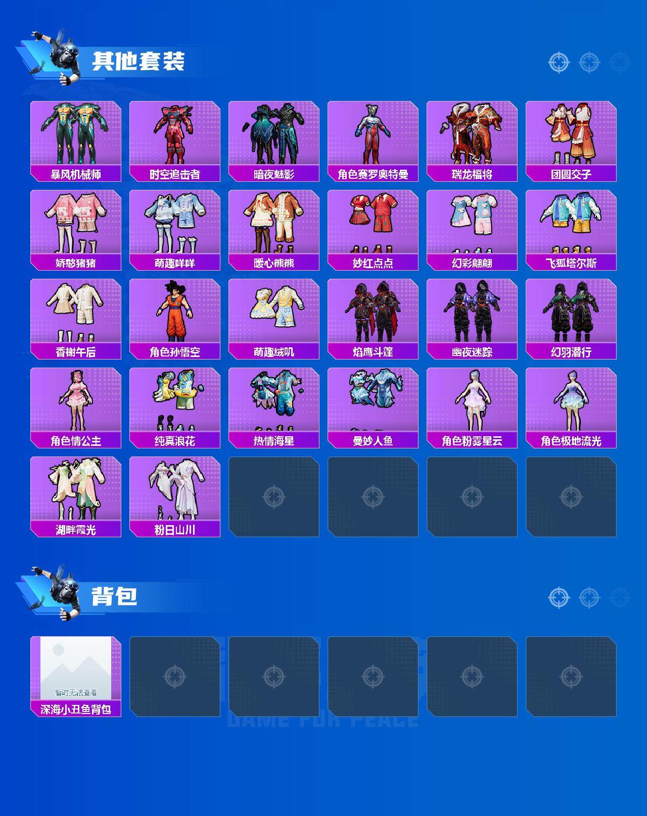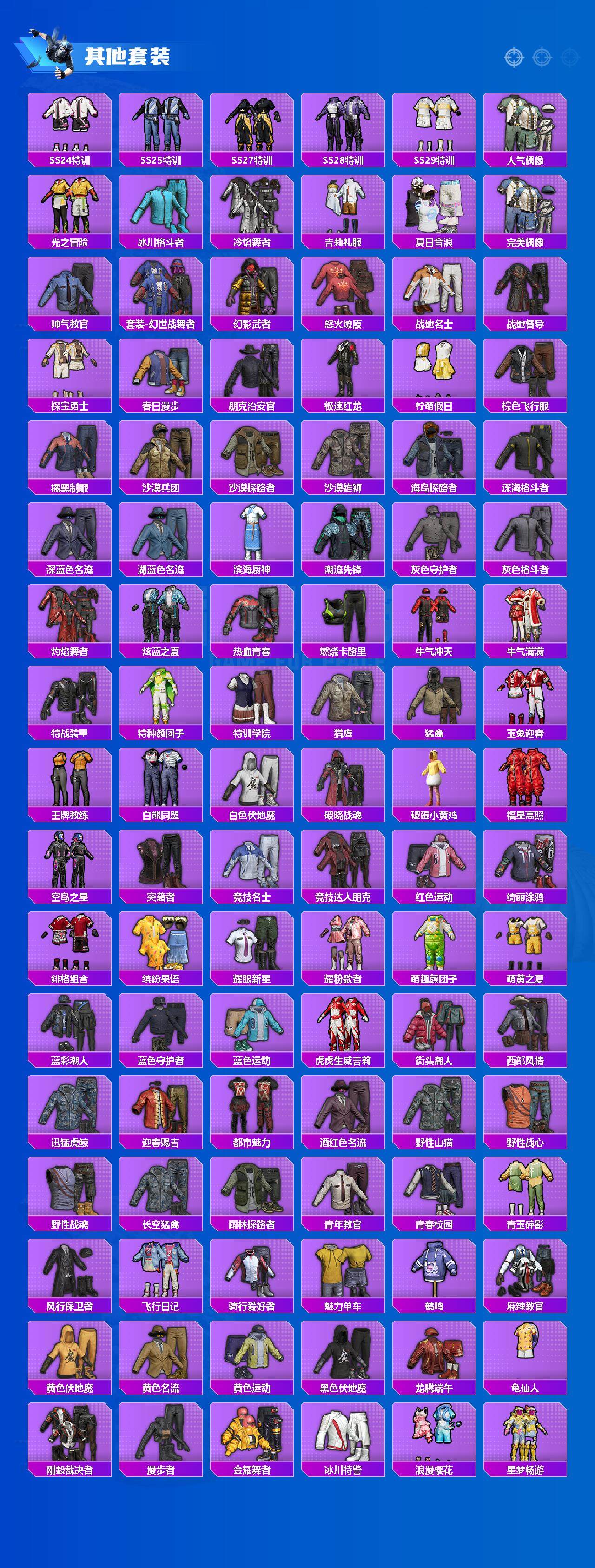 【稀有套装】:套装-龟仙人,套装-巳巳如意,套装-雏菊兔兔,套装-萝兰蝴蝶,套装-小熊娃娃,套装-糖糖葫芦,套装-青团波波,套装-棉花软糖,角色-都市丽猫,套装-燕燕于飞,套装-鱼渊荷华,角色-蜜桃派对,角色-绛羽幽主,套装-朱霞炽焰,套装-凌霄紫焰,套装-擎苍青焰