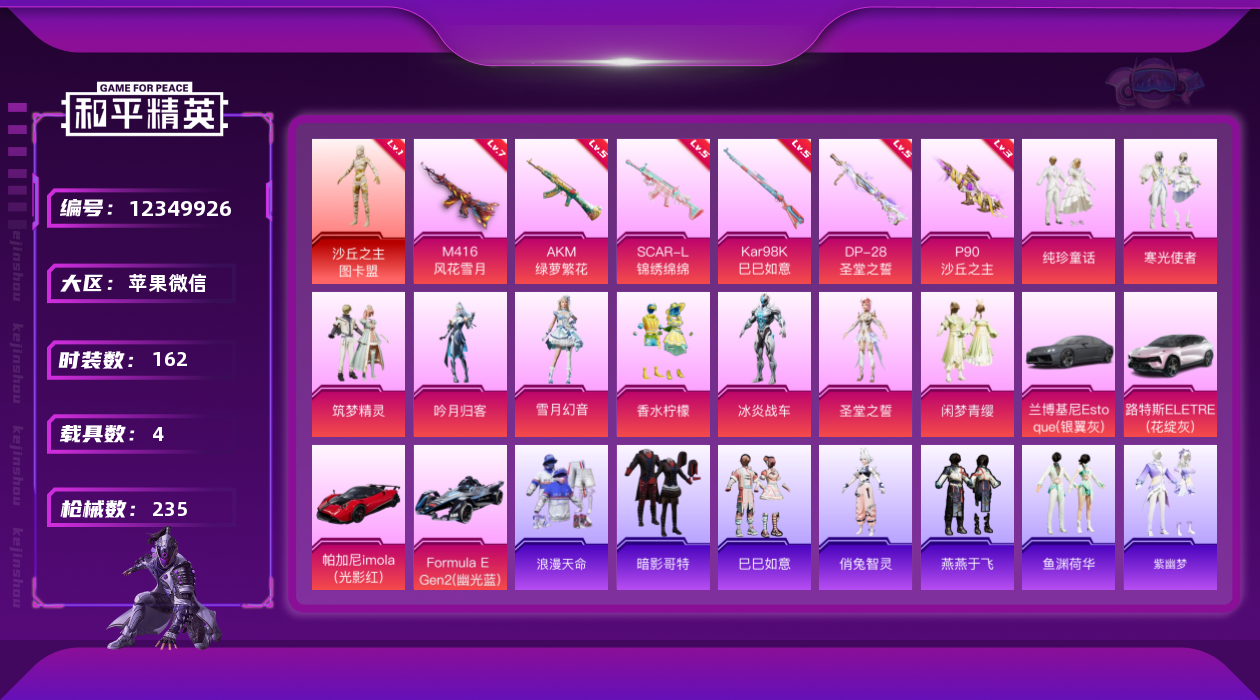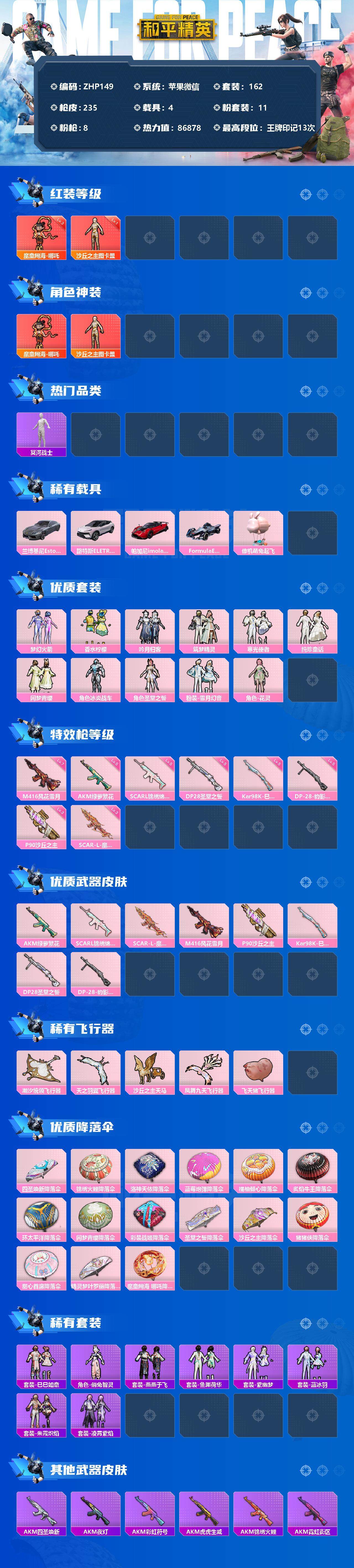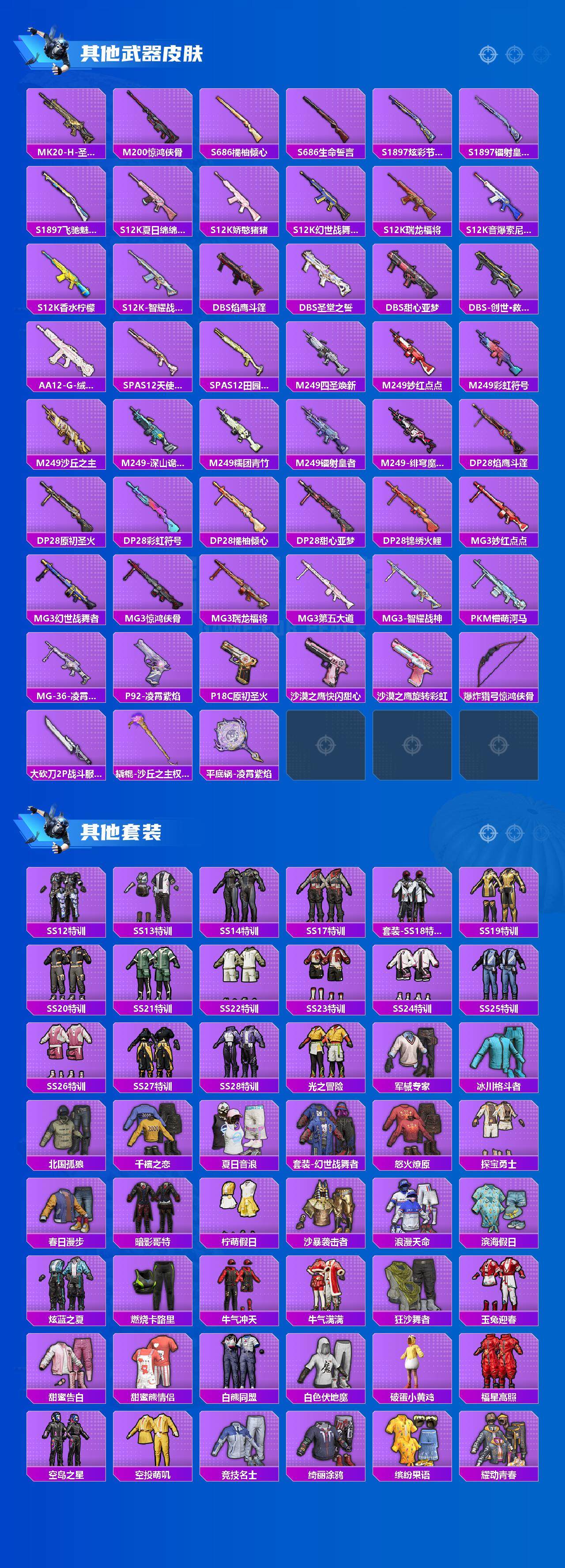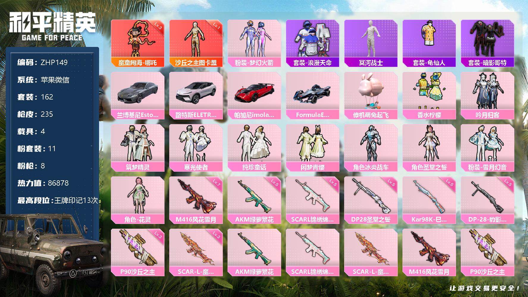 - [12349867]【商品标题】:三级云鸾!苹果 微信-1神装-3粉装-7特效枪-5载具-6粉色飞行器-48422热力值-6王牌印记-70套装-127枪皮 【红色神装等级】:盛世惊鸿-云鸾(三级) 【红色角色神装】:盛世惊鸿-云鸾 【粉色载具】:保时捷Panamera(梦幻青),保时捷918 Spyder(沉静蓝),保时捷Cayenne(激情红),黑曜夜骑,冰绡玉鳞 【粉色套装】:粉装-新星烈龙,粉装-星穹咏叹调,角色-羊梦糖心 【粉色枪皮等级】:M416-灵猫魔法师(三级),AUG-暖羊咩咩(五级),P90-魔童闹海 敖丙(三级),Kar98K-巳巳如意(五级),Mk14-盛世惊鸿(三级),DP-28-豹影疾电(五级),MG3-辉羽雀灵(三级) 【粉色枪皮】:M416-灵猫魔法师,AUG-暖羊咩咩,P90-魔童闹海 敖丙,Kar98K-巳巳如意,Mk14-盛世惊鸿,DP-28-豹影疾电,MG3-辉羽雀灵 【粉色飞行器】:凤舞九天飞行器,雀灵庇佑飞行器,灵猫魔法师飞行器,飞天猪飞行器,灵珠游龙飞行器 【粉色降落伞】:百万伏特降落伞,阿狸红降落伞,齐天大圣降落伞,盛世惊鸿降落伞,樱桃泡泡降落伞,星穹咏叹调降落伞,辉羽雀灵降落伞,冷漠罗丽降落伞,荧海星豚降落伞,灵猫魔法师降落伞,绯穹魔姬降落伞,喜羊羊与灰太狼降落伞,魔童闹海 哪吒降落伞,魔童闹海 敖丙降落伞 【稀有套装】:套装-燕燕于飞,套装-鱼渊荷华,套装-粉恋花,套装-紫幽梦,套装-蓝冰羽,角色-猎影月神,套装-星影赞美诗,套装-星渊小夜曲,套装-彩虹兔,套装-云朵鹅,套装-雪绒豹,套装-蜜露汐语,套装-蓝海鲸歌,角色-绛羽幽主,角色-夜瞳黯灵,套装-朱霞炽焰,套装-凌霄紫焰,套装-擎苍青焰,玩偶服-懒羊羊,玩偶服-美羊羊,玩偶服-喜羊羊 【稀有枪皮】:AKM-夜灯,AKM-阿狸红,AKM-灵猫魔法师,M16A4-甜心亚梦,SCAR-L-炫彩节奏,SCAR-L-红色方程式,M416-夜灯,M416-红色方程式,M416-蓝色火焰,GROZA-治愈之星,AUG-耀粉歌者,M762-牛气冲天,M762-萌物绒绒,M762-镭射皇者,M762-云朵鹅,G36C-星穹咏叹调,AC-VAL-天降萌叽,AC-VAL-甜心亚梦,蜜獾-绯穹魔姬,Famas-桃粉嫣然,ARX-凌霄紫焰,UZI-天降萌叽,UZI-盛世惊鸿,UMP45-蓝色火焰,Vec