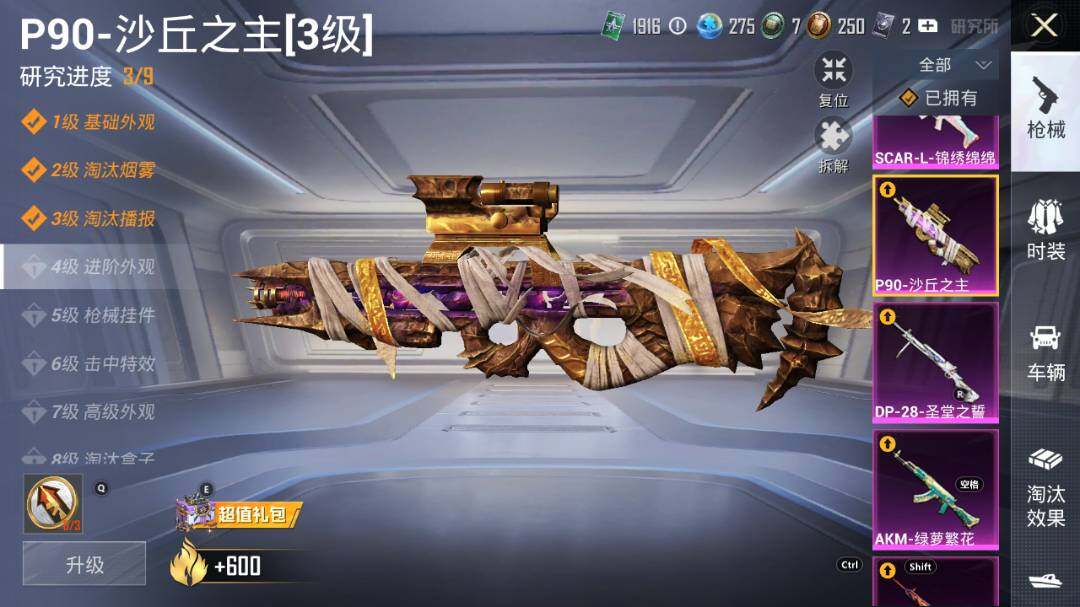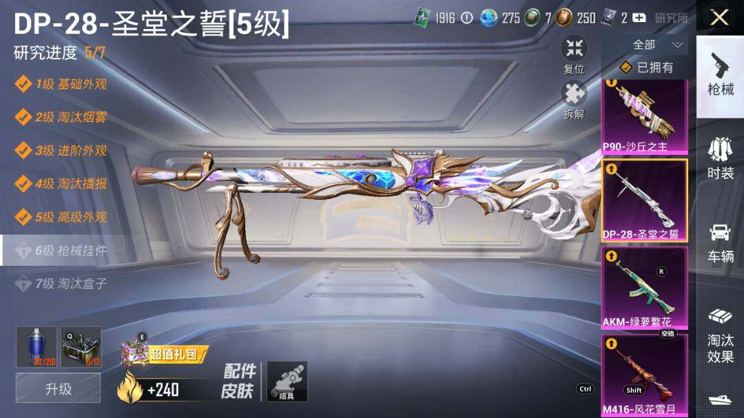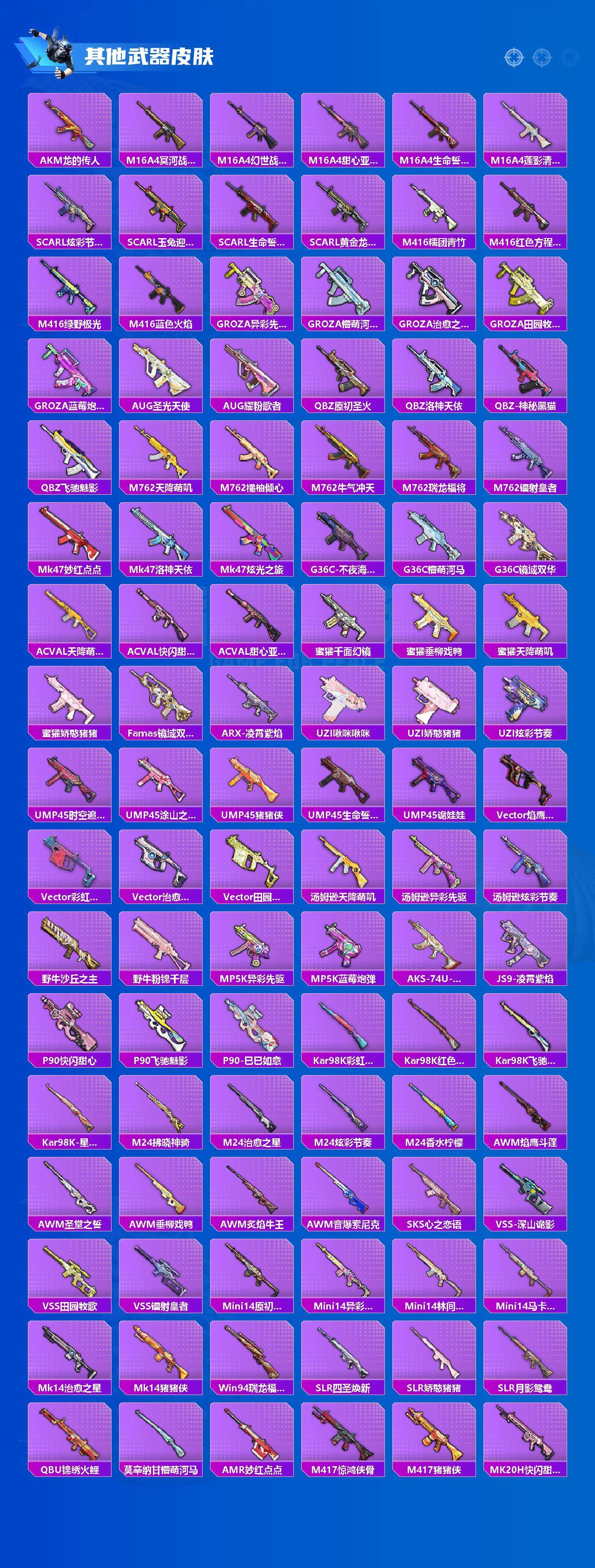 【粉色枪皮等级】:AKM-绿萝繁花(五级),SCAR-L-锦绣绵绵(五级),SCAR-L-魔童闹海 哪吒(三级),M416-风花雪月(七级),P90-沙丘之主(三级),Kar98K-巳巳如意(五级),DP-28-圣堂之誓(五级),DP-28-豹影疾电(五级)