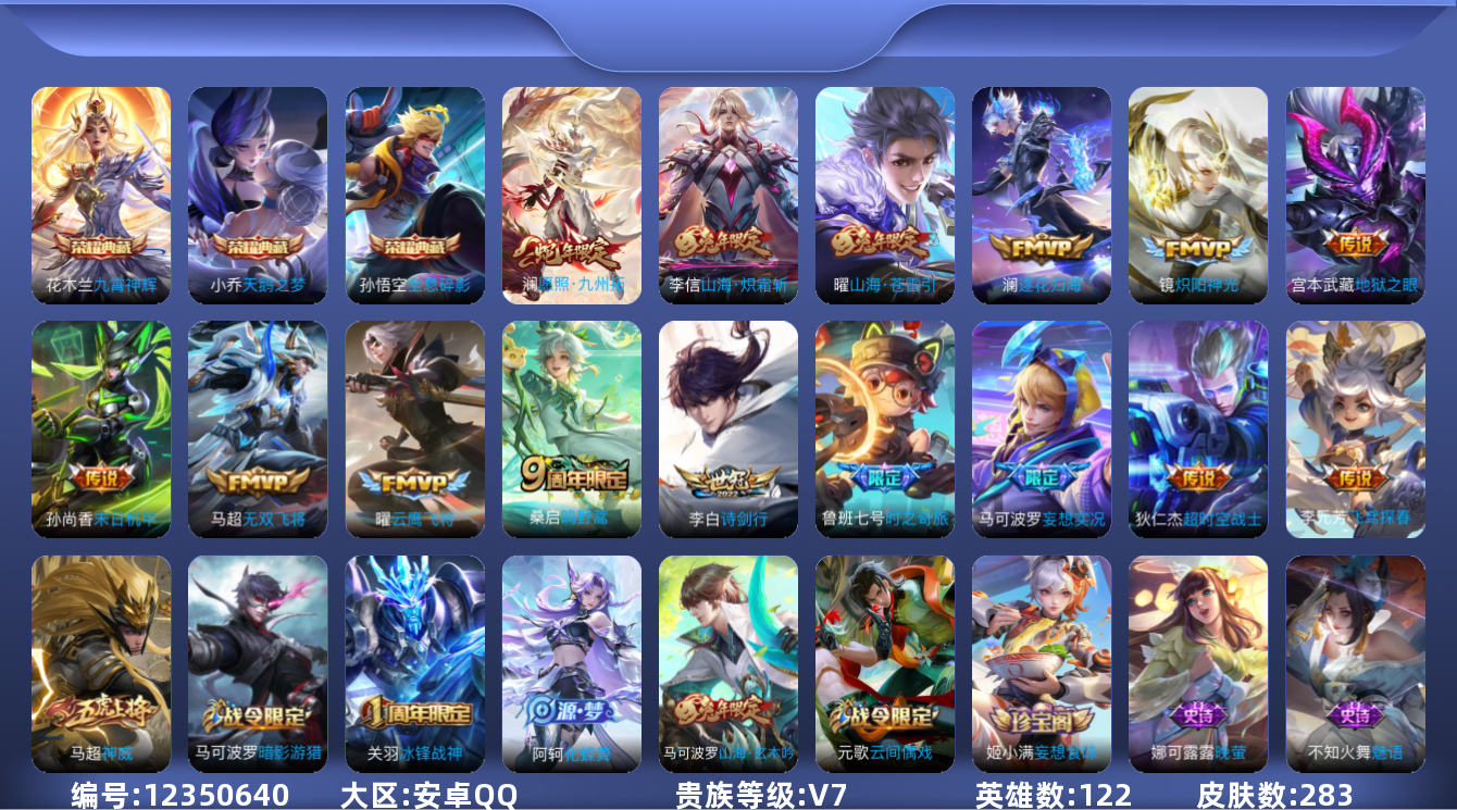 [12350640]【商品标题】:安卓Q-V7-最强王者段位-122英雄-283皮肤-3典藏-0珍品无双-0无双-0珍品传说-15传说-84史诗