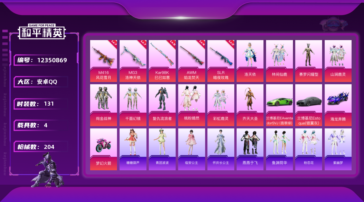 [12350869]【商品标题】:安卓 手Q-12粉装-9特效枪-4载具-9粉色飞行器-74446热力值-8王牌印记-131套装-204枪皮