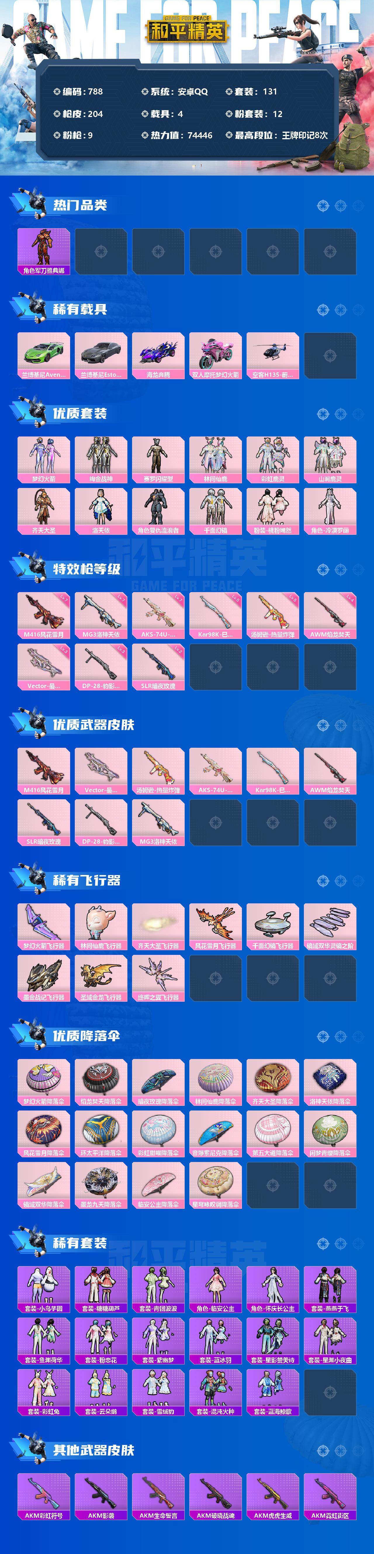 [12350869]【商品标题】:安卓 手Q-12粉装-9特效枪-4载具-9粉色飞行器-74446热力值-8王牌印记-131套装-204枪皮 【热门品类】:粉装-梦幻火箭,套装-奇异狩猎者,角色-军刀雅典娜,套装-龟仙人 【粉色载具】:兰博基尼Aventador SVJ(翡翠绿),兰博基尼Estoque(银翼灰),海龙奔腾,双人摩托-梦幻火箭,空客H135-蔚蓝之翼 【粉色套装】:粉装-梦幻火箭,粉装-绚金战神,角色-赛罗闪耀型,粉装-林间仙鹿,粉装-彩虹鹿灵,粉装-山涧鹿灵,粉装-齐天大圣,角色-洛天依,角色-复仇流浪者,粉装-千面幻镜,粉装-桃粉嫣然,角色-冷漠罗丽 【粉色枪皮等级】:M416-风花雪月(七级),Vector-最终圣卫者(三级),汤姆逊-热量炸弹(五级),AKS-74U-星穹咏叹调(七级),Kar98K-巳巳如意(五级),AWM-焰龙焚天(四级),SLR-暗夜玫瑰(二级),DP-28-豹影疾电(三级),MG3-洛神天依(七级) 【粉色枪皮】:M416-风花雪月,Vector-最终圣卫者,汤姆逊-热量炸弹,AKS-74U-星穹咏叹调,Kar98K-巳巳如意,AWM-焰龙焚天,SLR-暗夜玫瑰,DP-28-豹影疾电,MG3-洛神天依 【粉色飞行器】:梦幻火箭飞行器,林间仙鹿飞行器,齐天大圣飞行器,风花雪月飞行器,千面幻镜飞行器,镜域双华-灵镜之阶,墨金战记飞行器,圣域金龙飞行器,终晖之翼飞行器 【粉色降落伞】:梦幻火箭降落伞,焰龙焚天降落伞,暗夜玫瑰降落伞,林间仙鹿降落伞,齐天大圣降落伞,洛神天依降落伞,风花雪月降落伞,环太平洋降落伞,彩虹甜喵降落伞,音爆索尼克降落伞,第五大道降落伞,闲梦青缨降落伞,镜域双华降落伞,墨龙九天降落伞,临安公主降落伞,星穹咏叹调降落伞 【稀有套装】:套装-龟仙人,套装-小鸟芋圆,套装-糖糖葫芦,套装-青团波波,角色-临安公主,角色-怀庆长公主,套装-燕燕于飞,套装-鱼渊荷华,套装-粉恋花,套装-紫幽梦,套装-蓝冰羽,套装-星影赞美诗,套装-星渊小夜曲,套装-彩虹兔,套装-云朵鹅,套装-雪绒豹,套装-混沌火种,套装-蓝海鲸歌 【稀有枪皮】:AKM-彩虹符号,AKM-影袭,AKM-生命誓言,AKM-破晓战魂,AKM-虎虎生威,AKM-霓虹街区,M16A4-幻世战舞者,M16A4-甜心亚梦,M16A4-红色方程式,SCAR-L-暗夜玫瑰,SCA