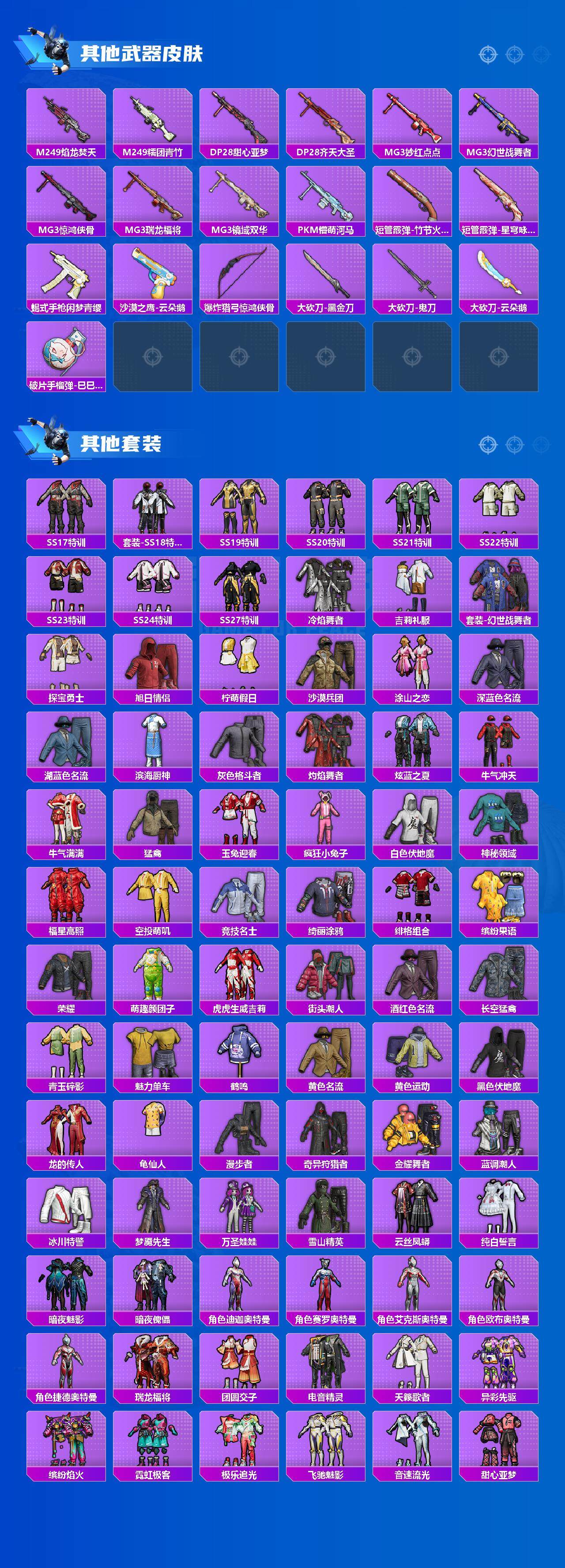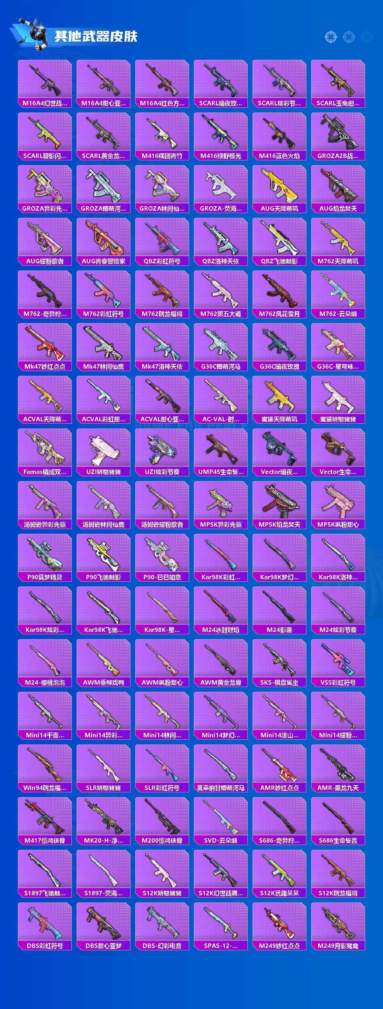 【稀有枪皮】:AKM-彩虹符号,AKM-影袭,AKM-生命誓言,AKM-破晓战魂,AKM-虎虎生威,AKM-霓虹街区,M16A4-幻世战舞者,M16A4-甜心亚梦,M16A4-红色方程式,SCAR-L-暗夜玫瑰,SCA