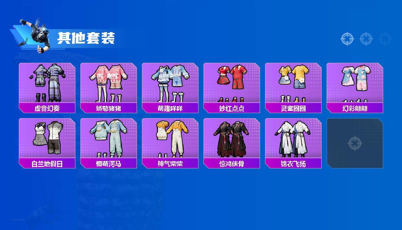 【粉色套装】:粉装-梦幻火箭,粉装-绚金战神,角色-赛罗闪耀型,粉装-林间仙鹿,粉装-彩虹鹿灵,粉装-山涧鹿灵,粉装-齐天大圣,角色-洛天依,角色-复仇流浪者,粉装-千面幻镜,粉装-桃粉嫣然,角色-冷漠罗丽