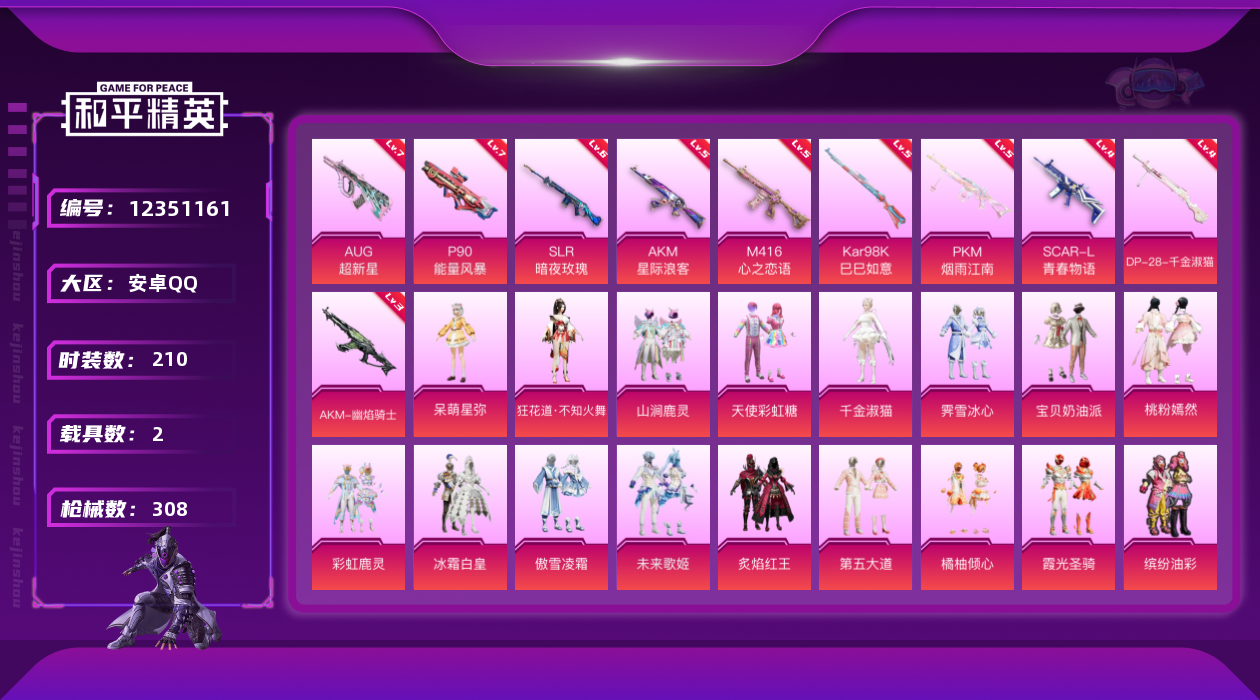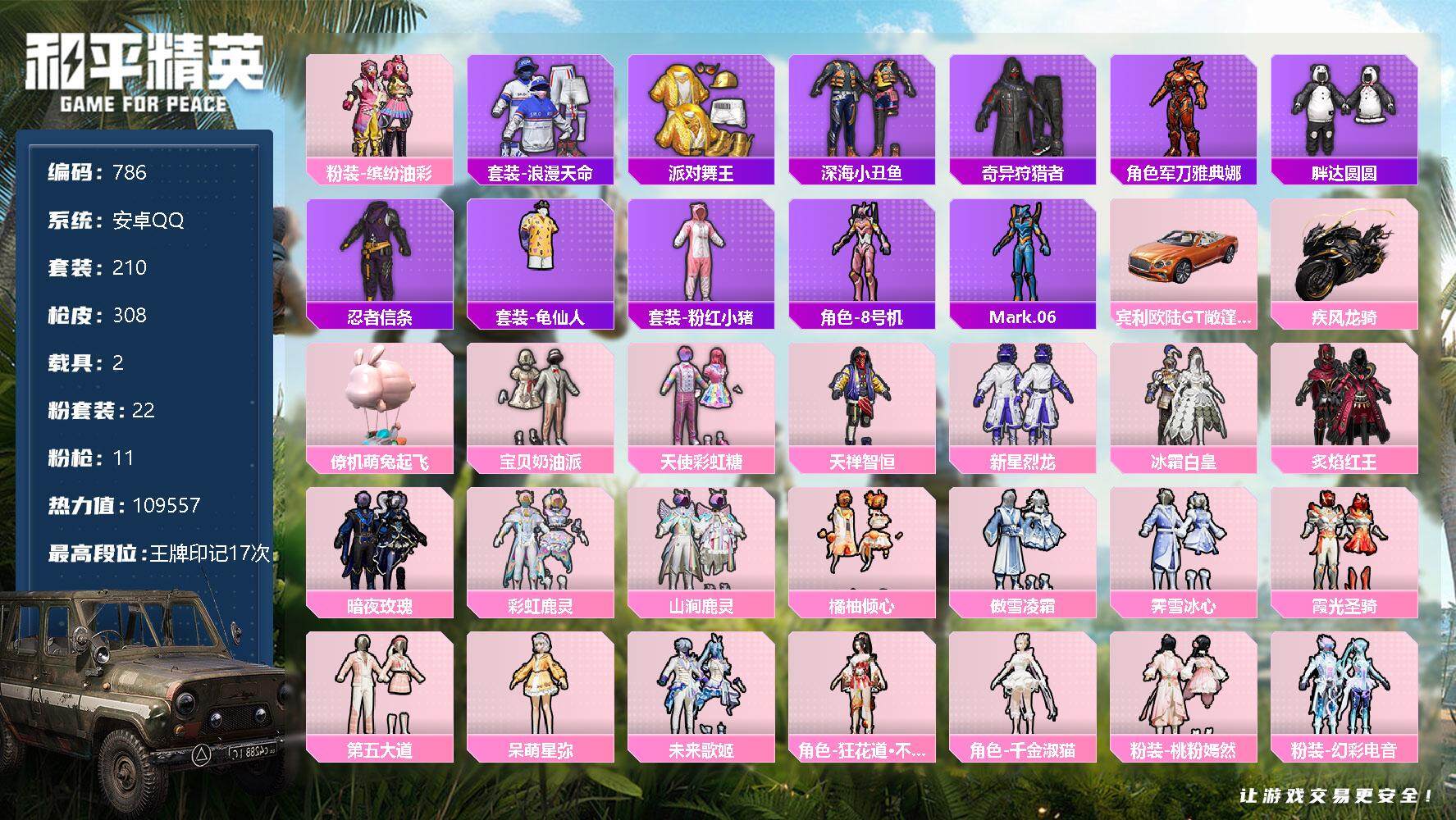 [12351161]【商品标题】:安卓 手Q-22粉装-11特效枪-2载具-13粉色飞行器-109557热力值-17王牌印记-210套装-308枪皮