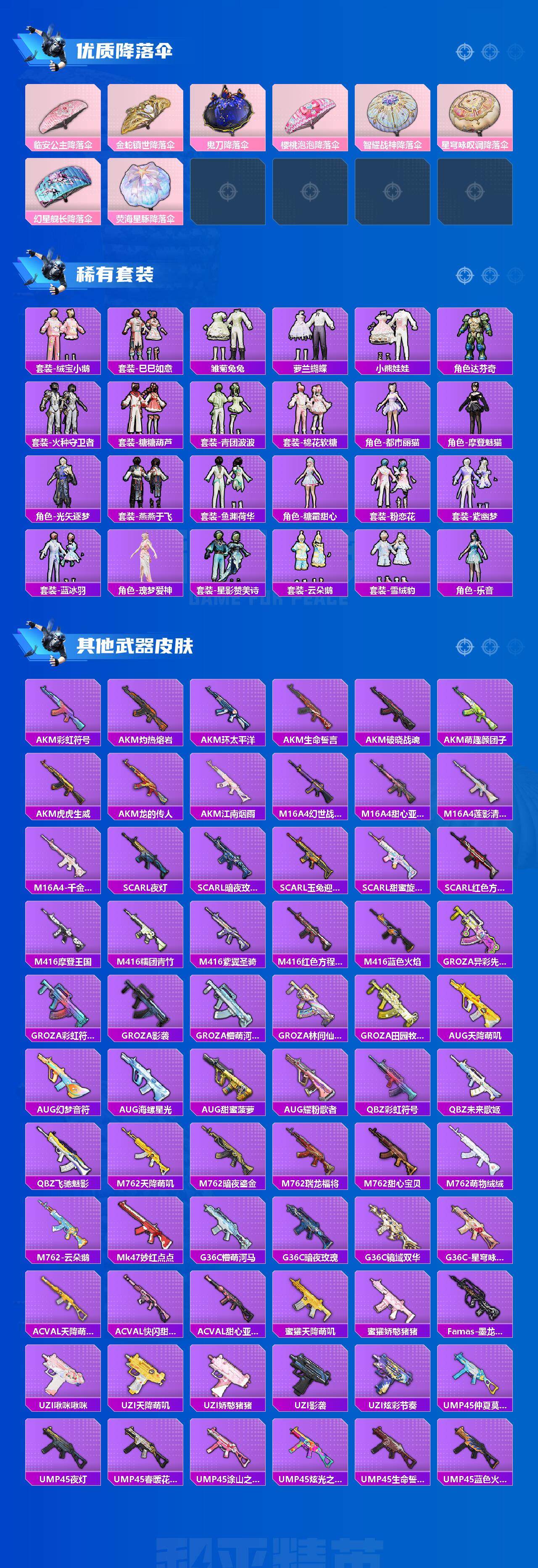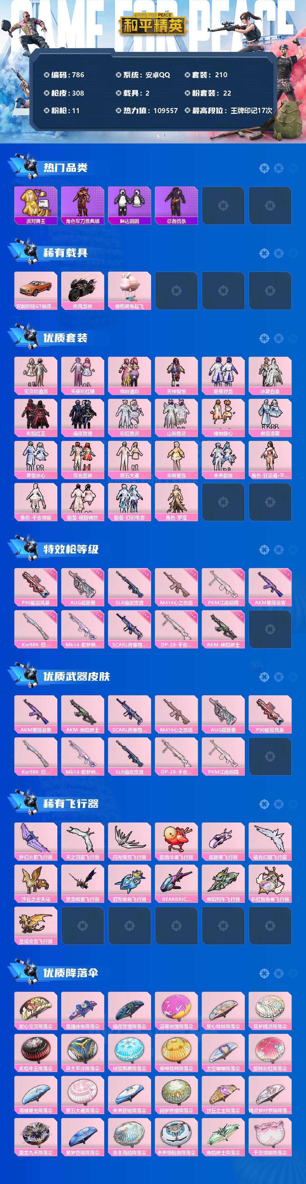 [12351161]【商品标题】:安卓 手Q-22粉装-11特效枪-2载具-13粉色飞行器-109557热力值-17王牌印记-210套装-308枪皮 【热门品类】:粉装-缤纷油彩,套装-浪漫天命,套装-派对舞王,套装-深海小丑鱼,套装-奇异狩猎者,角色-军刀雅典娜,套装-胖达圆圆,套装-忍者信条,套装-龟仙人,套装-粉红小猪,角色-8号机,角色-Mark.06 【粉色载具】:宾利欧陆GT敞篷(火焰橘),疾风龙骑,僚机-萌兔起飞 【粉色套装】:粉装-宝贝奶油派,粉装-天使彩虹糖,粉装-缤纷油彩,粉装-天禅智恒,粉装-新星烈龙,粉装-冰霜白皇,粉装-炙焰红王,粉装-暗夜玫瑰,粉装-彩虹鹿灵,粉装-山涧鹿灵,粉装-橘柚倾心,粉装-傲雪凌霜,粉装-霁雪冰心,粉装-霞光圣骑,粉装-第五大道,角色-呆萌星弥,粉装-未来歌姬,角色-狂花道·不知火舞,角色-千金淑猫,粉装-桃粉嫣然,粉装-幻彩电音,角色-罗征 【粉色枪皮等级】:AKM-星际浪客(五级),AKM-幽焰骑士(三级),SCAR-L-青春物语(四级),M416-心之恋语(五级),AUG-超新星(七级),P90-能量风暴(七级),Kar98K-巳巳如意(五级),Mk14-甜梦熊击(五级),SLR-暗夜玫瑰(六级),DP-28-千金淑猫(四级),PKM-江南烟雨(五级) 【粉色枪皮】:AKM-星际浪客,AKM-幽焰骑士,SCAR-L-青春物语,M416-心之恋语,AUG-超新星,P90-能量风暴,Kar98K-巳巳如意,Mk14-甜梦熊击,SLR-暗夜玫瑰,DP-28-千金淑猫,PKM-江南烟雨 【粉色飞行器】:梦幻火箭飞行器,天之羽翼飞行器,闪光银龙飞行器,歌者泠鸢飞行器,超新星飞行器,镜光幻境飞行翼,沙丘之主天马,繁龙极客飞行器,冠军兔兔飞行器,BEARBRICK飞行器,幽焰列车飞行器,彩虹独角兽飞行器,圣域金龙飞行器 【粉色降落伞】:甜心宝贝降落伞,童趣迷兔降落伞,暗夜玫瑰降落伞,蓝莓炮弹降落伞,甜心娃娃降落伞,筑梦精灵降落伞,炙焰牛王降落伞,环太平洋降落伞,绒雪飘舞降落伞,垂柳戏鸭降落伞,太空嘟嘟降落伞,旋转彩虹降落伞,海螺星光降落伞,第五大道降落伞,未来歌姬降落伞,闲梦青缨降落伞,沙丘之主降落伞,精灵梦叶罗丽降落伞,墨龙九天降落伞,星梦奇缘降落伞,金丰海韵降落伞,未来领航者降落伞,幽焰骑士降落伞,千金淑猫降落伞,临安公主降落伞,金蛇镇