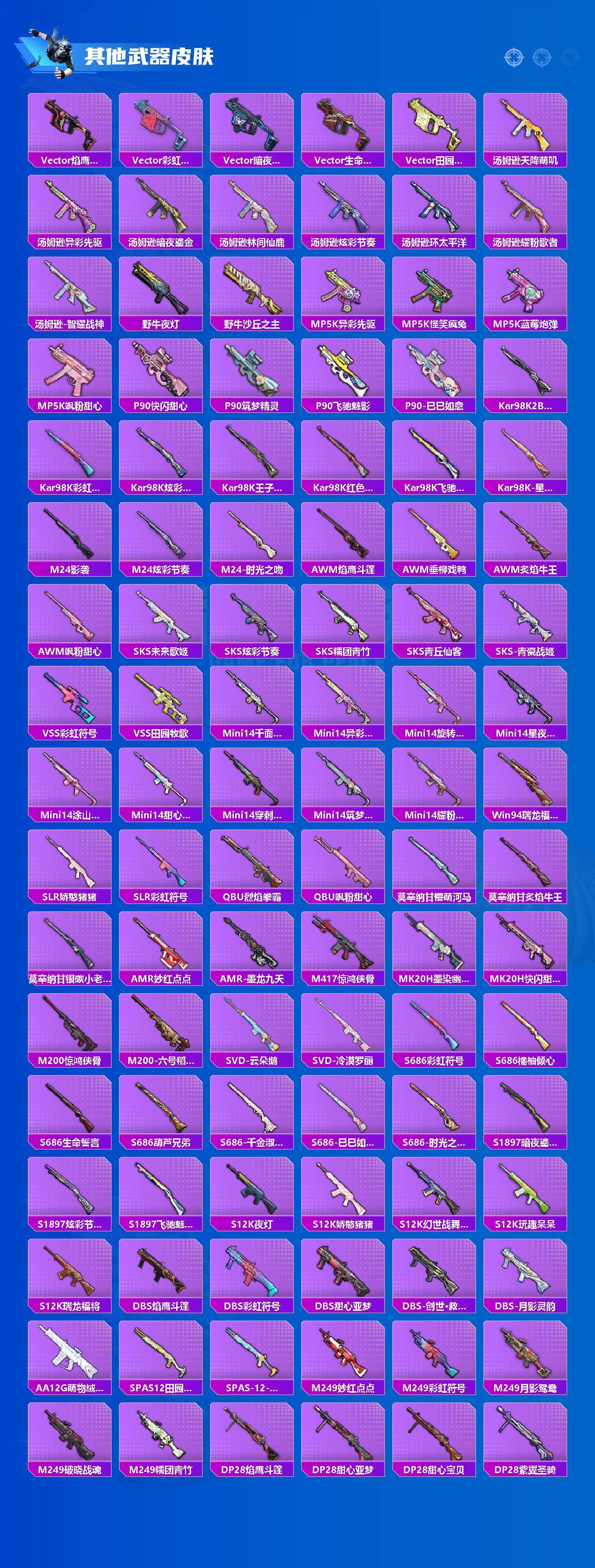 【粉色枪皮】:AKM-星际浪客,AKM-幽焰骑士,SCAR-L-青春物语,M416-心之恋语,AUG-超新星,P90-能量风暴,Kar98K-巳巳如意,Mk14-甜梦熊击,SLR-暗夜玫瑰,DP-28-千金淑猫,PKM-江南烟雨