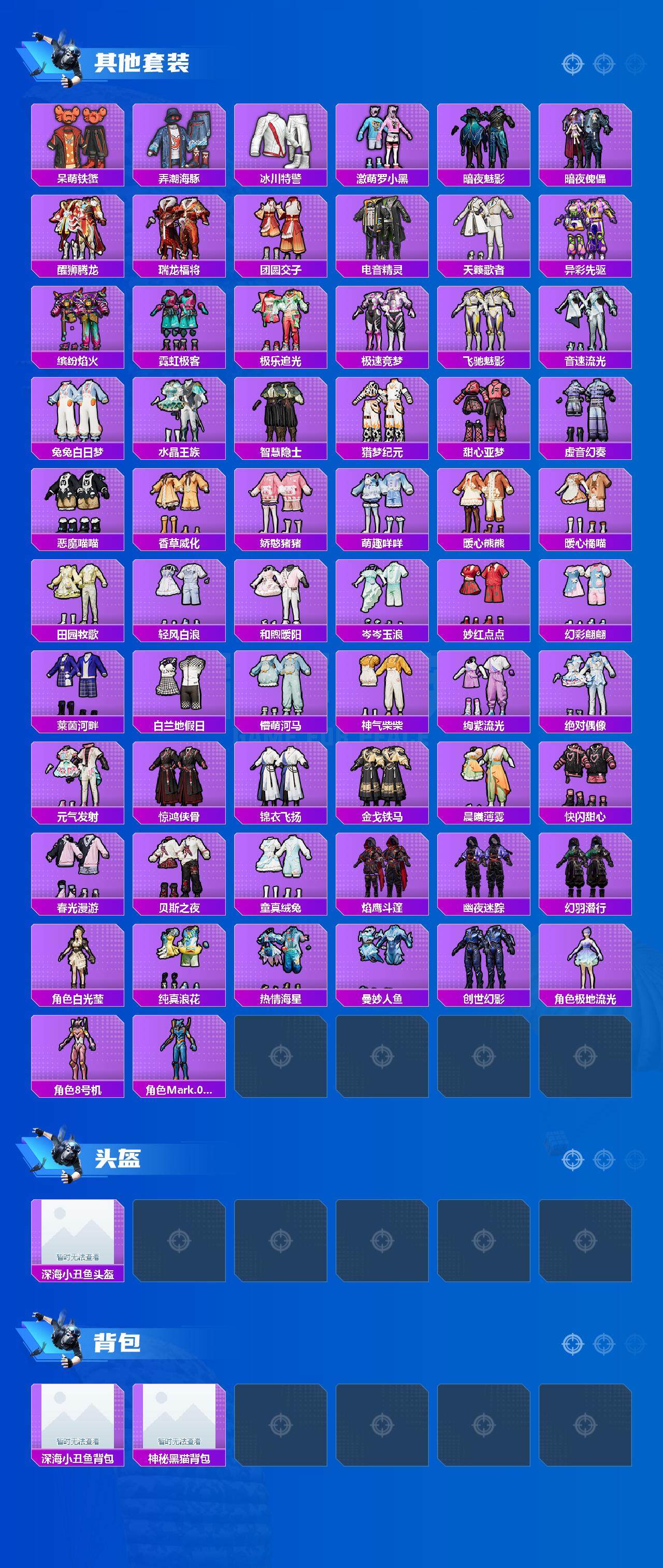 【热门品类】:粉装-缤纷油彩,套装-浪漫天命,套装-派对舞王,套装-深海小丑鱼,套装-奇异狩猎者,角色-军刀雅典娜,套装-胖达圆圆,套装-忍者信条,套装-龟仙人,套装-粉红小猪,角色-8号机,角色-Mark.06