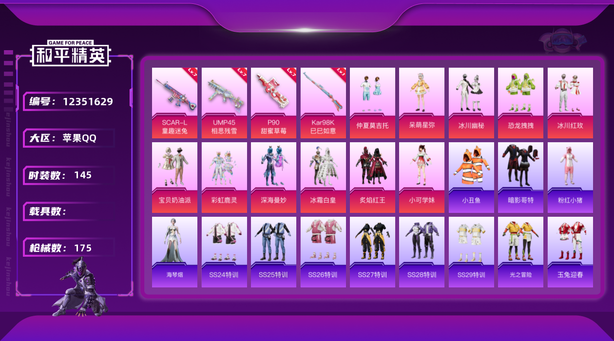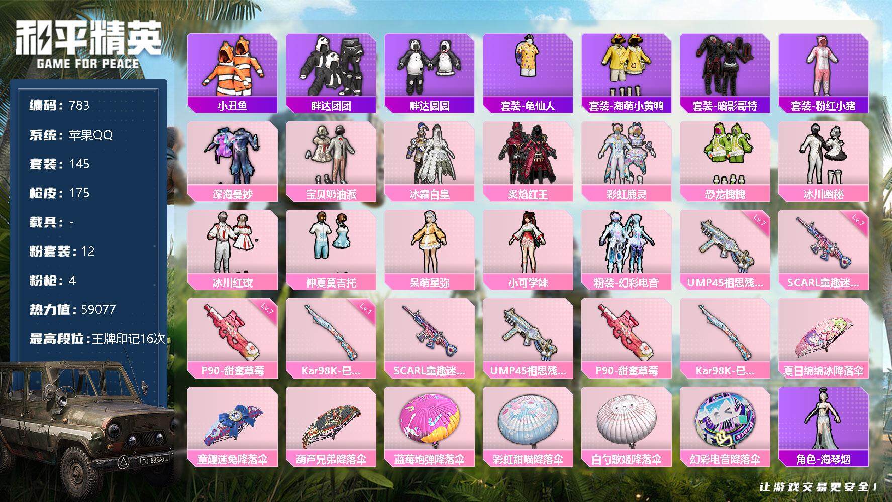 [12351629]【商品标题】:苹果 手Q-12粉装-4特效枪-0载具-0粉色飞行器-59077热力值-16王牌印记-145套装-175枪皮